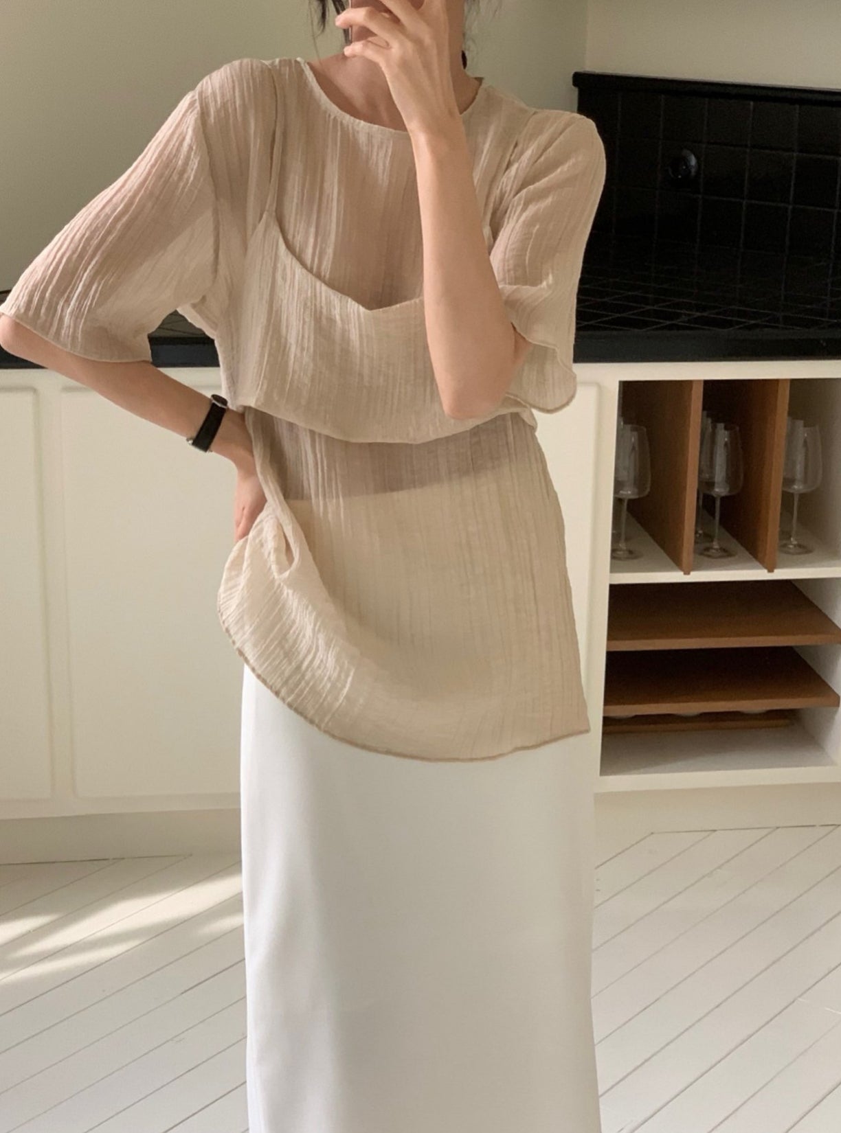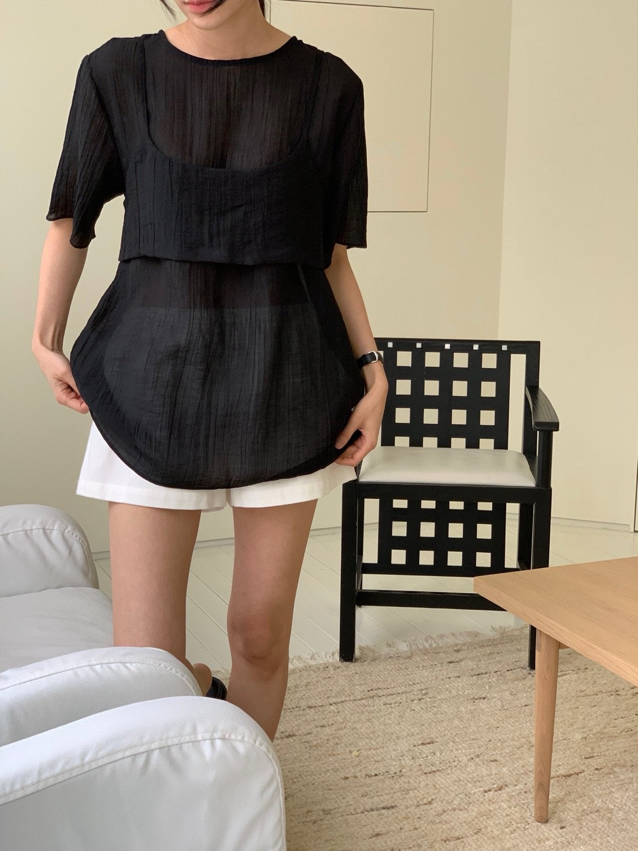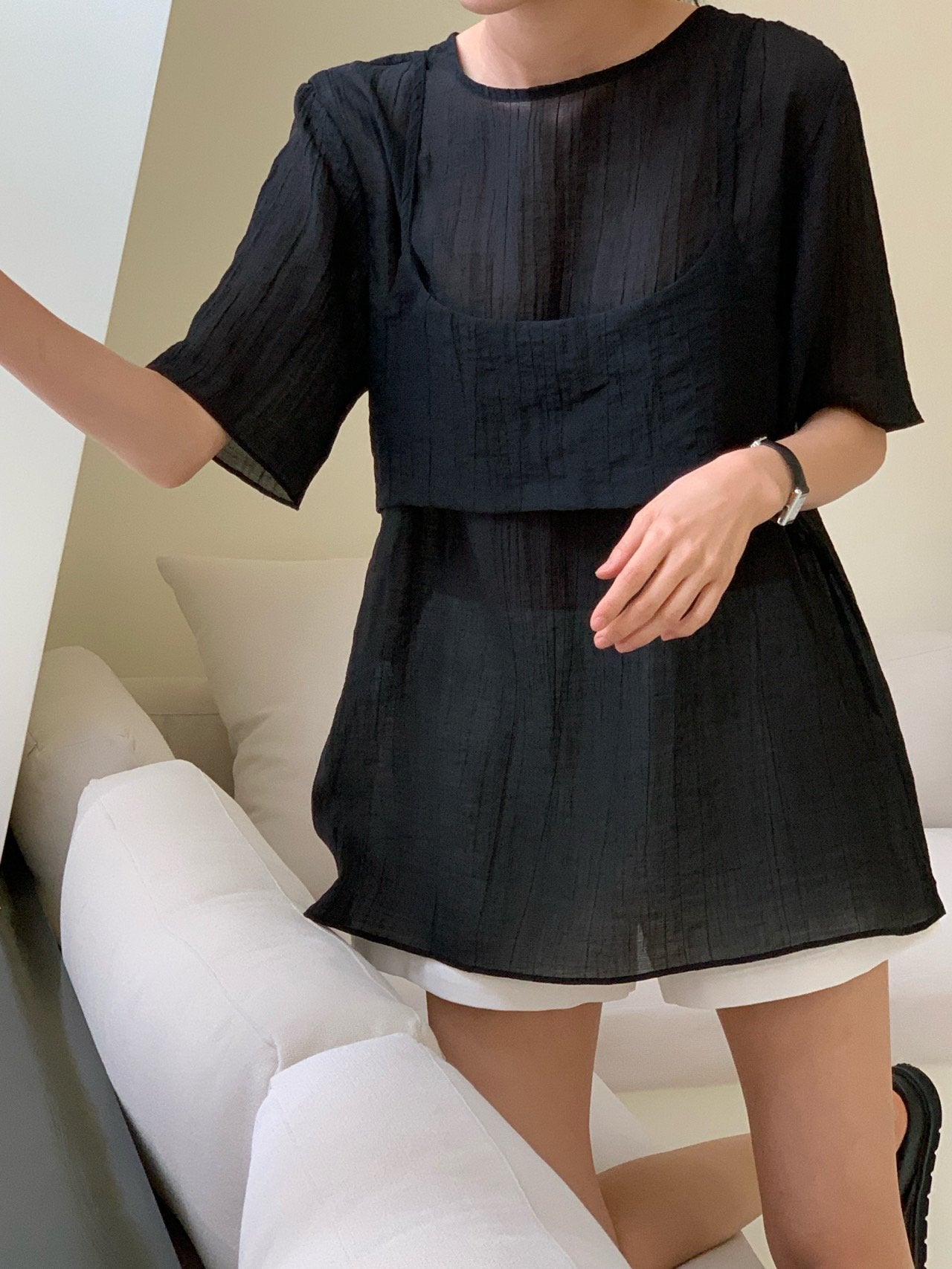 【F60382】實拍夏季法式兩件套|翻領短袖上衣+吊帶背心套組250512
