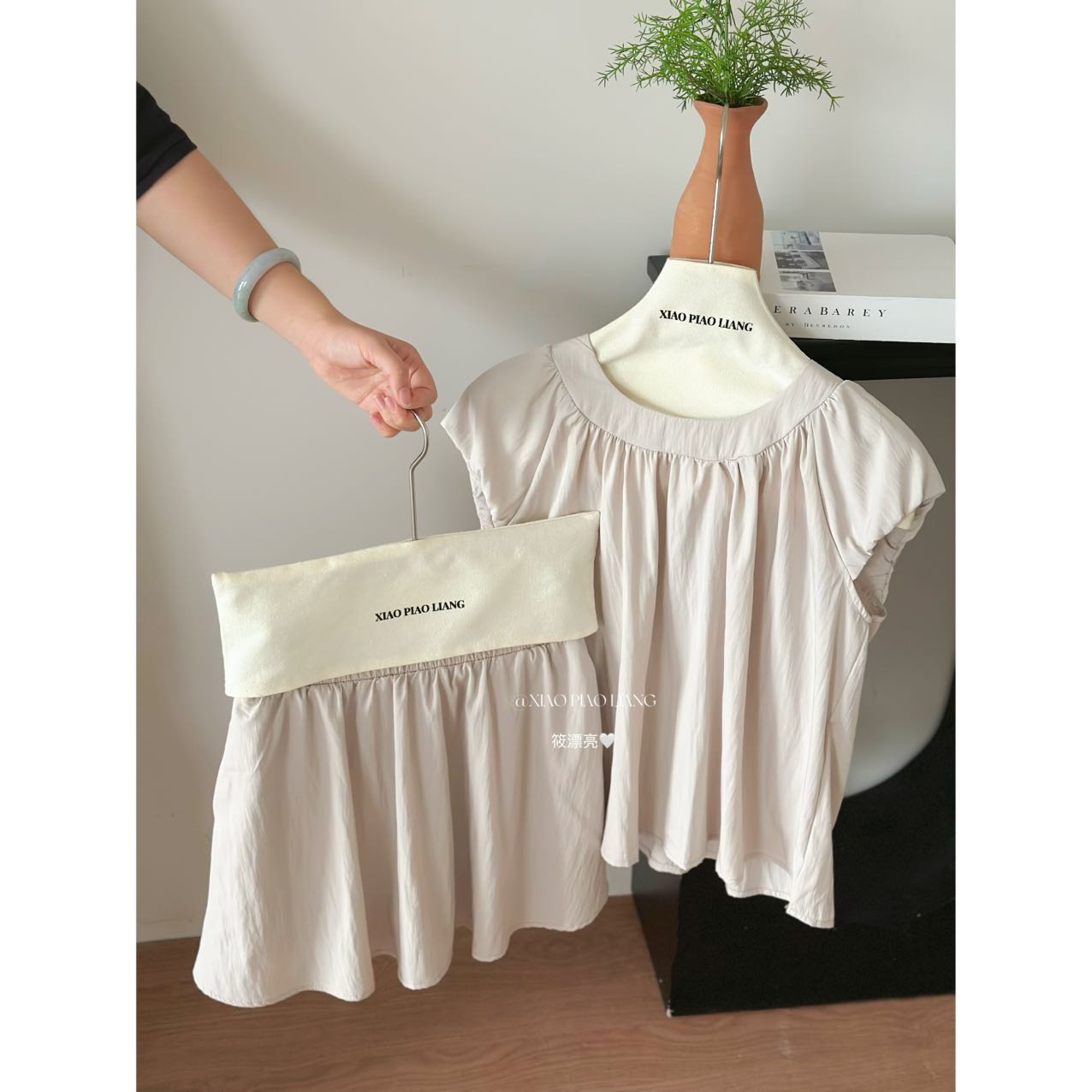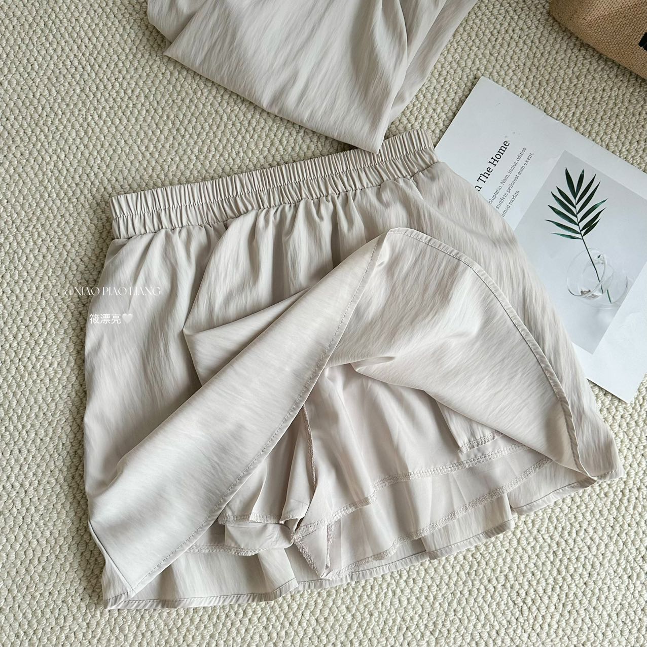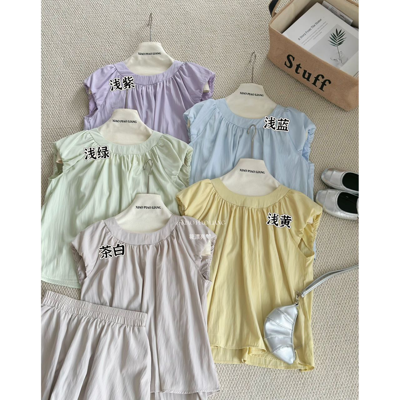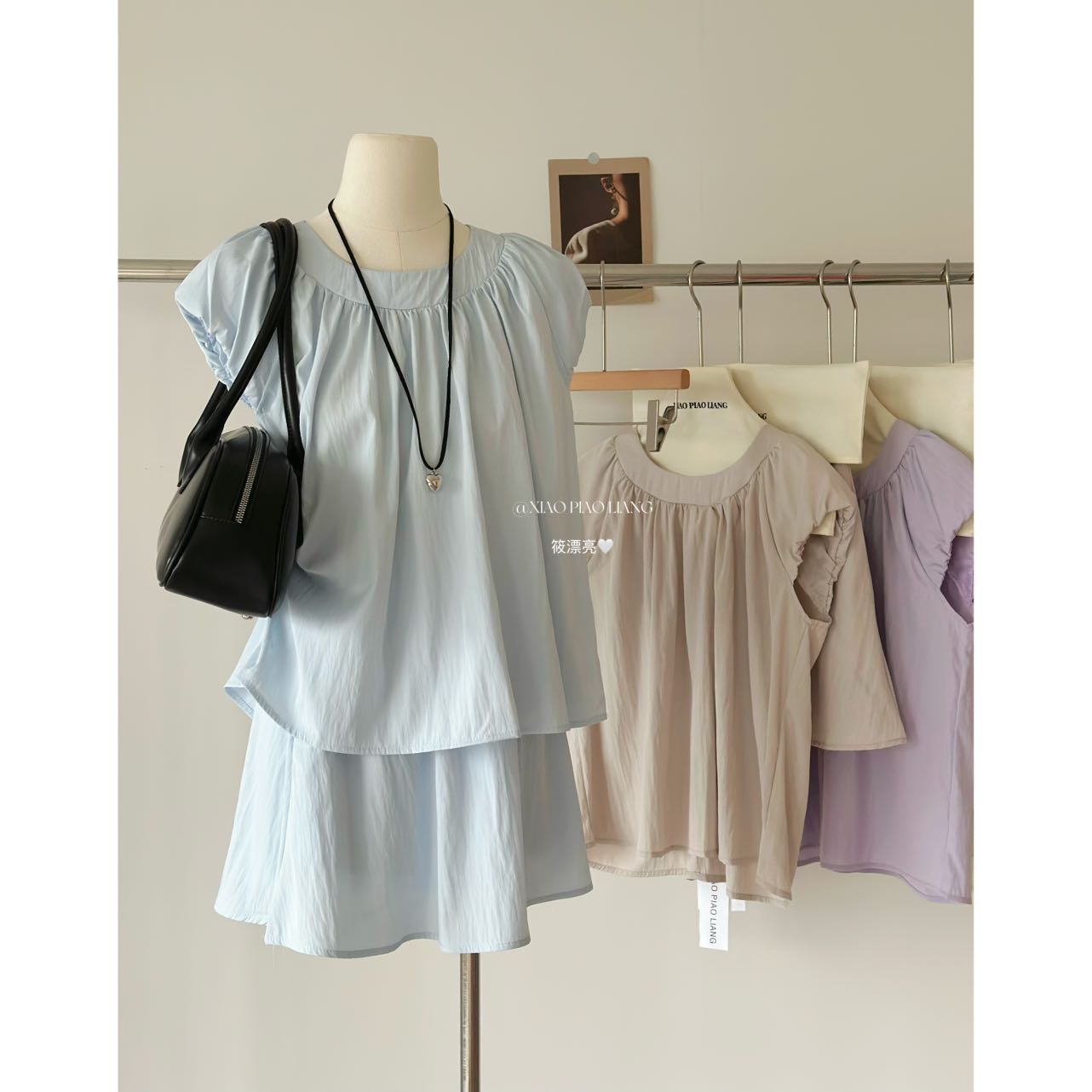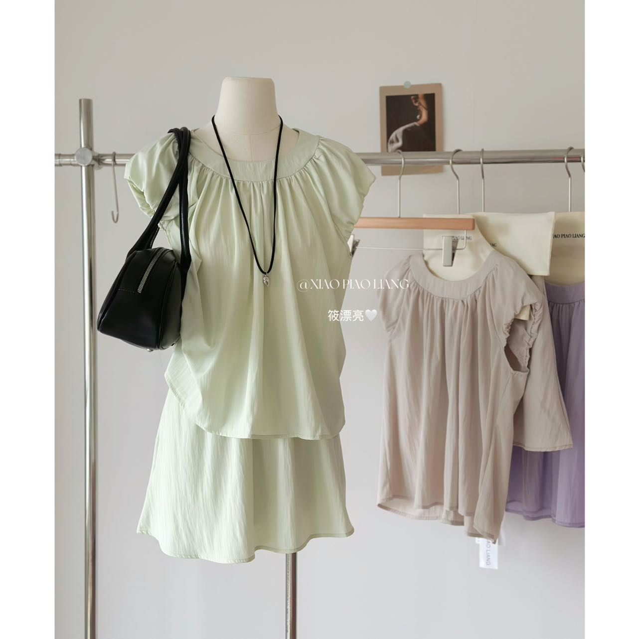 【F60458】實拍極簡舒適個性小飛袖上衣(小墊肩)+鬆緊腰短裙250609