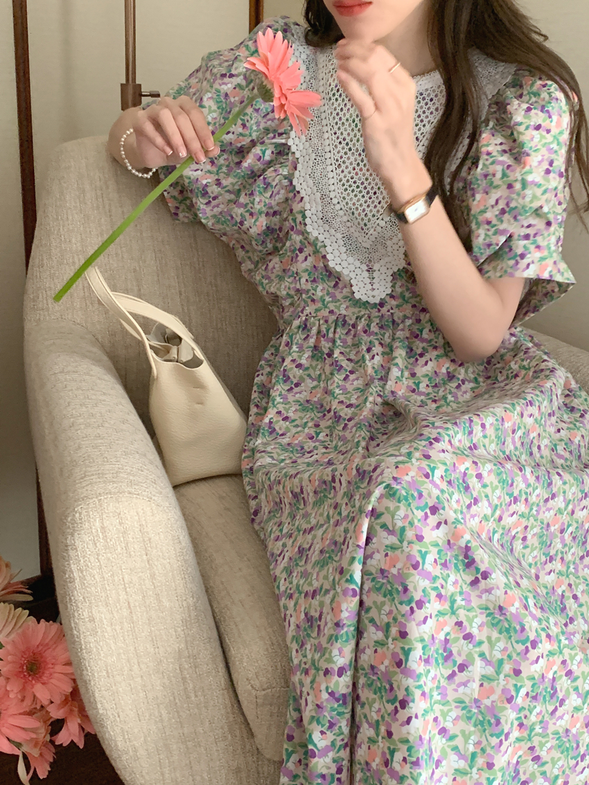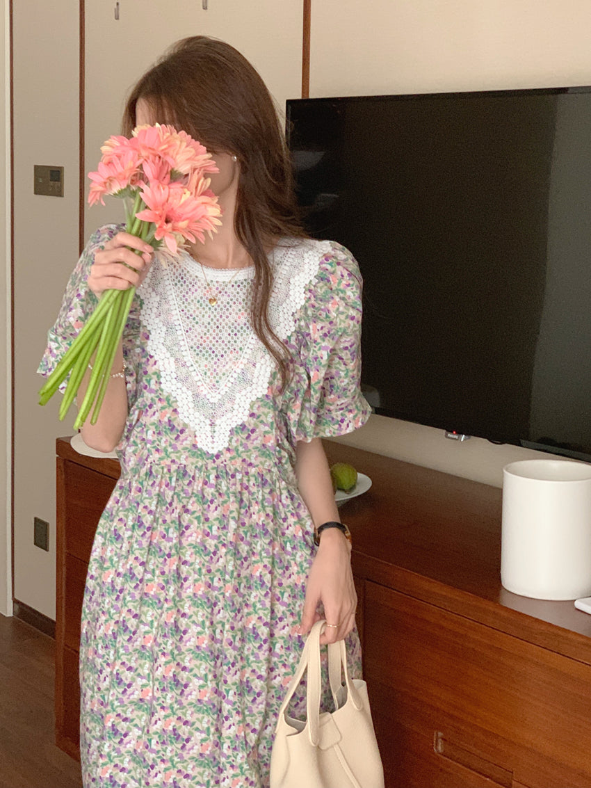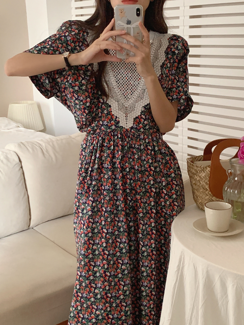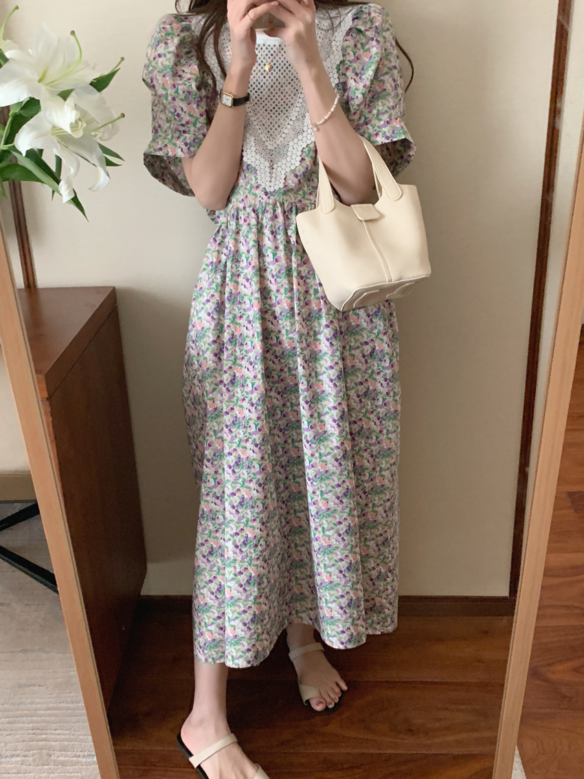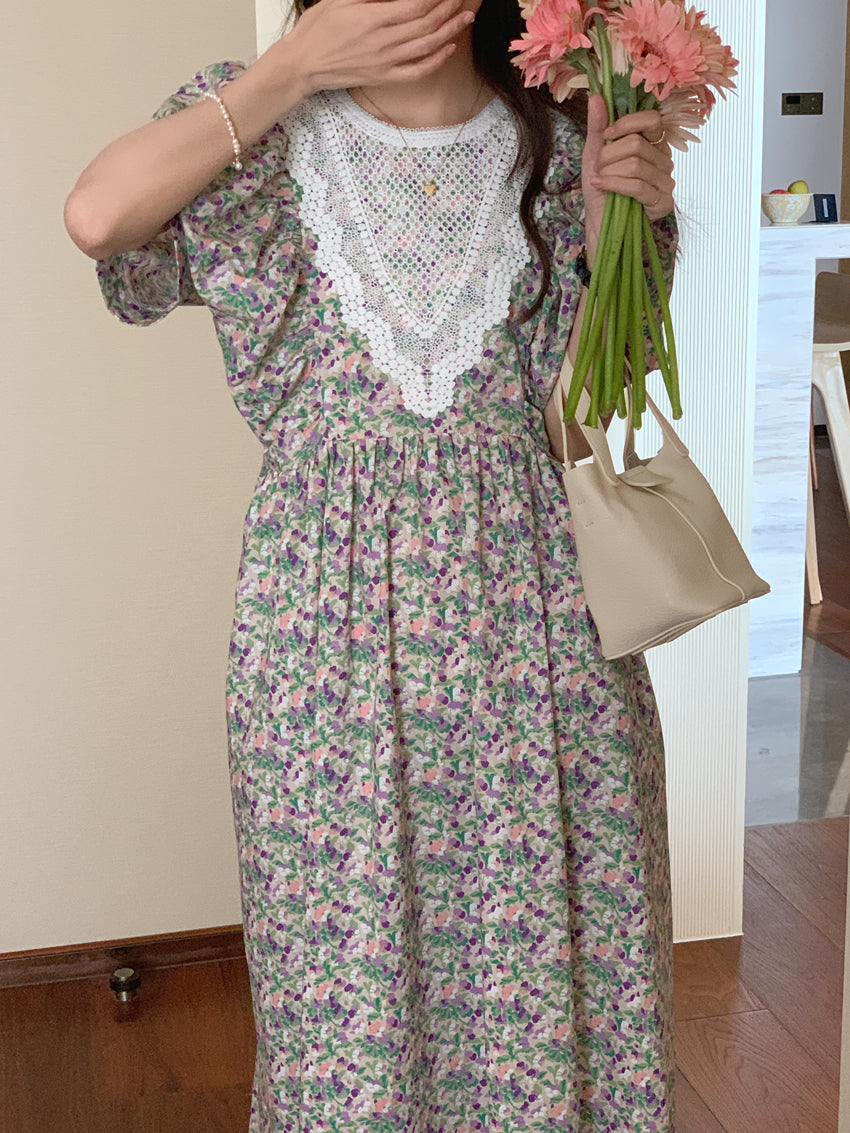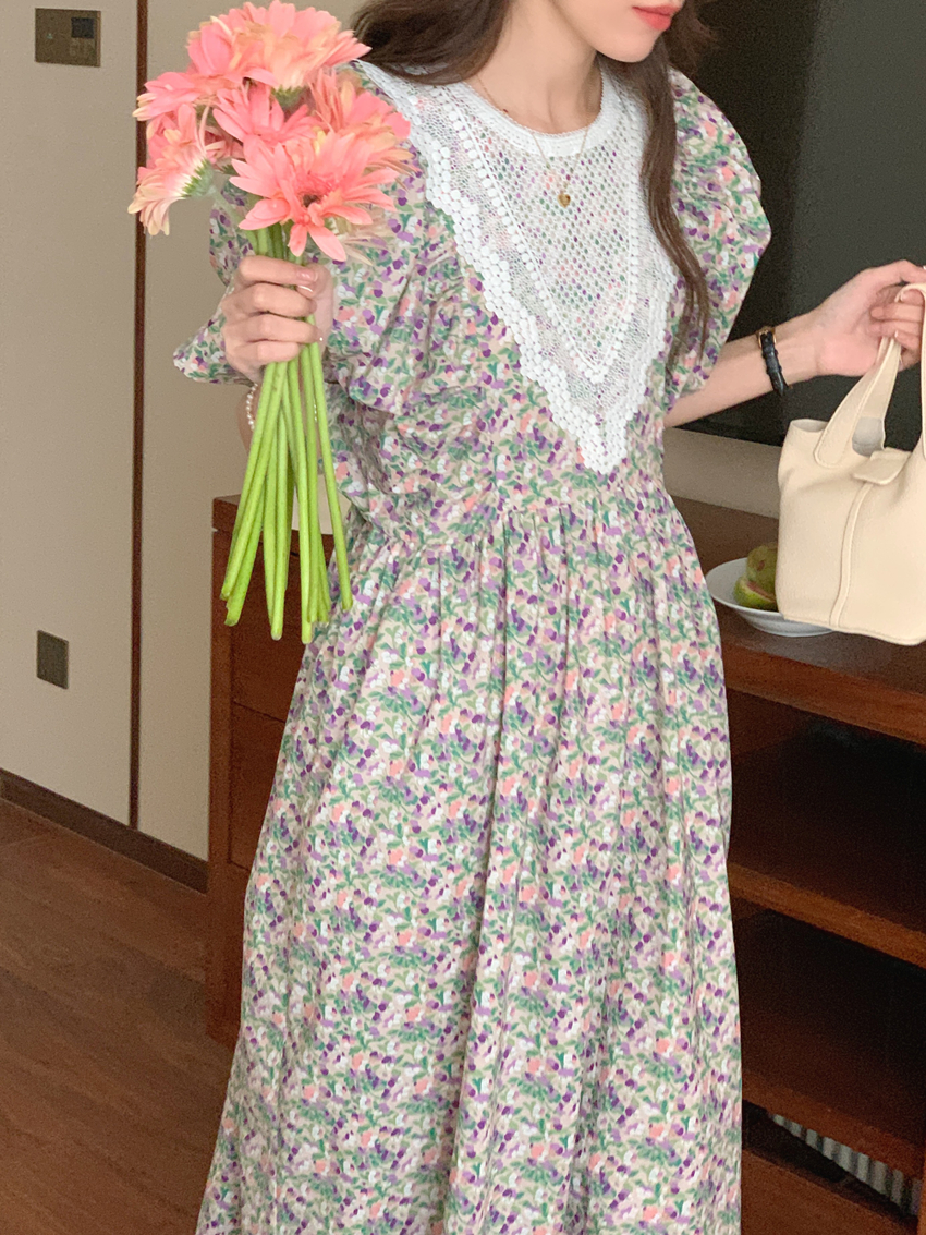 【F60562】氣質溫柔白月光🕊️復古泡泡袖花邊領拼接寬鬆長版連身洋裝260413