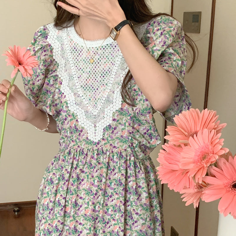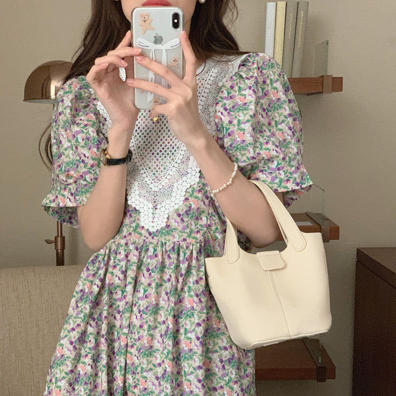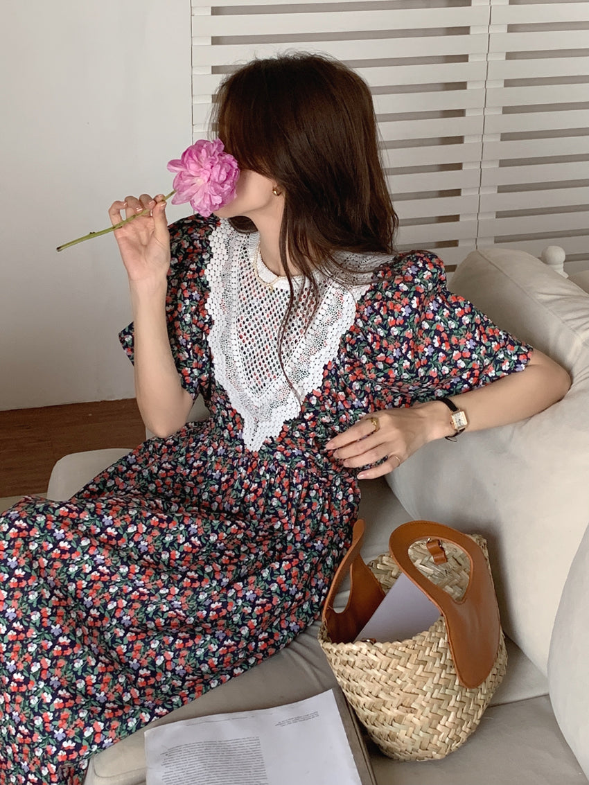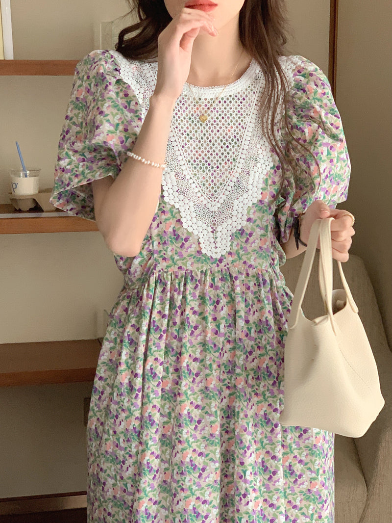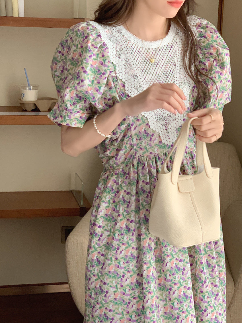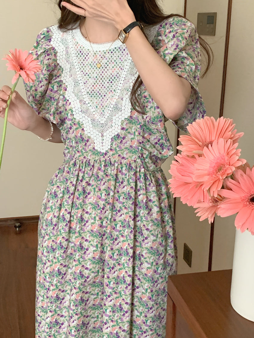 【F60562】氣質溫柔白月光🕊️復古泡泡袖花邊領拼接寬鬆長版連身洋裝260413