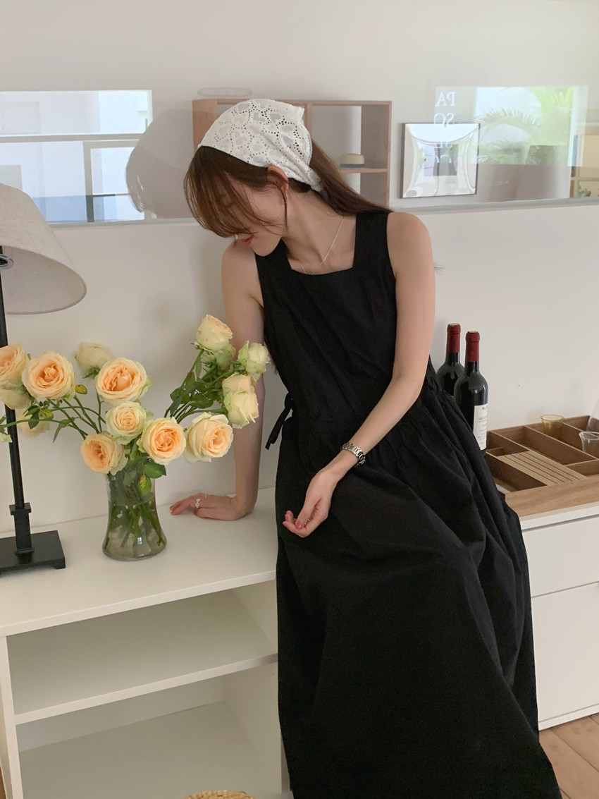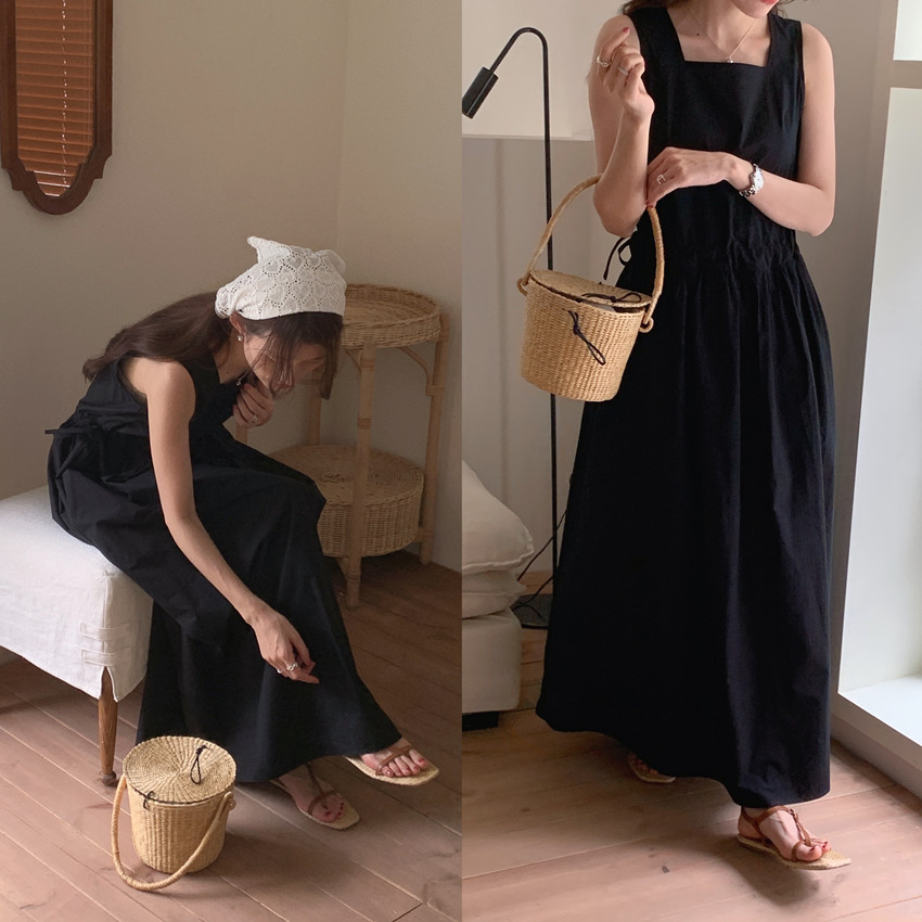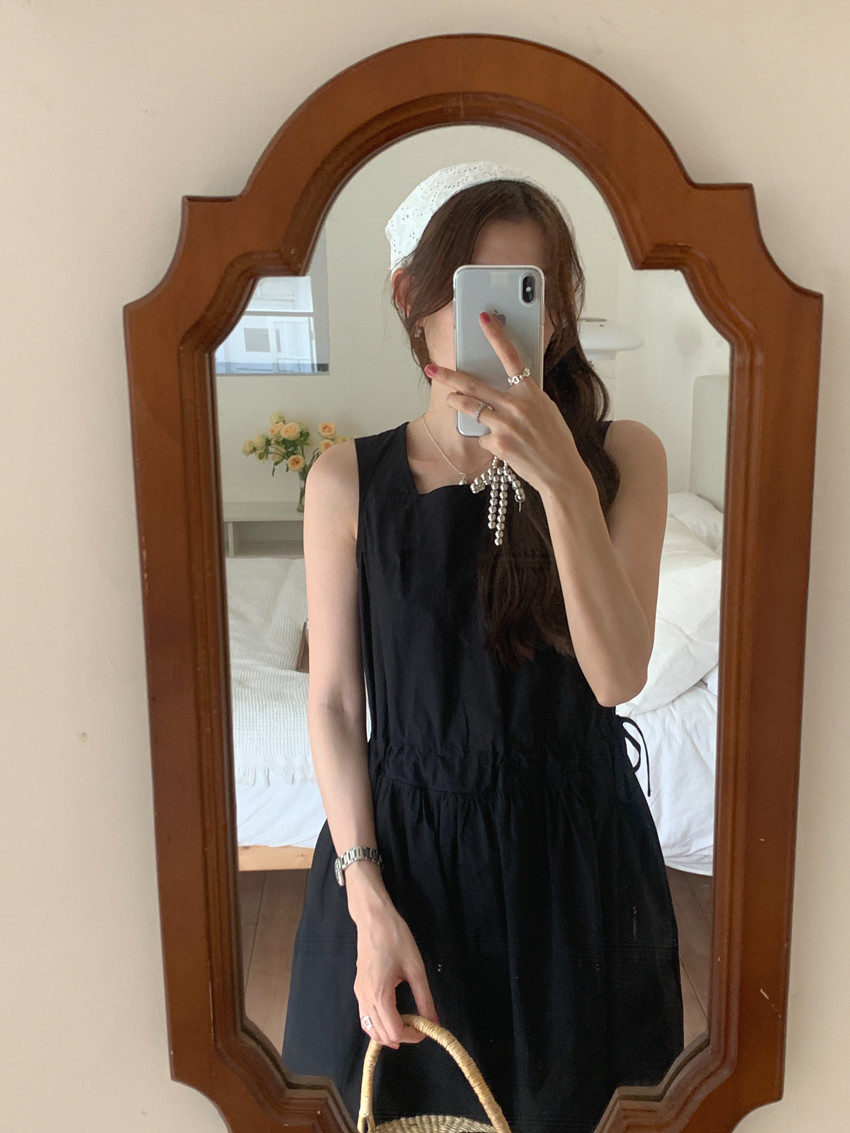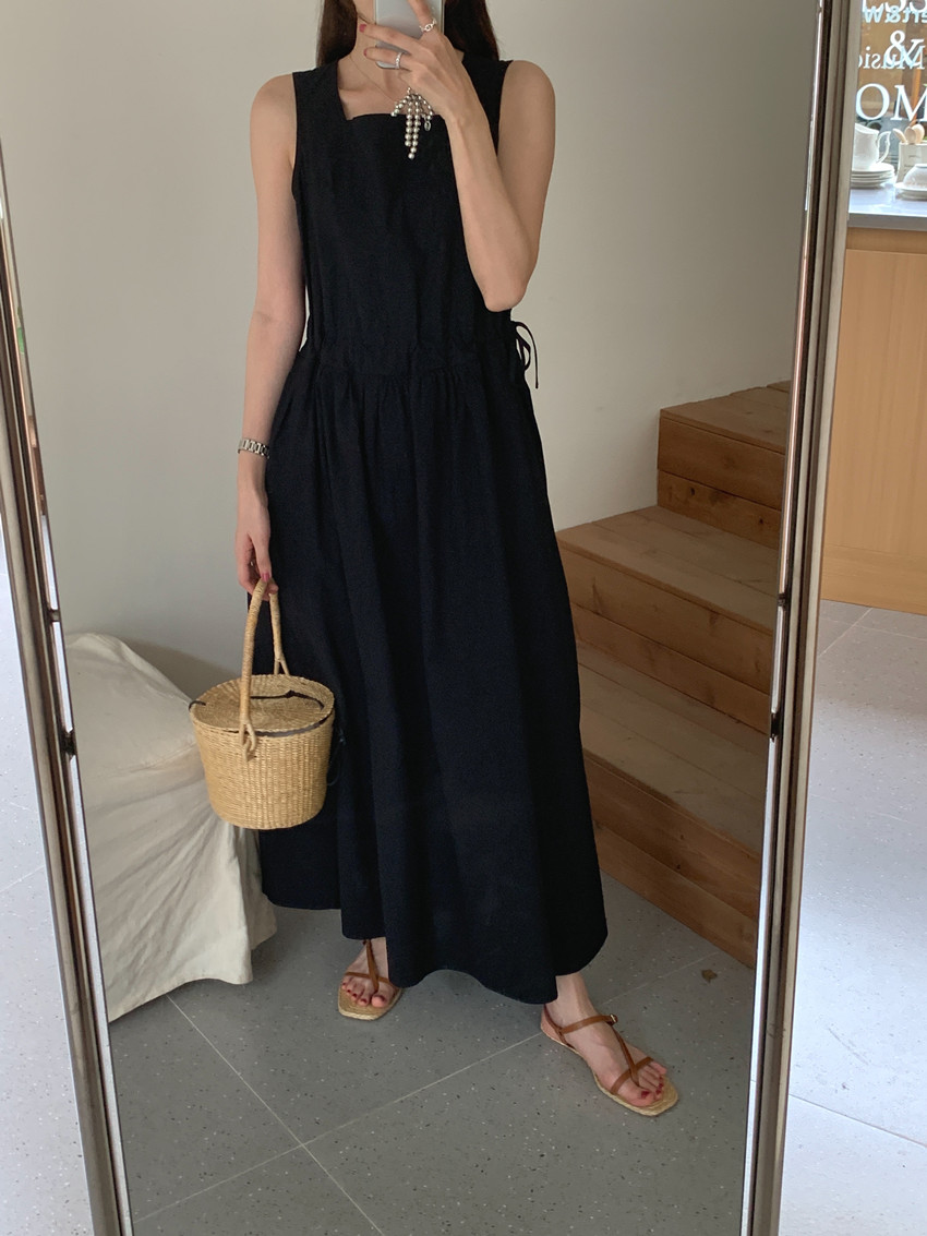 【F60563】法式慵懶度假風🌴小眾復古抽繩設計無袖背心寬鬆長版洋裝260413