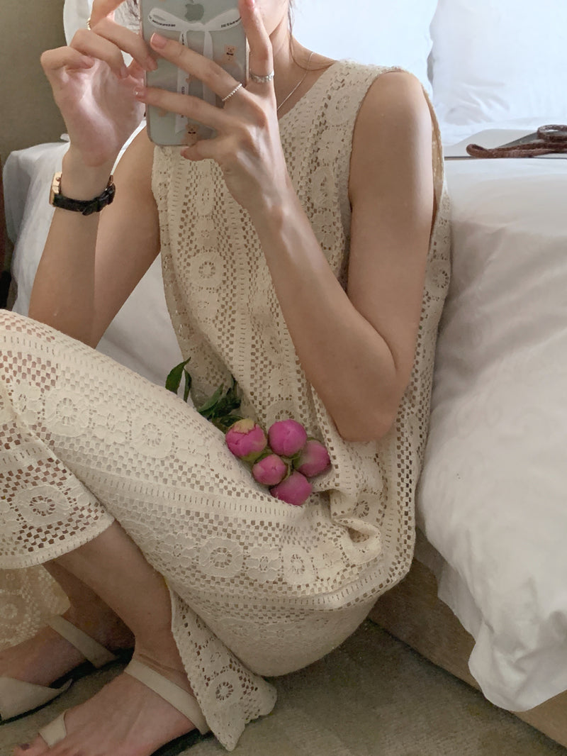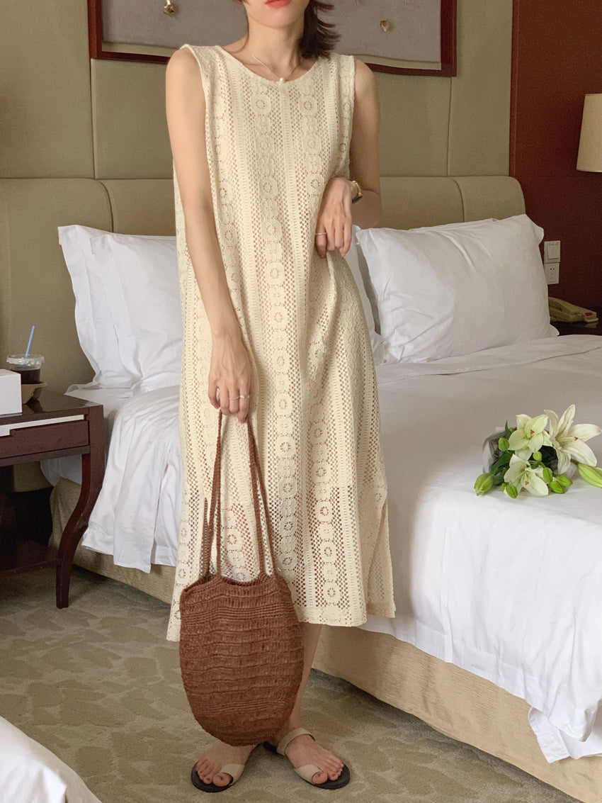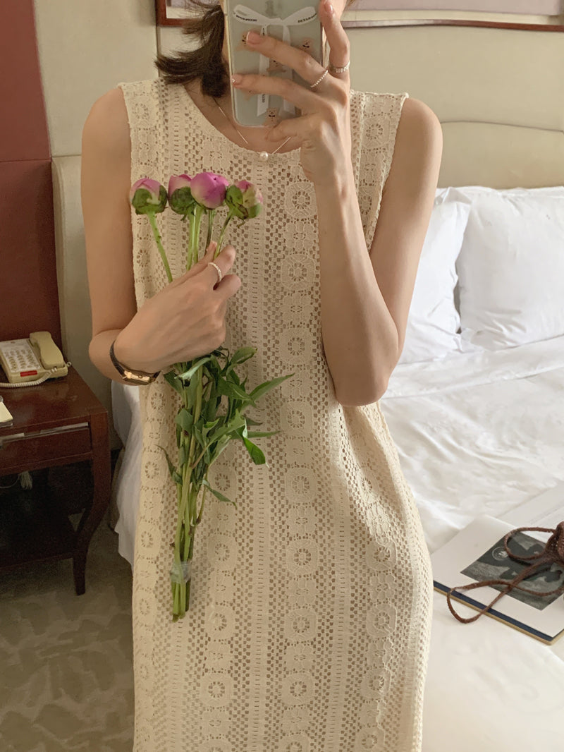【F7299】實拍韓版溫柔氣質 精緻鉤花鏤空蕾絲背心洋裝-夏季長銷