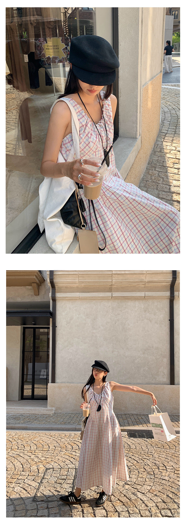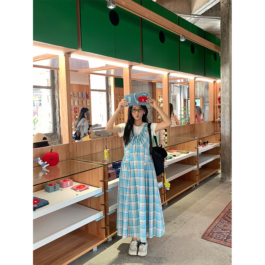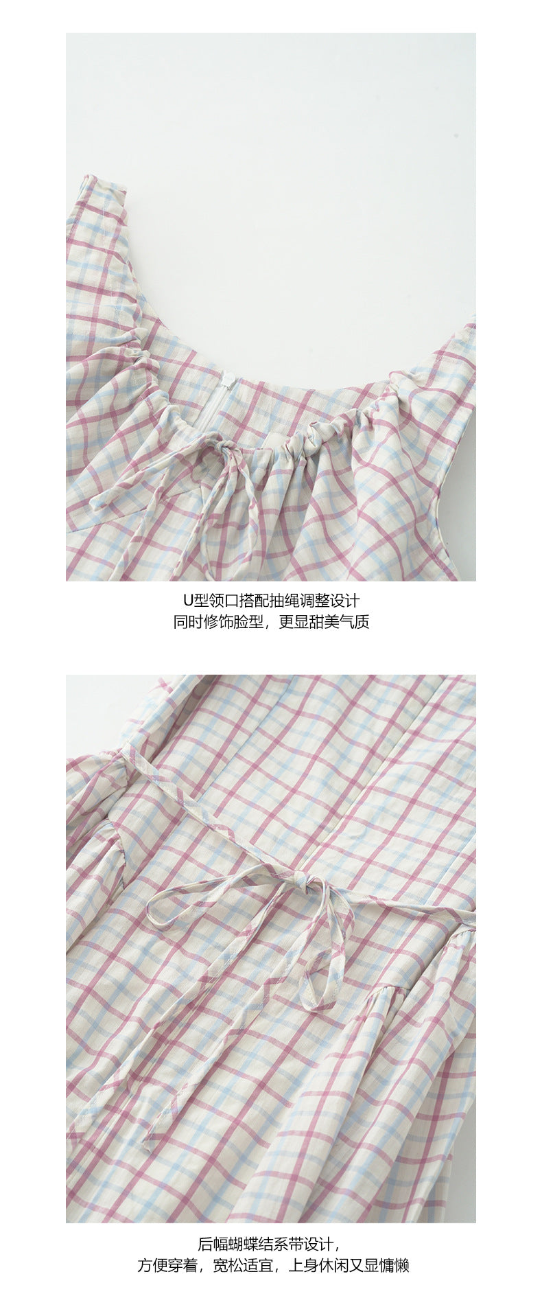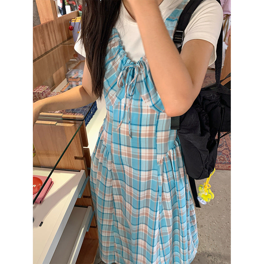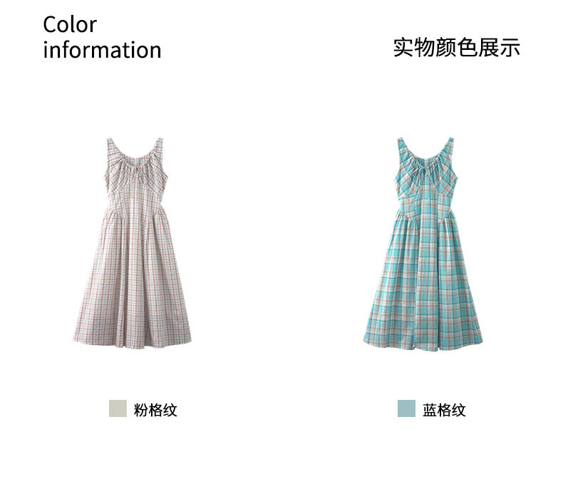 【H5228】實拍夏季清新甜美|格紋抽繩褶皺無袖連身裙250429