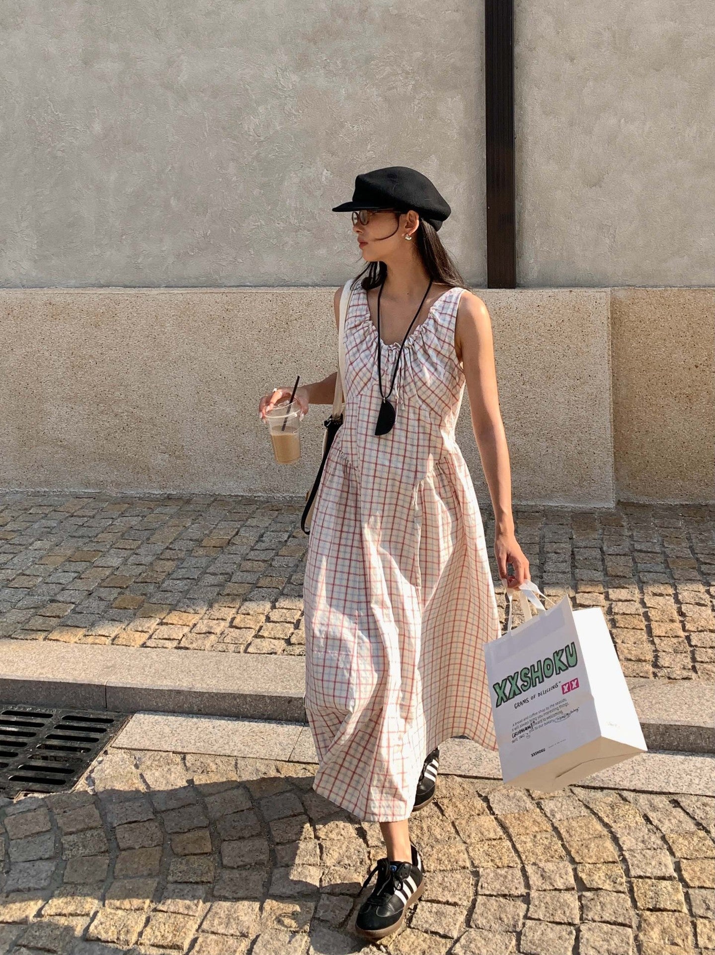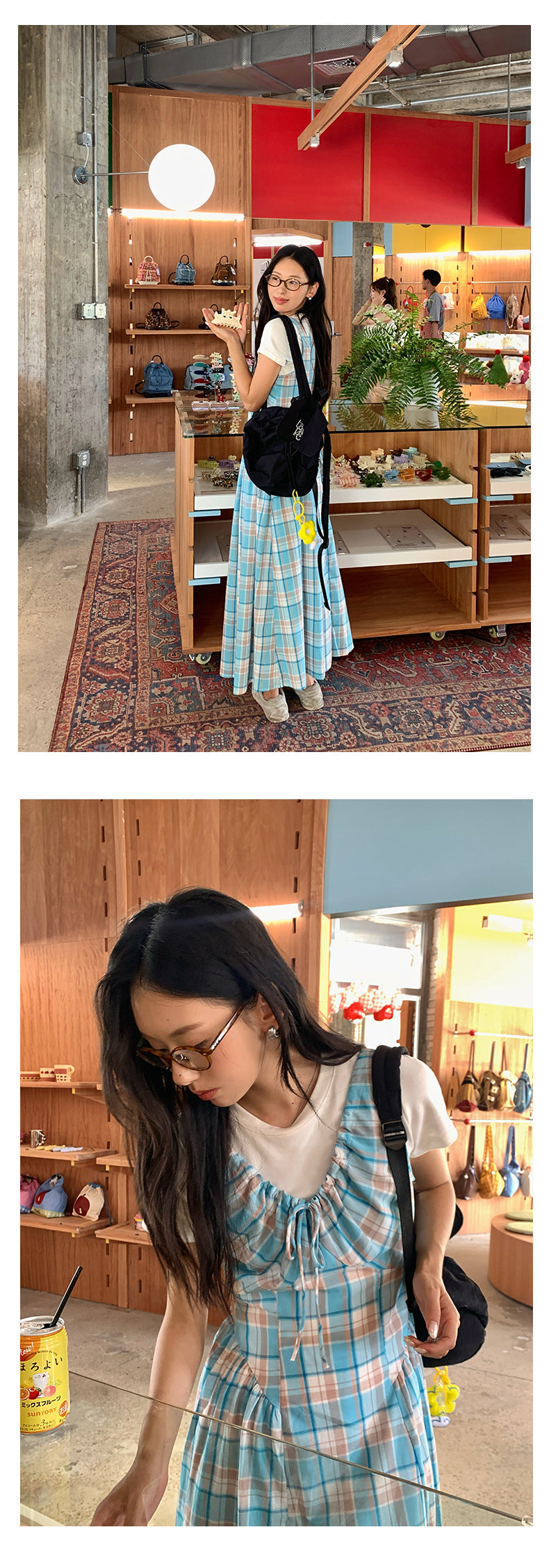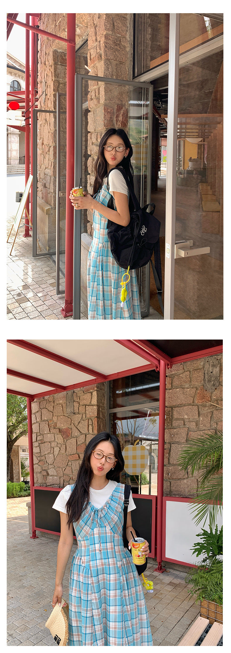 【H5228】實拍夏季清新甜美|格紋抽繩褶皺無袖連身裙250429