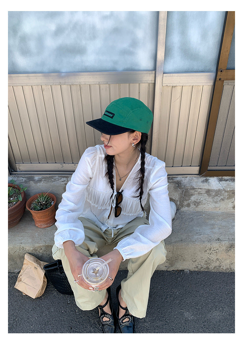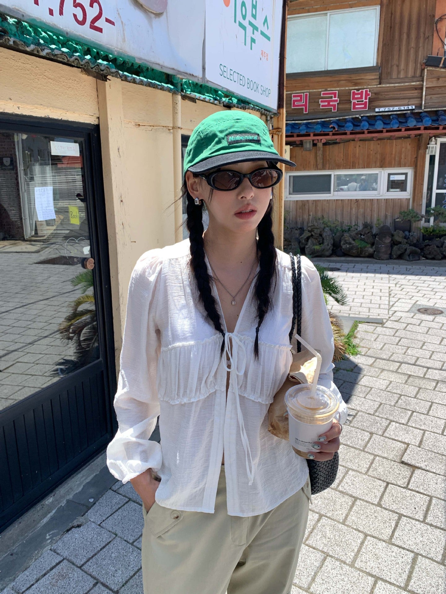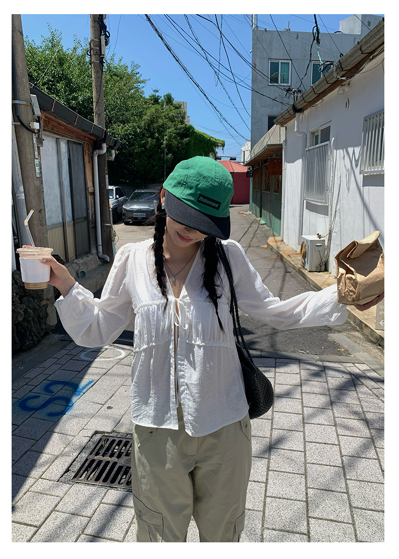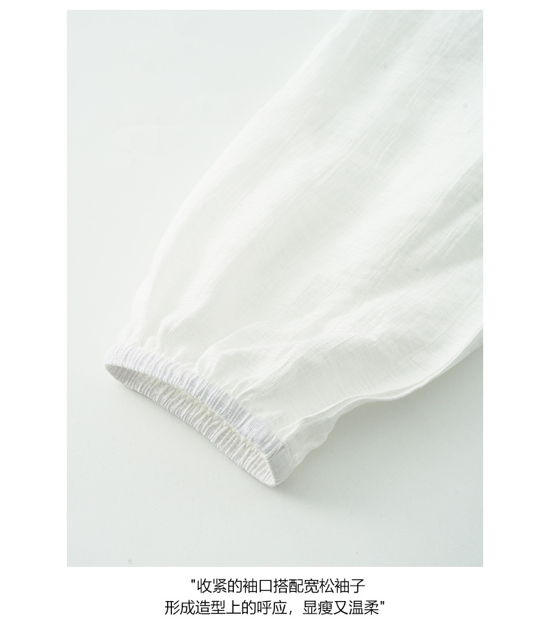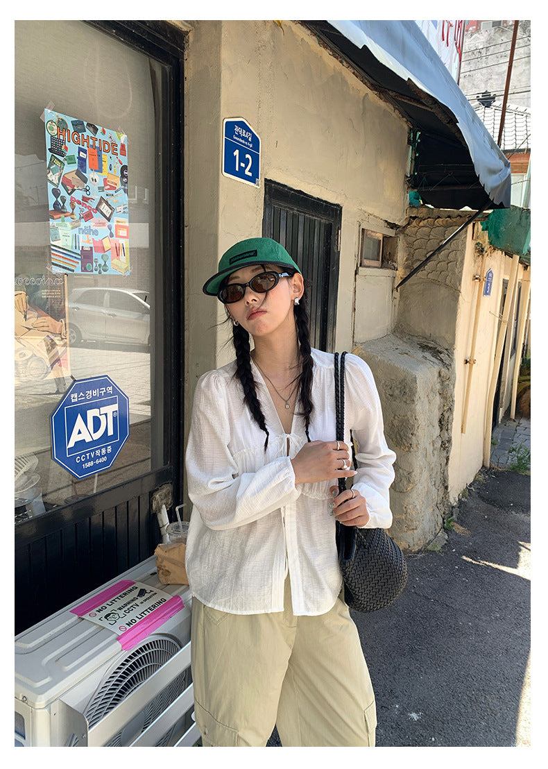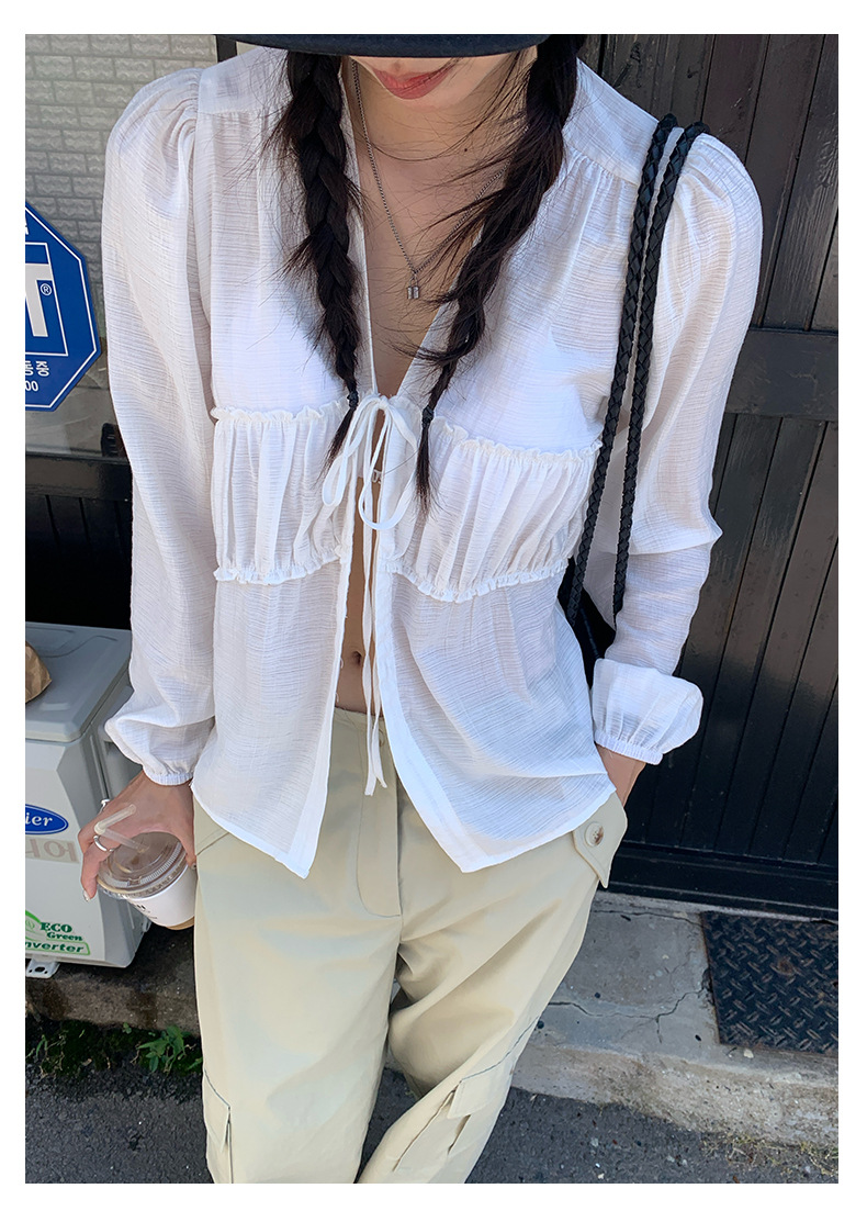 【H5379】實拍秋天繫帶v領泡泡袖褶皺襯衫250902