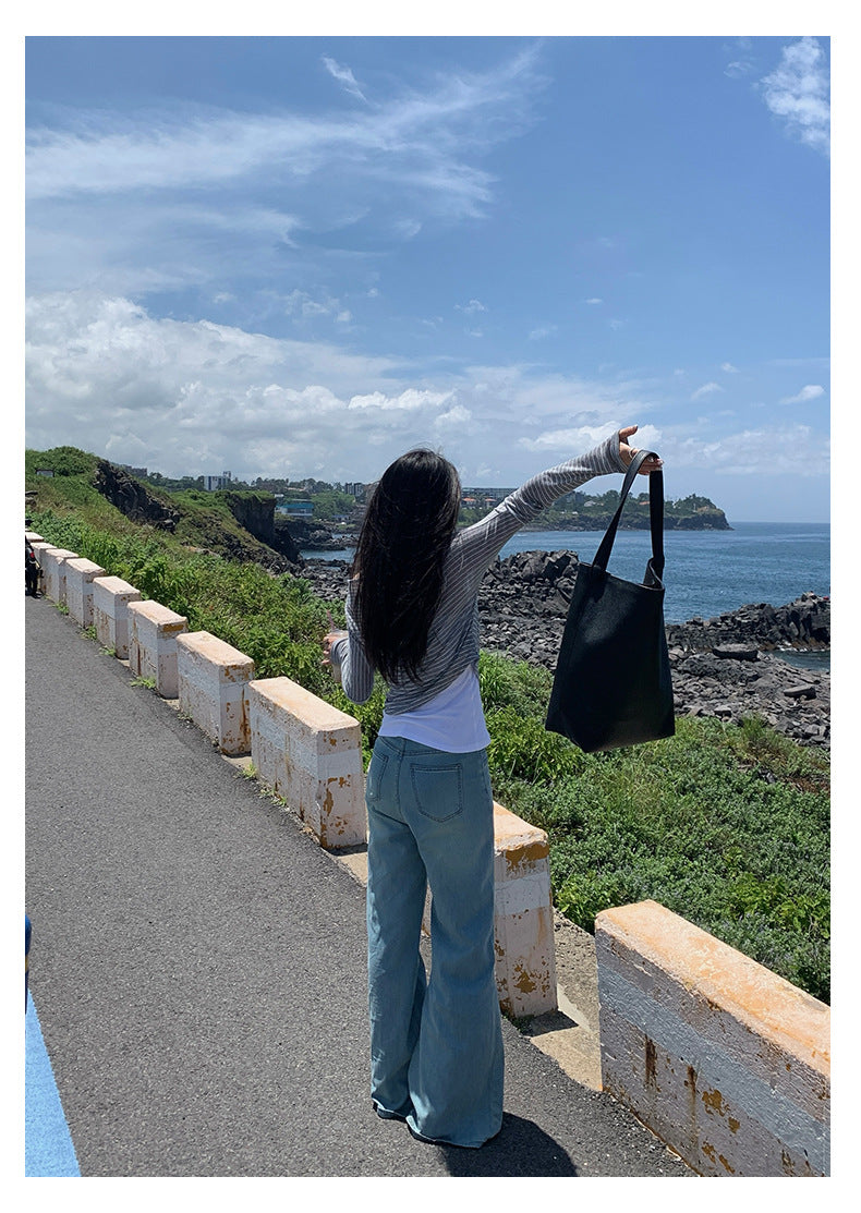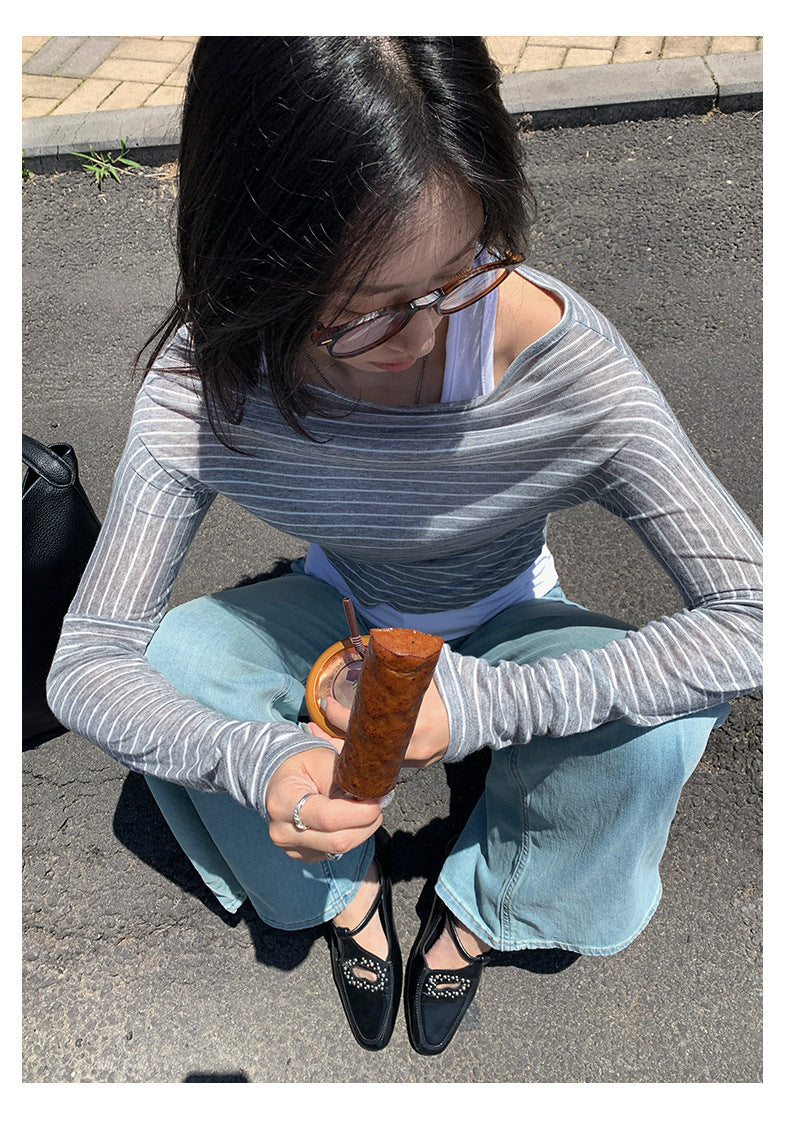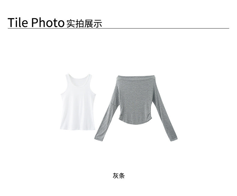 【H5384】實拍韓版條紋一字領長袖上衣 + 吊帶背心 兩件套250902