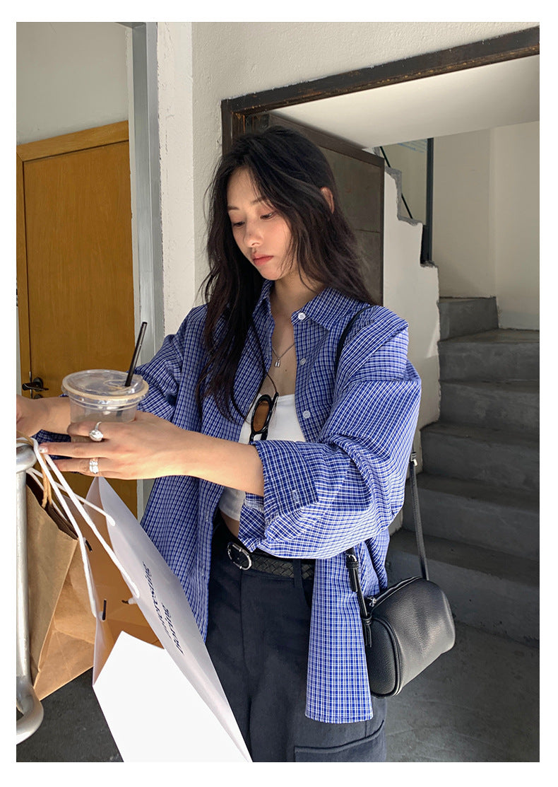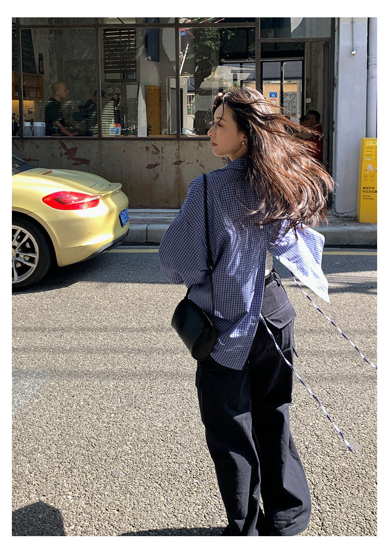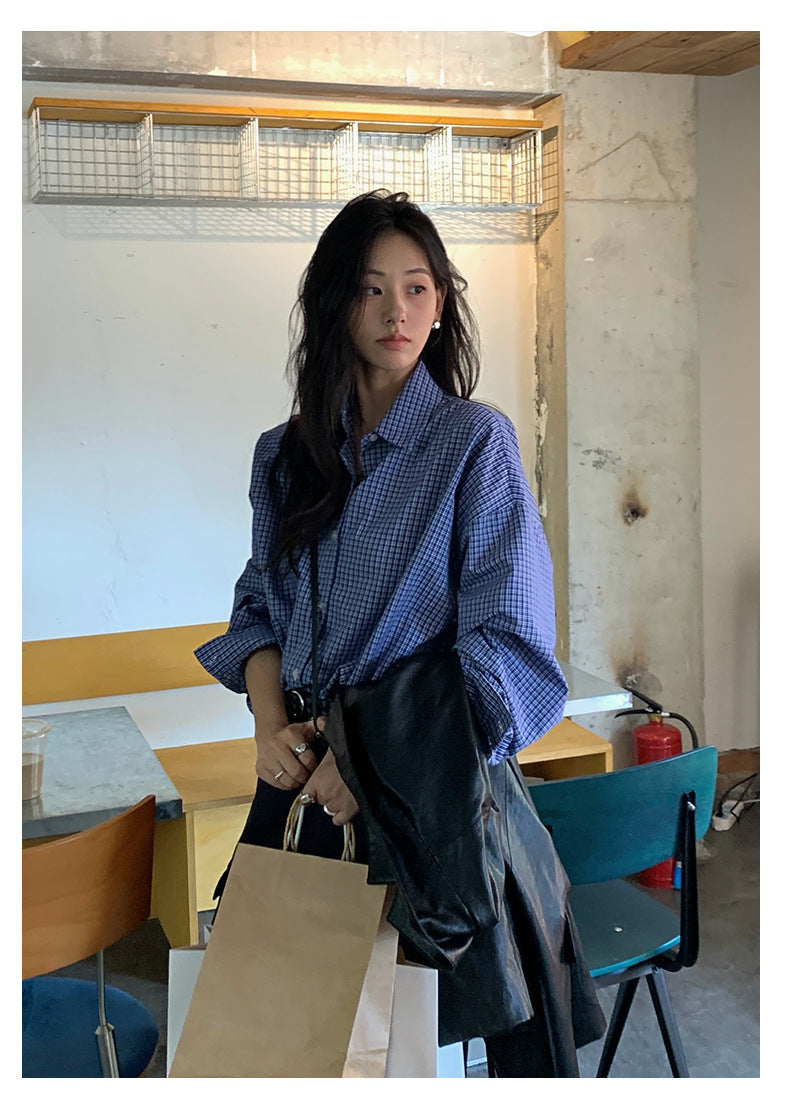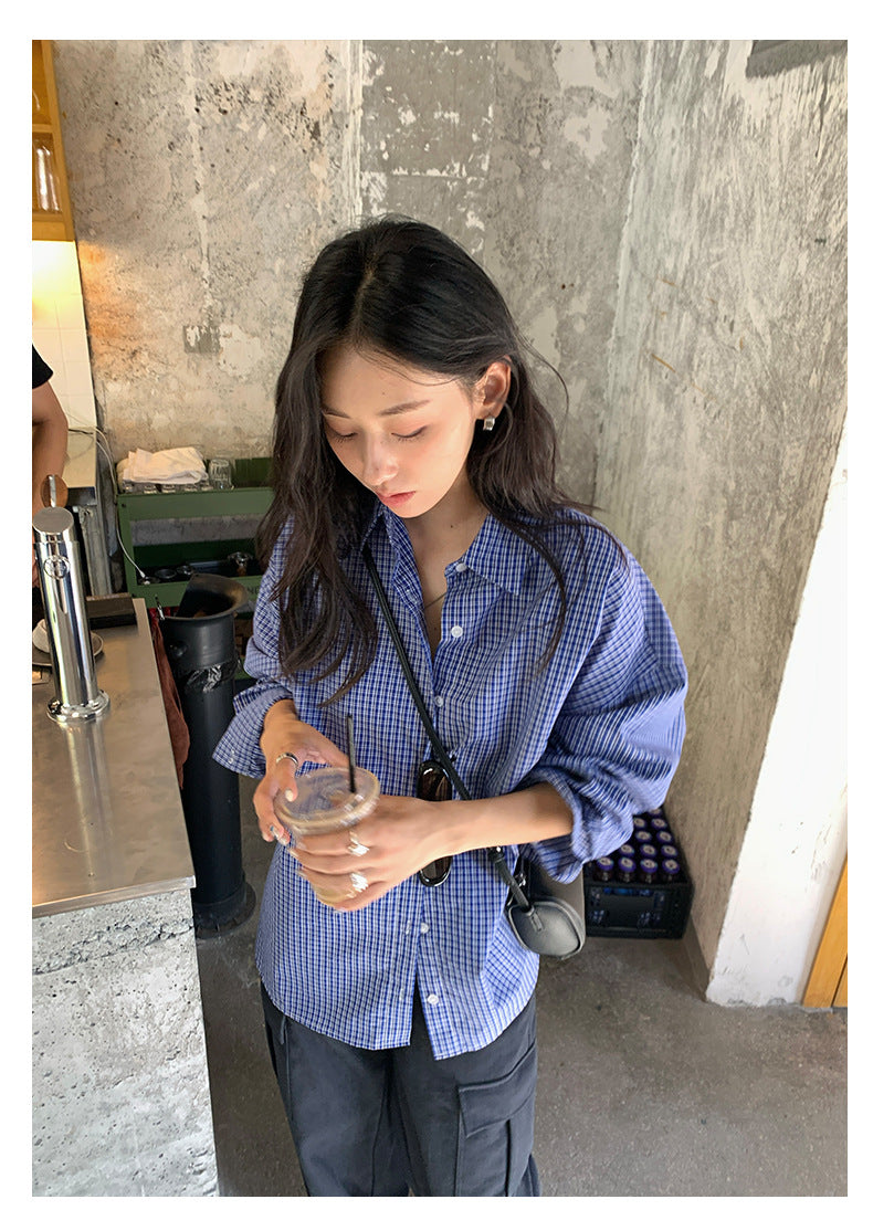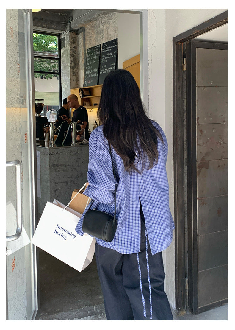 【H5401】實拍後背開叉藍色格子長袖襯衫250902