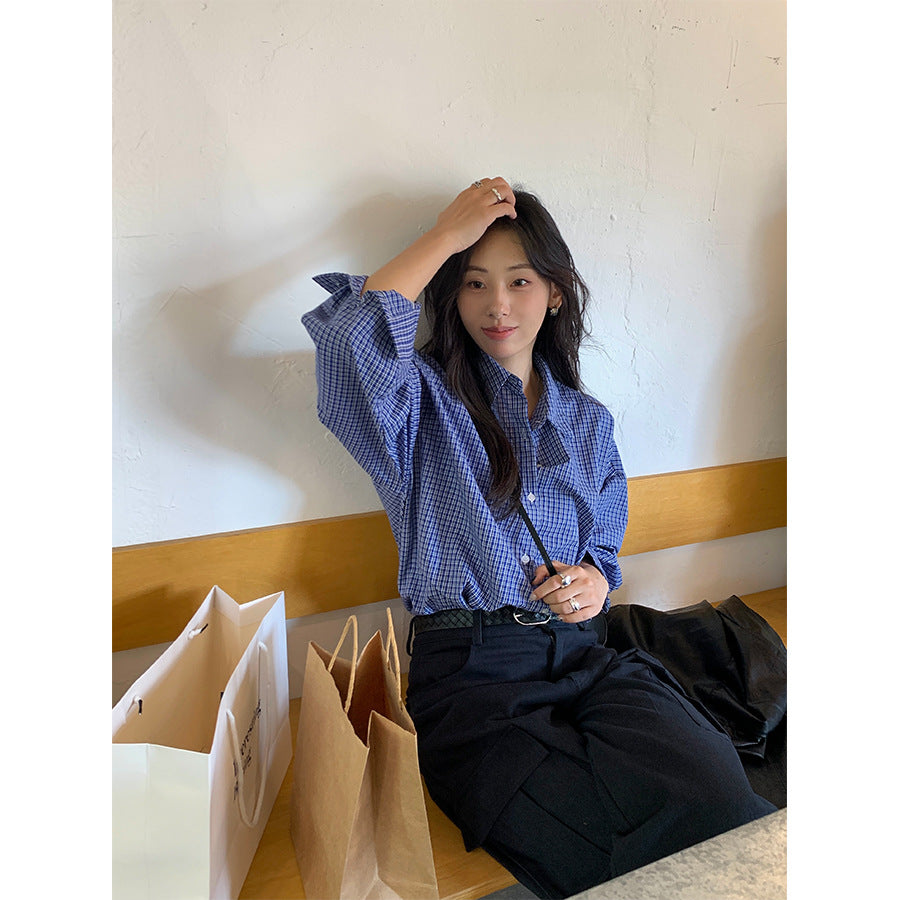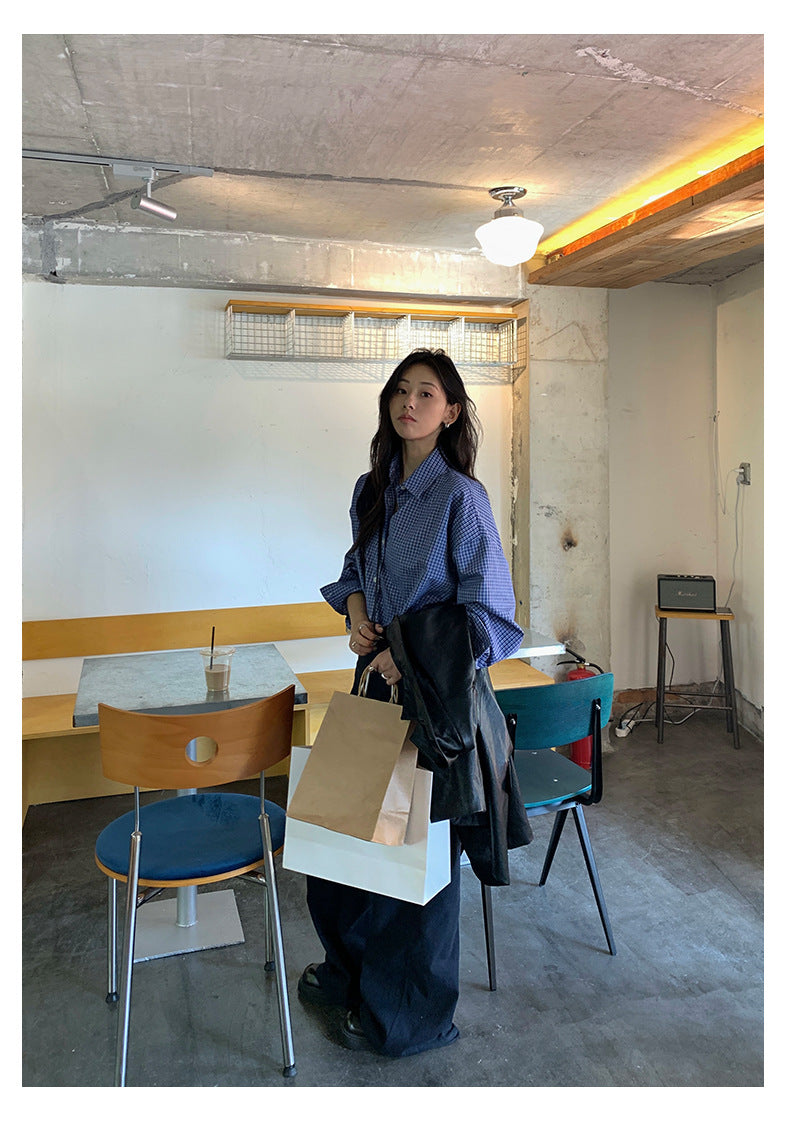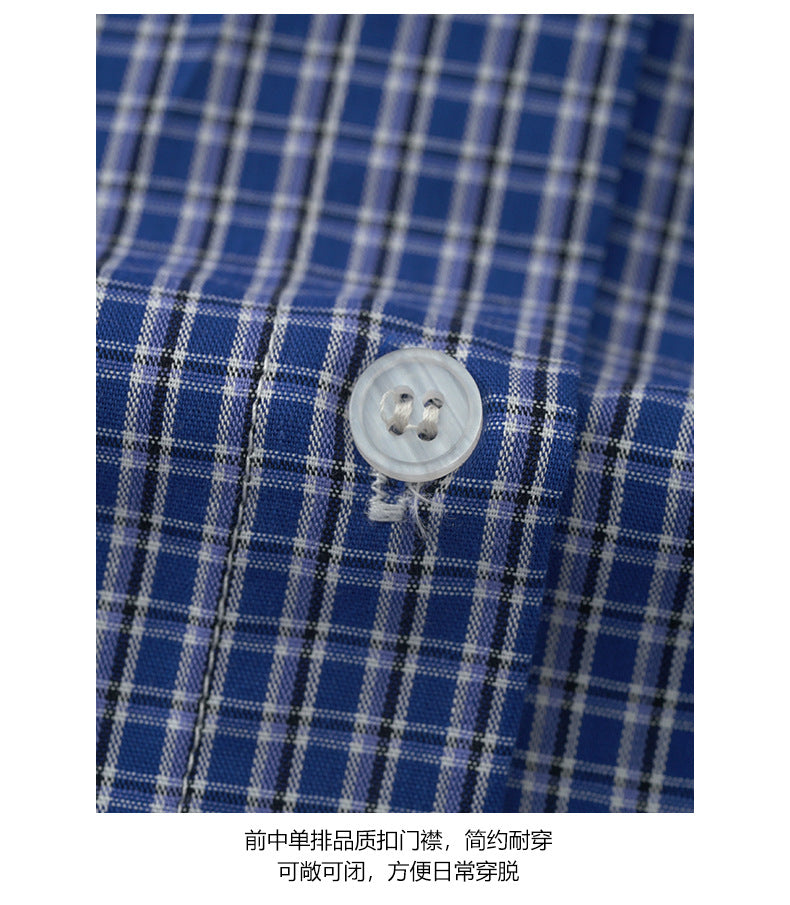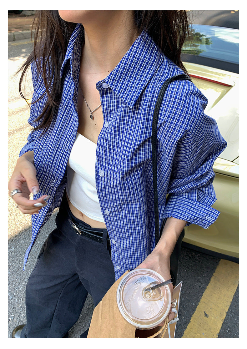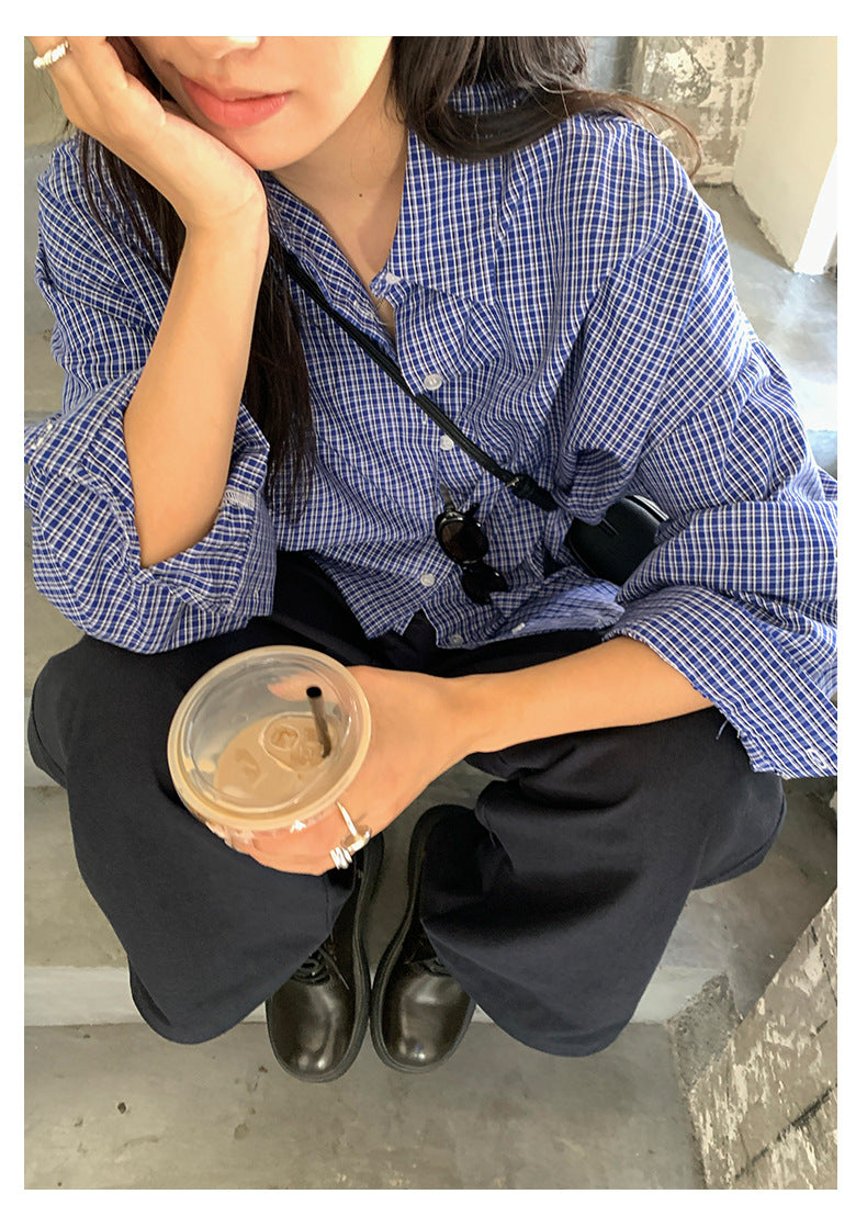 【H5401】實拍後背開叉藍色格子長袖襯衫250902