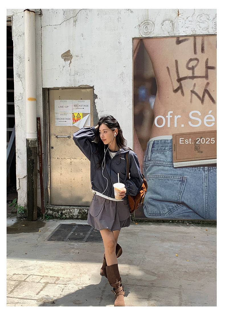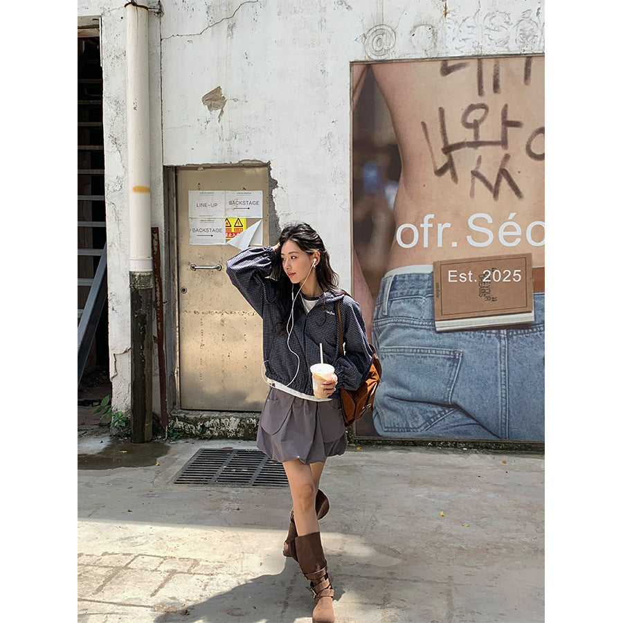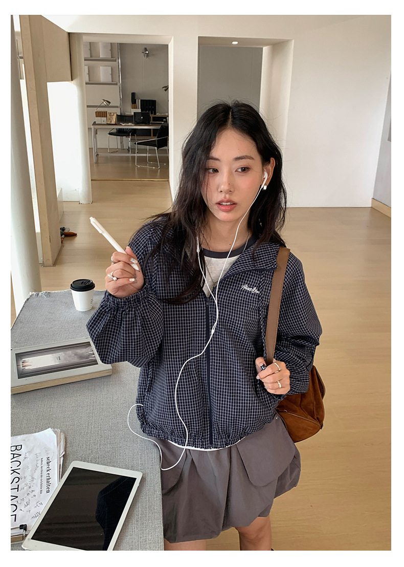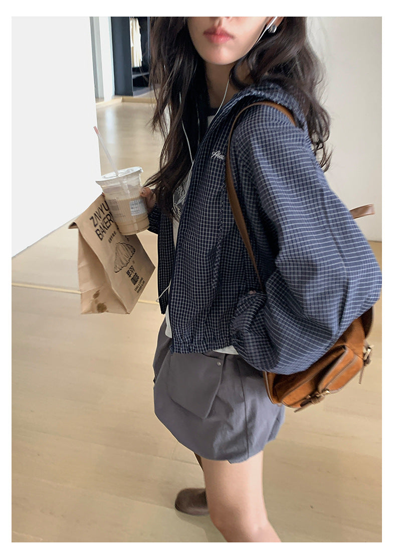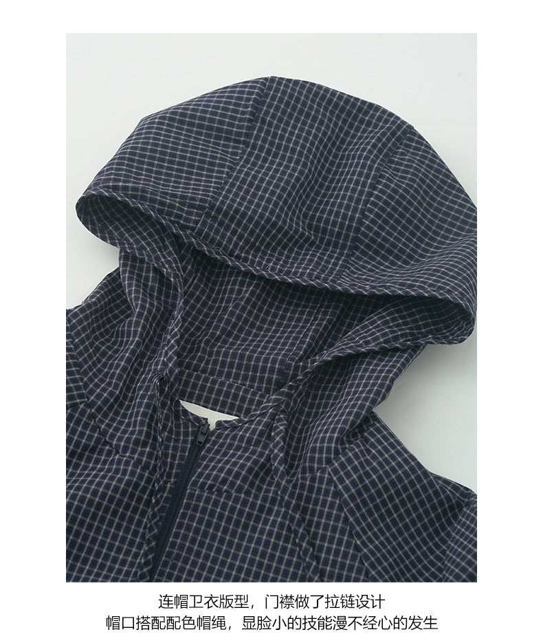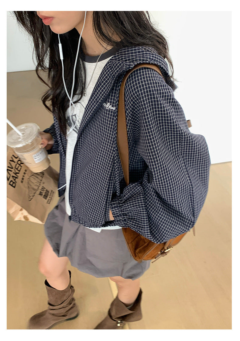 【H5414】實拍早秋微甜格子短版連帽拉鍊外套250909