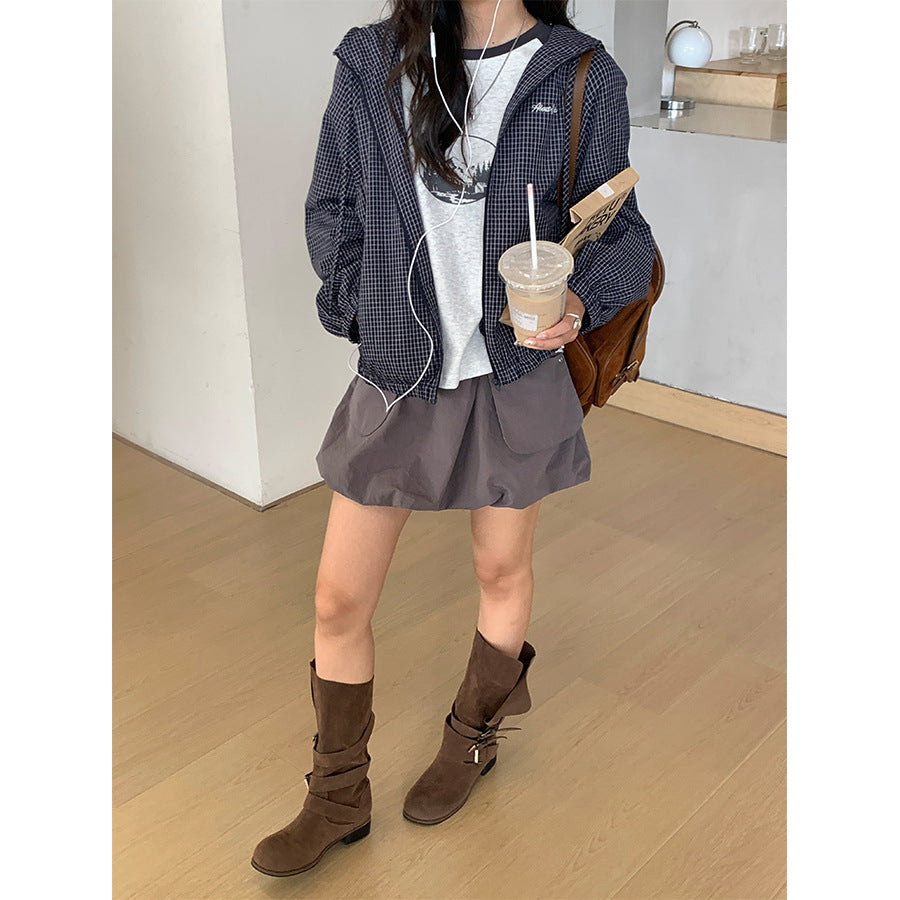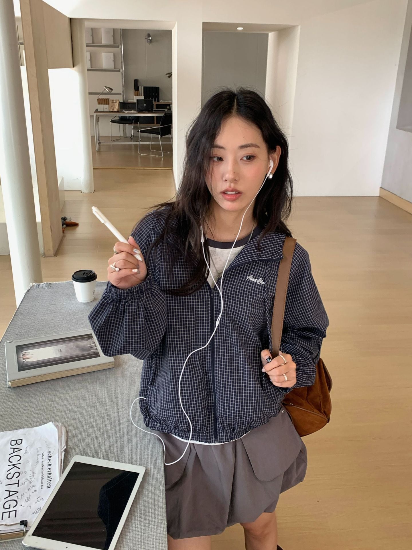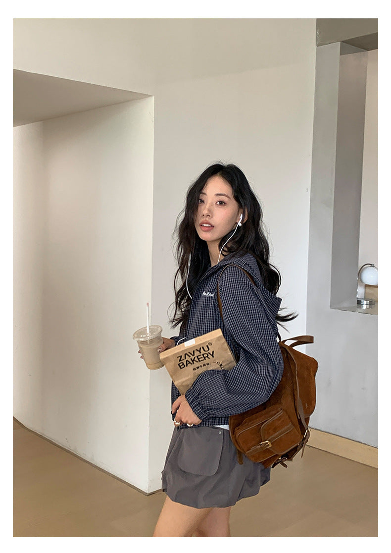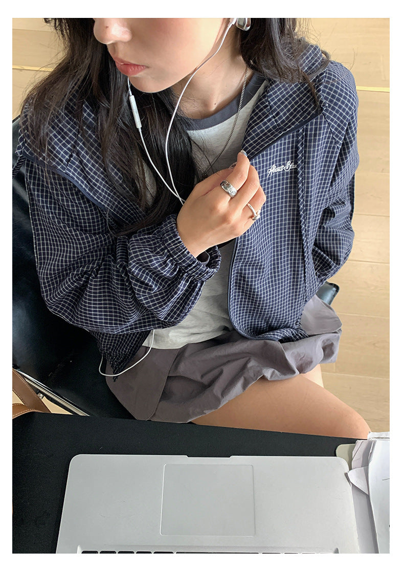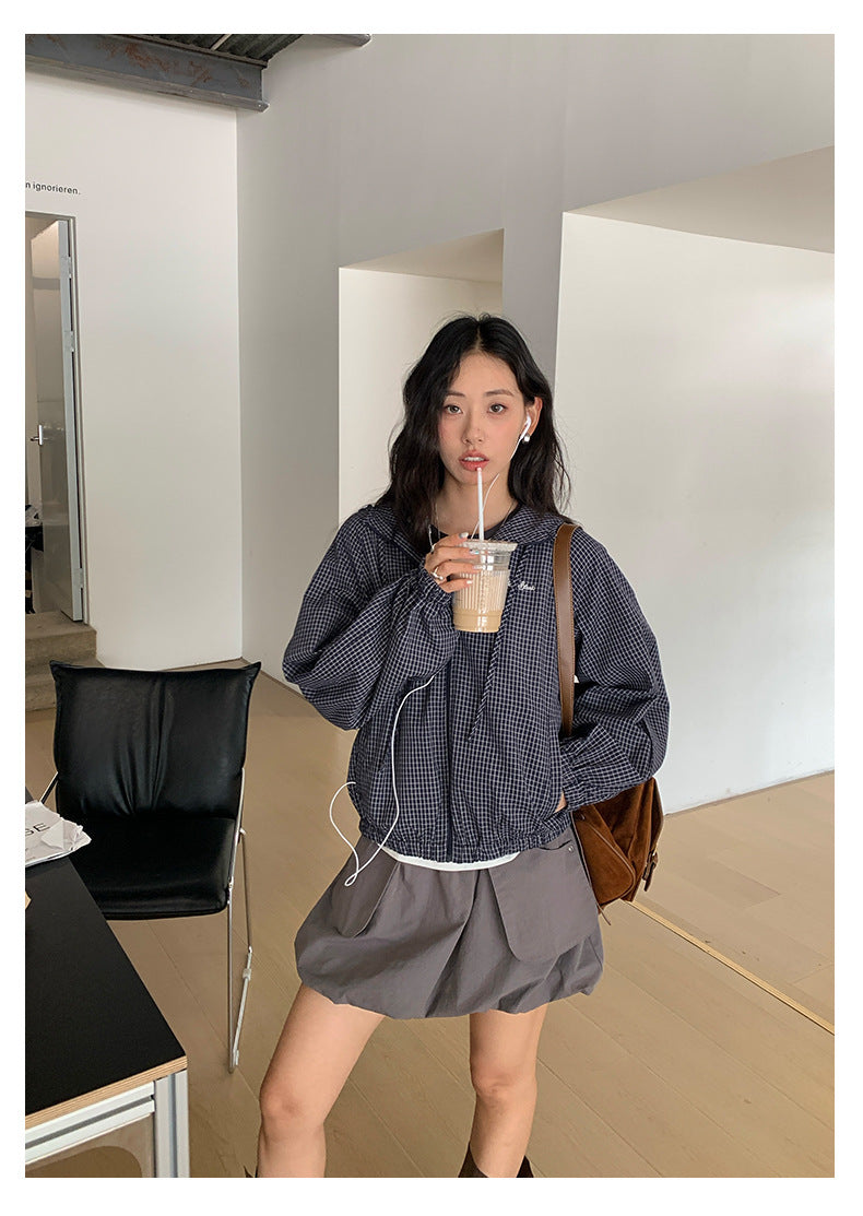 【H5414】實拍早秋微甜格子短版連帽拉鍊外套250909