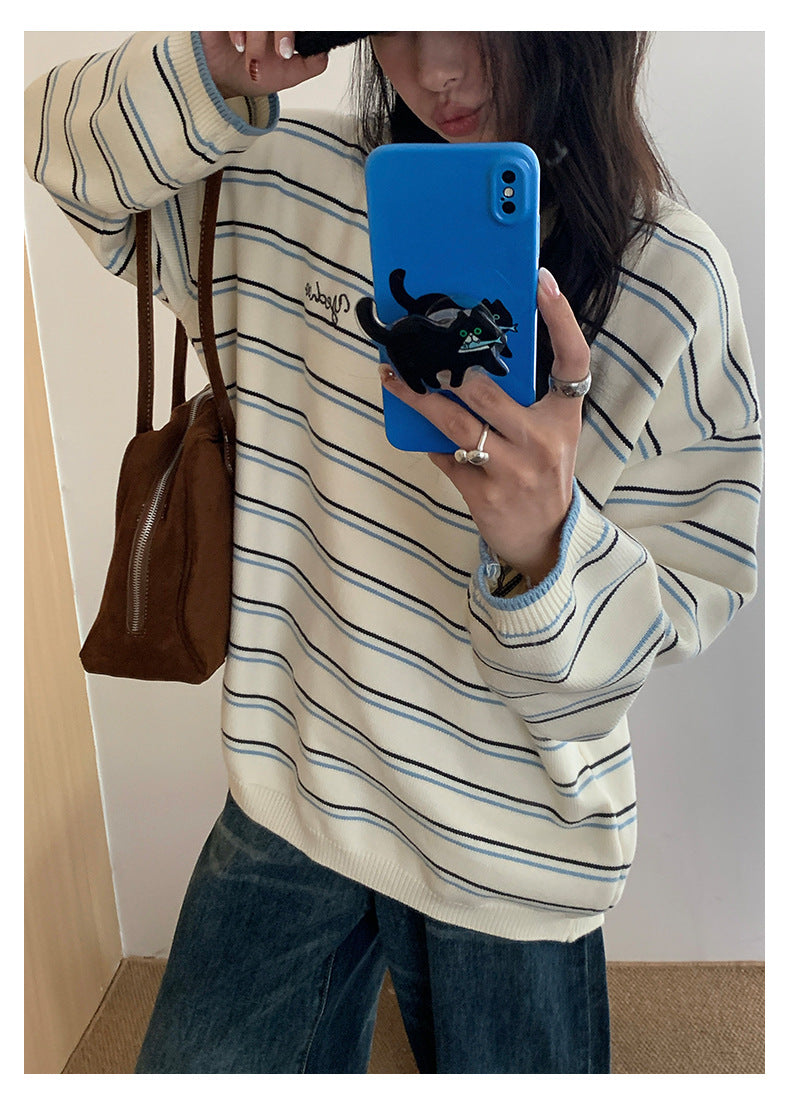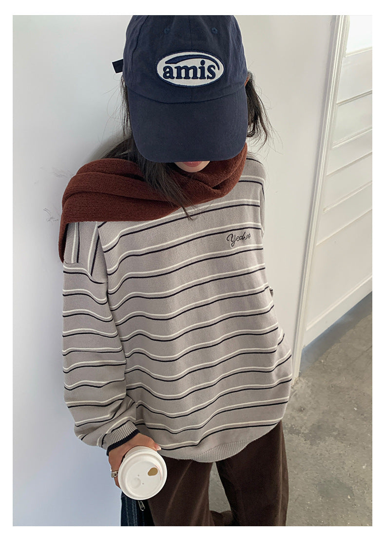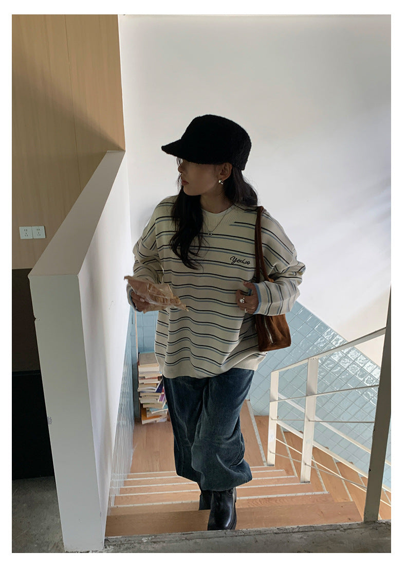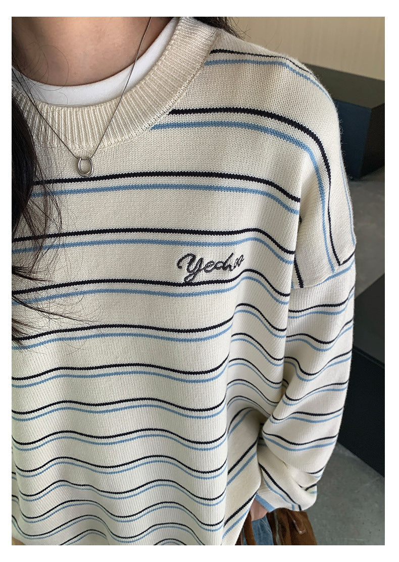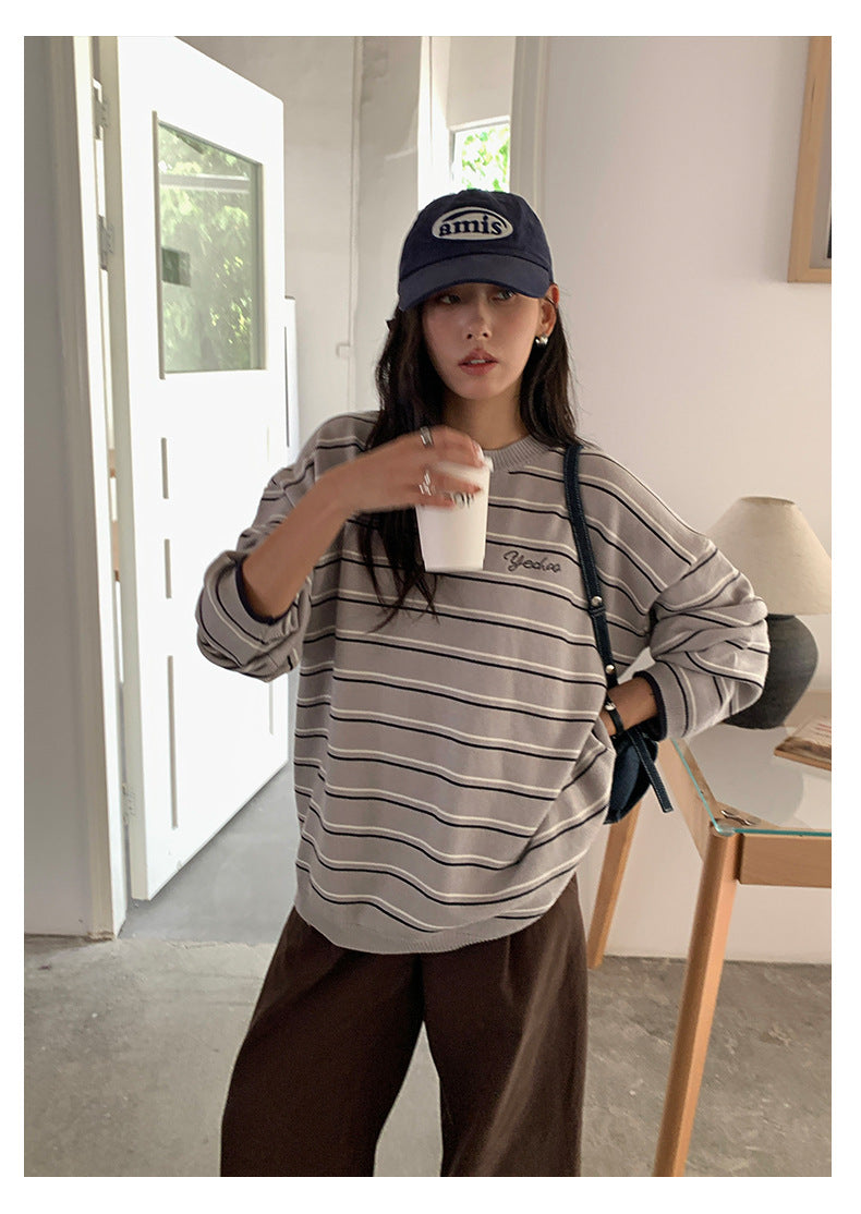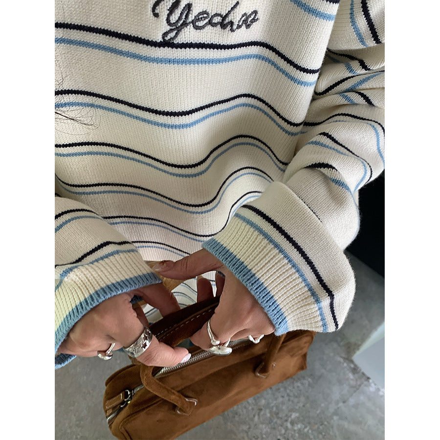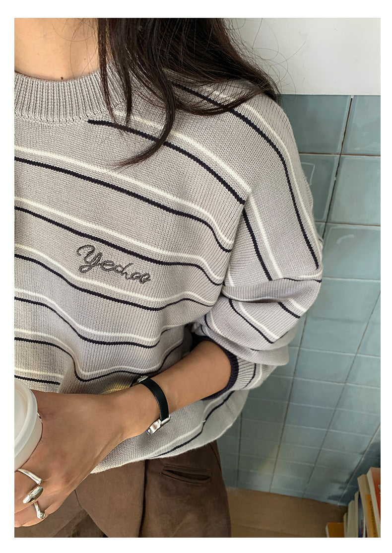 【H5454】實拍復古鬆弛感條紋刺繡針織毛衣250923