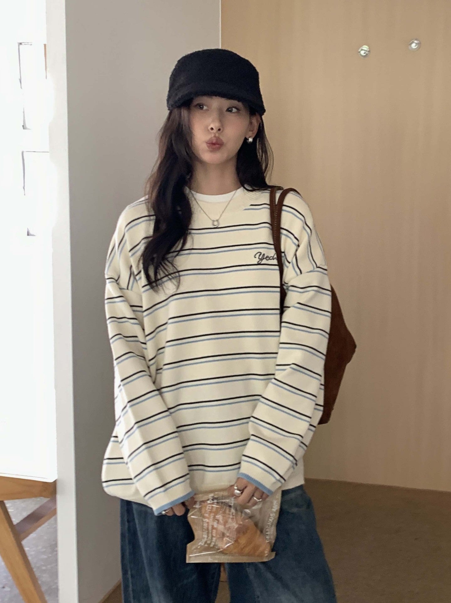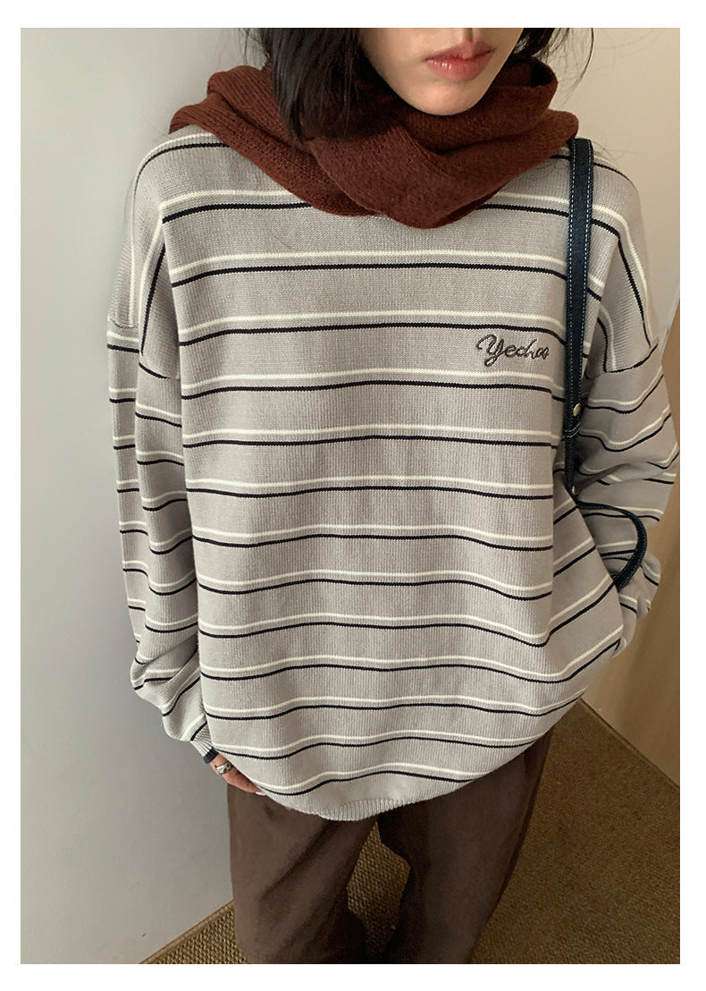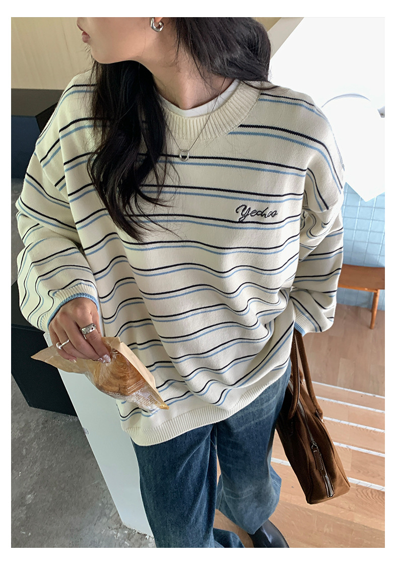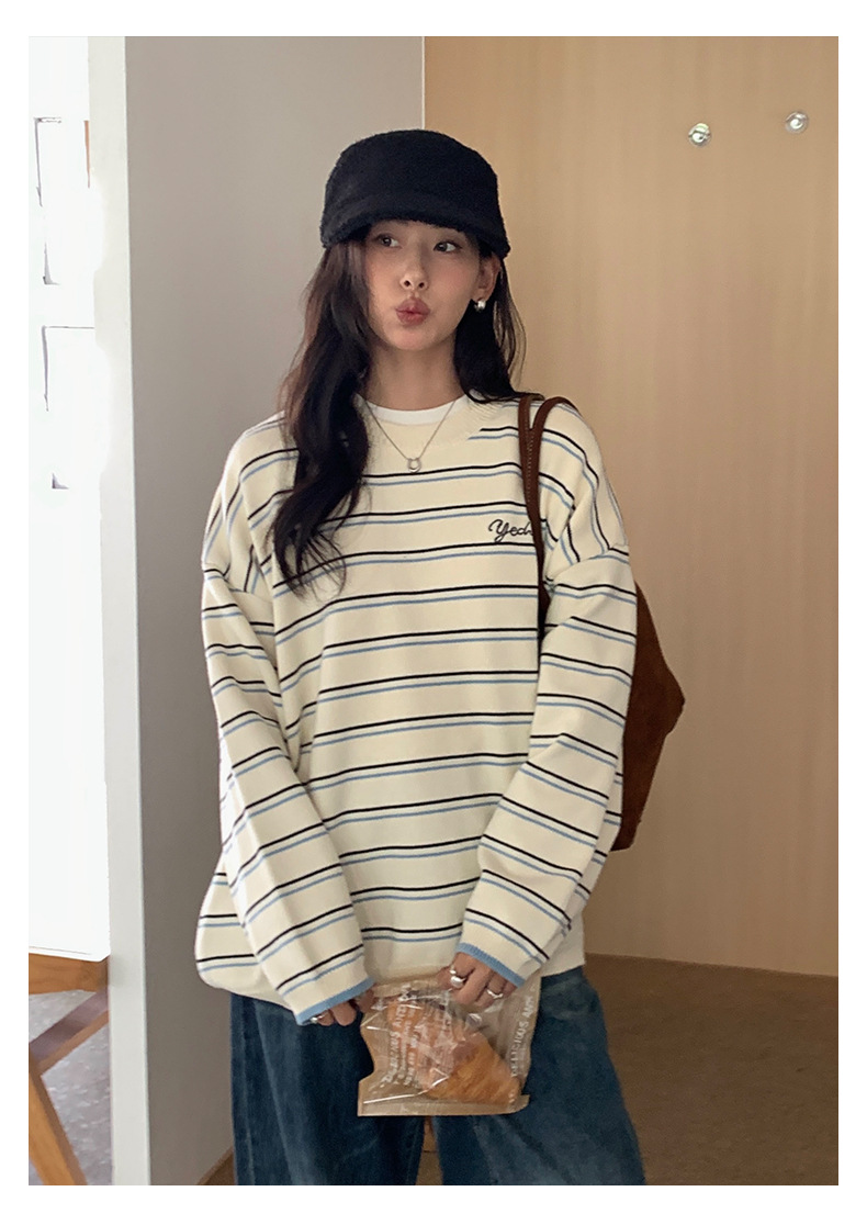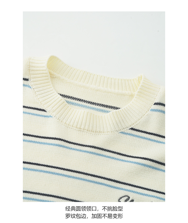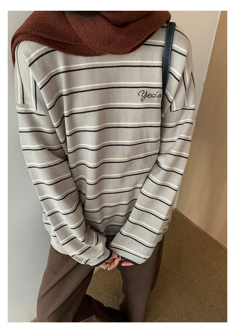 【H5454】實拍復古鬆弛感條紋刺繡針織毛衣250923