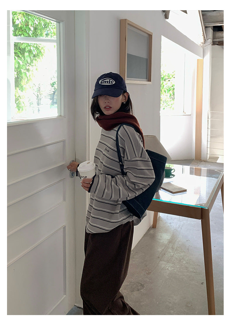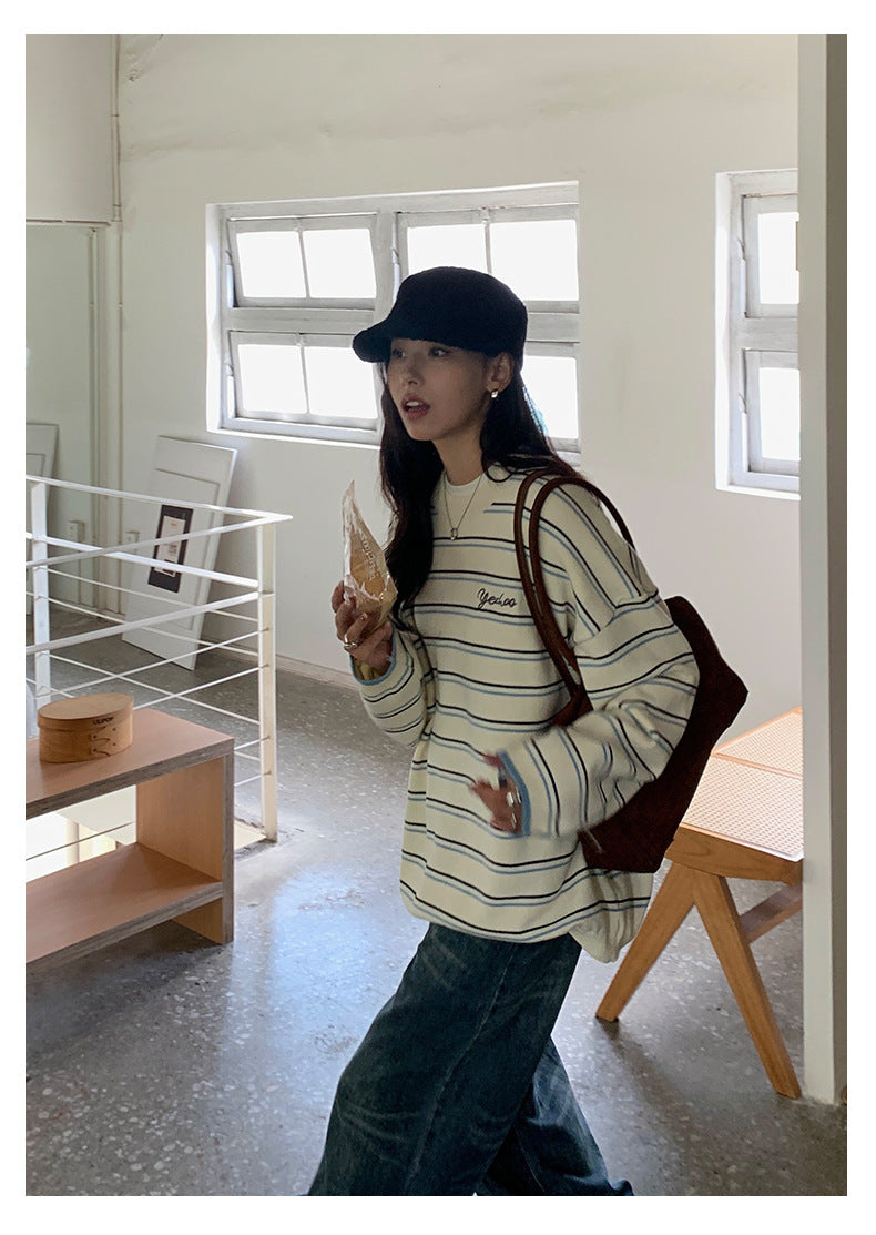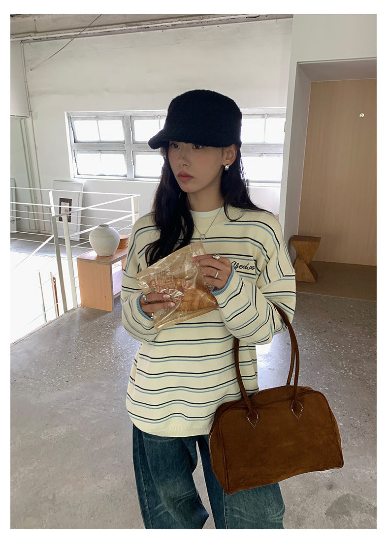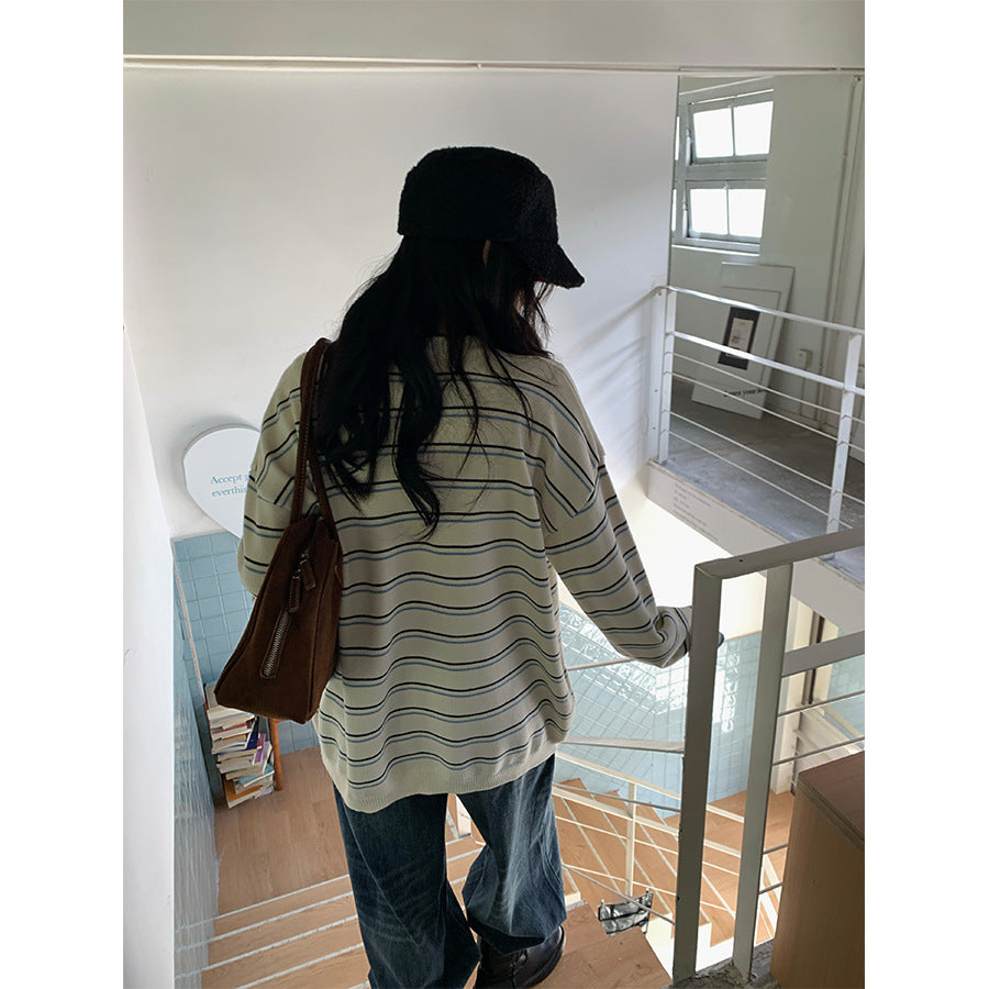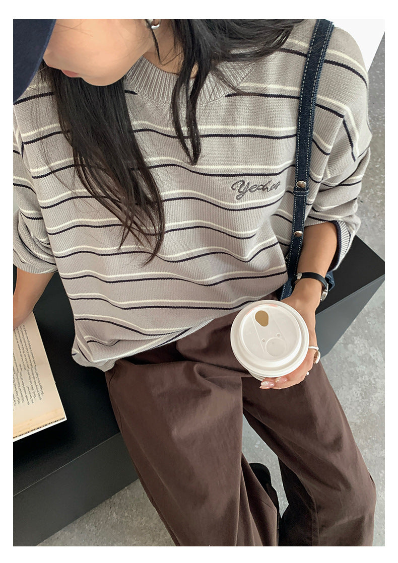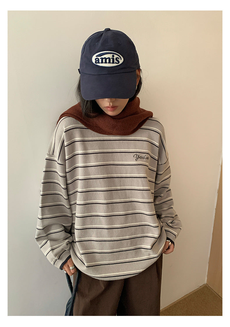 【H5454】實拍復古鬆弛感條紋刺繡針織毛衣250923