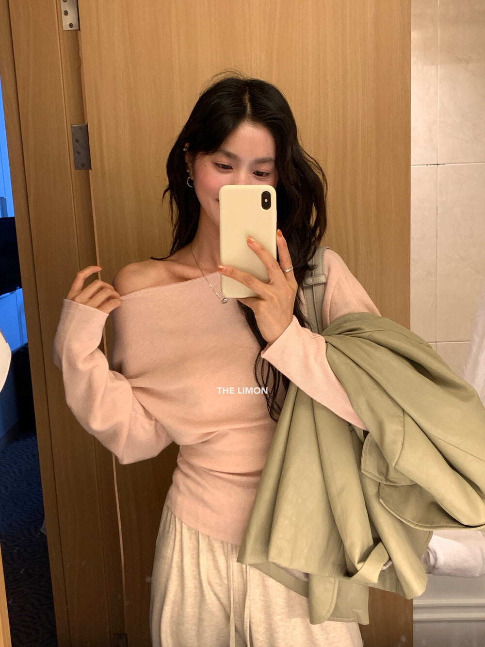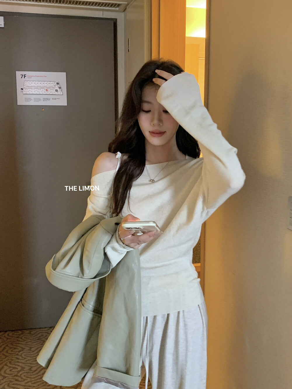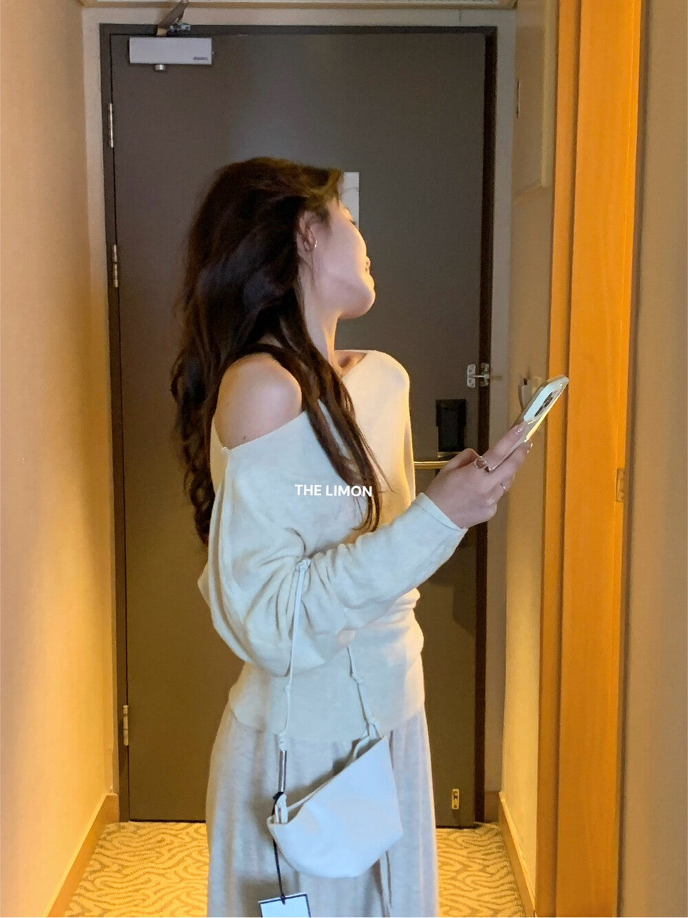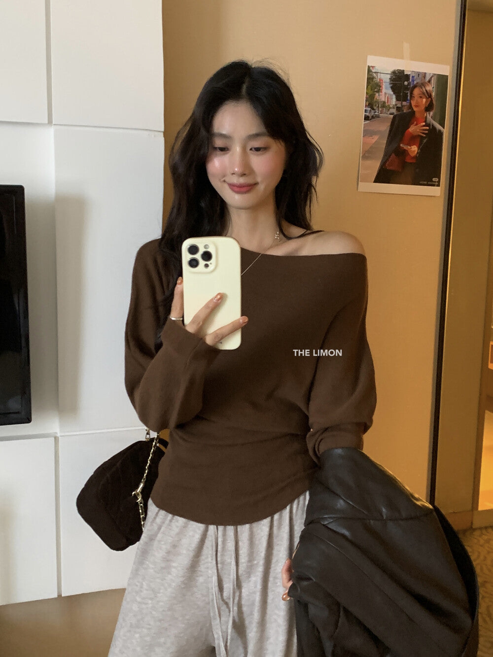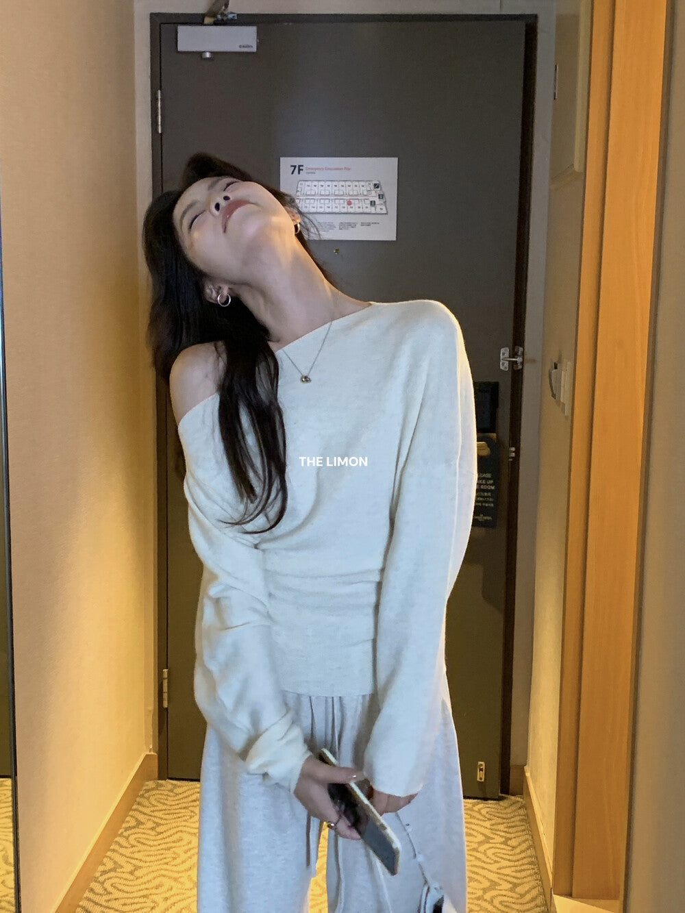 【L006836】實拍檸檬家初秋簡約慵懶斜肩長袖針織衫250901