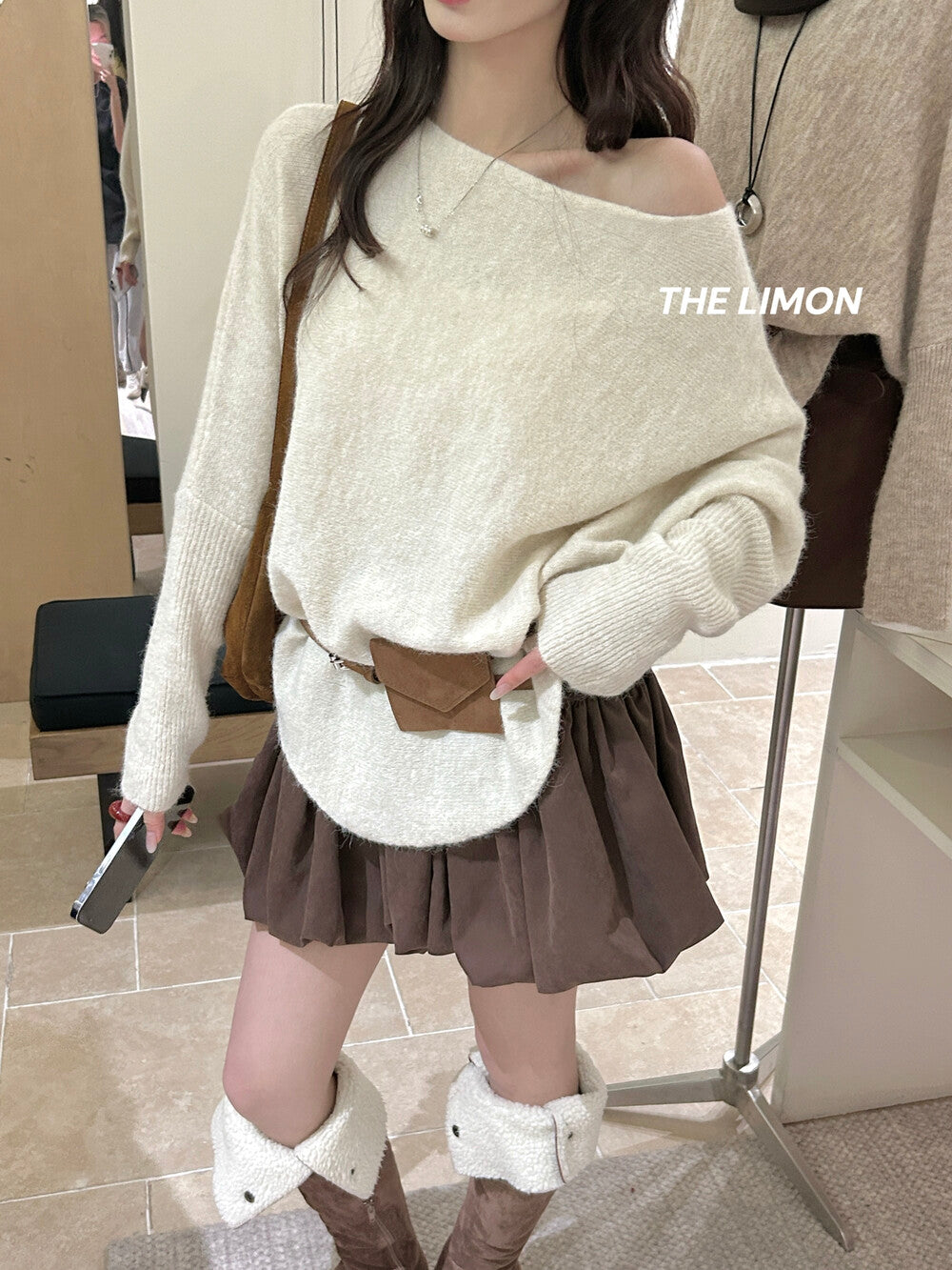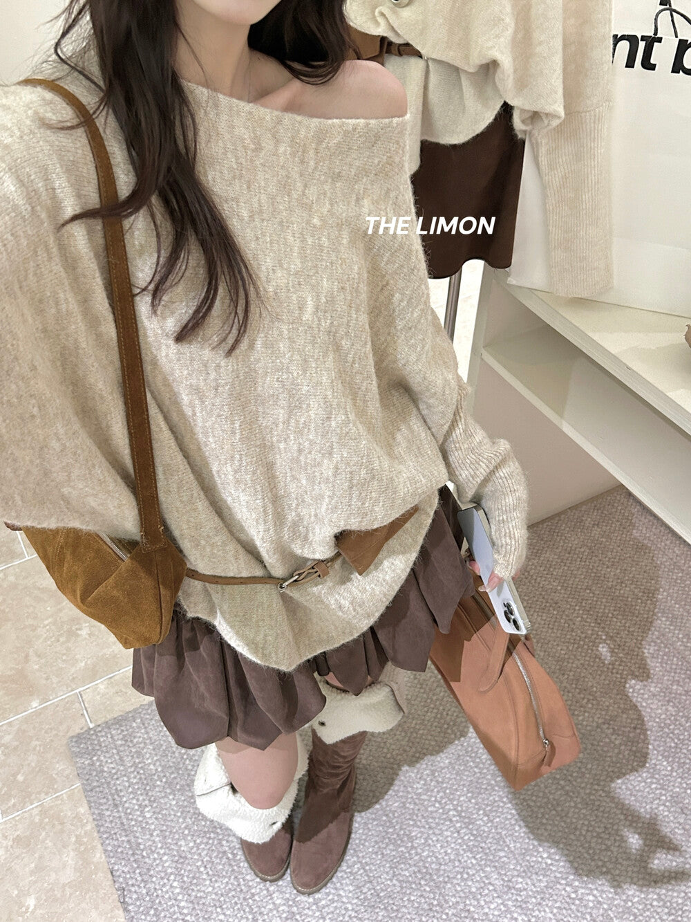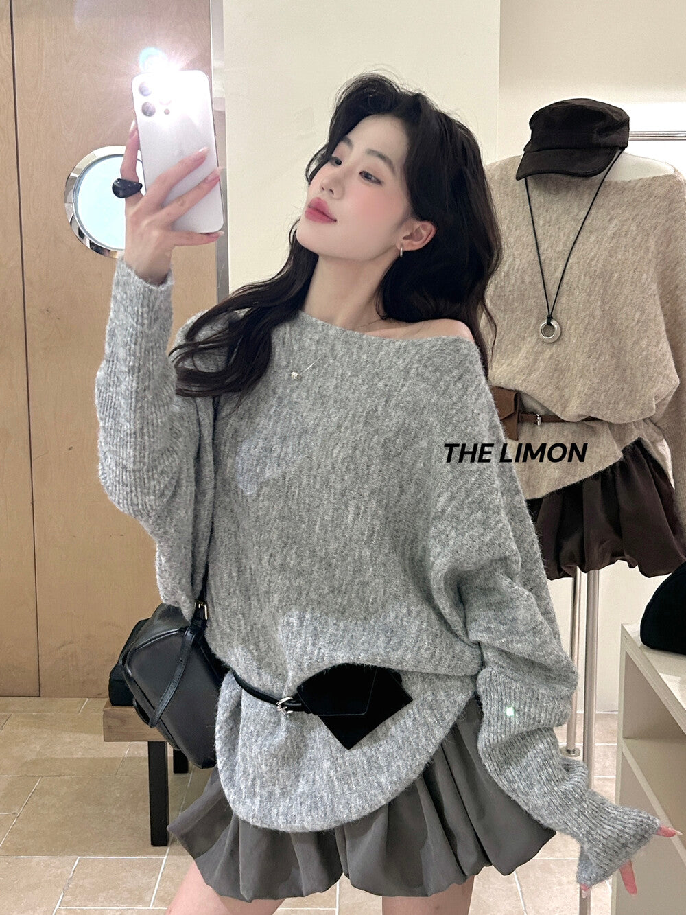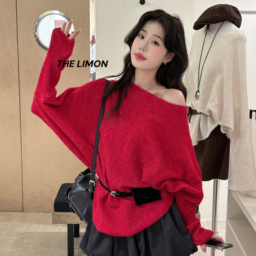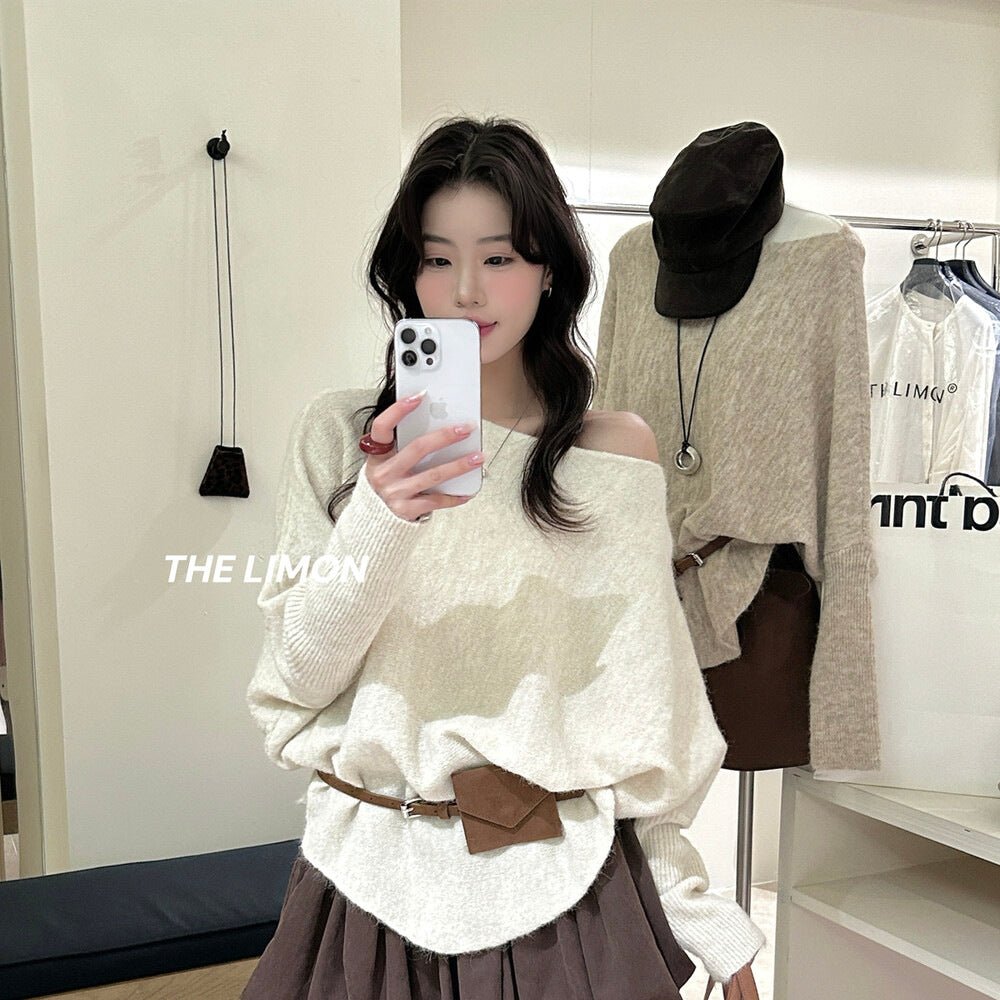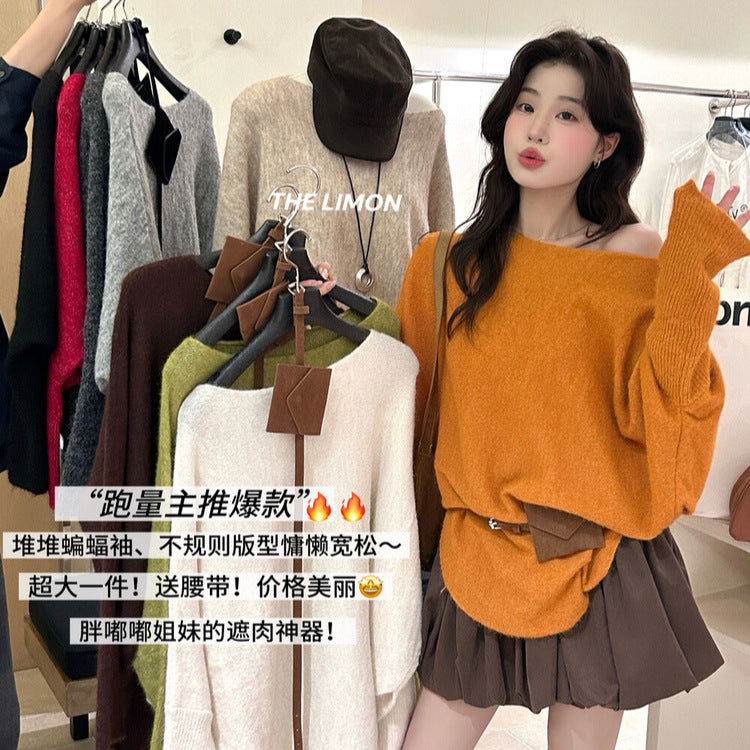 【L006868】實拍檸檬秋季慵懶寬鬆露肩長袖針織衫+腰包(含羊毛8%)250930