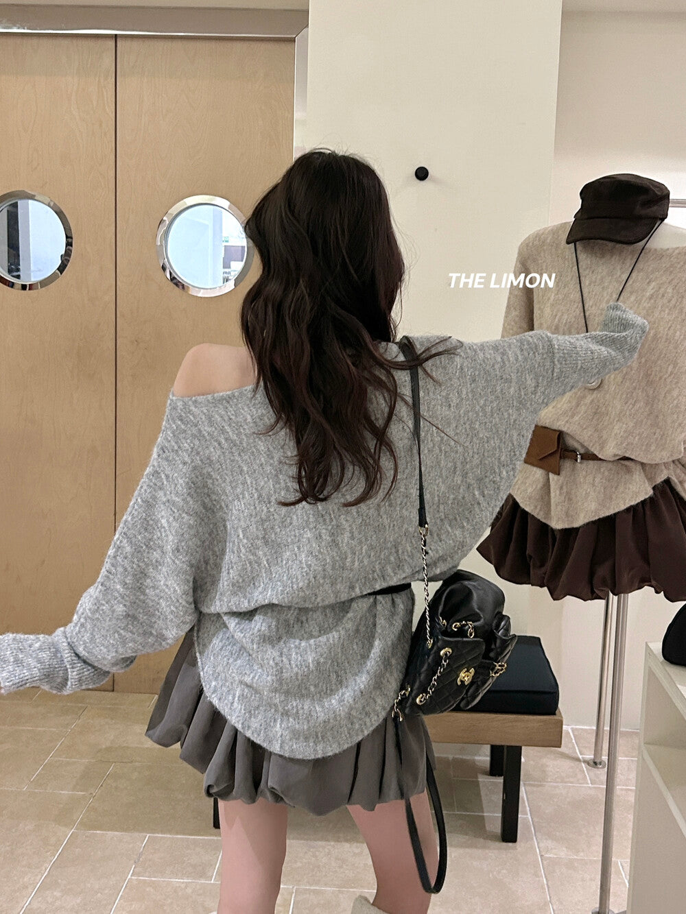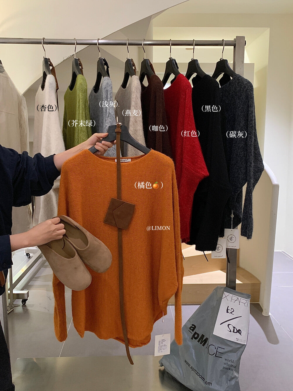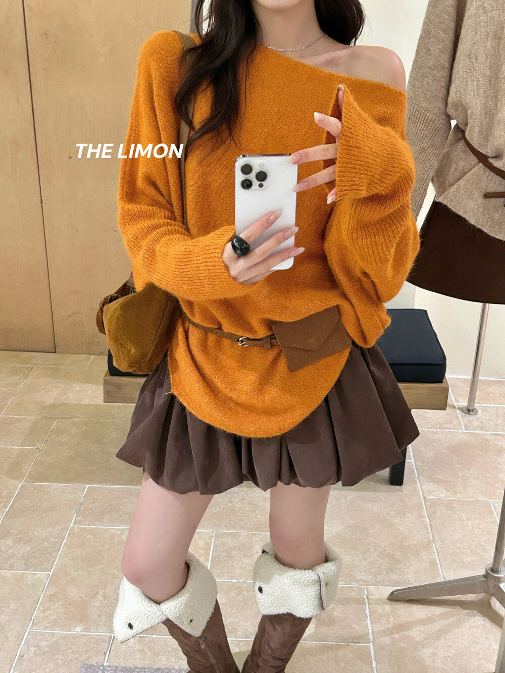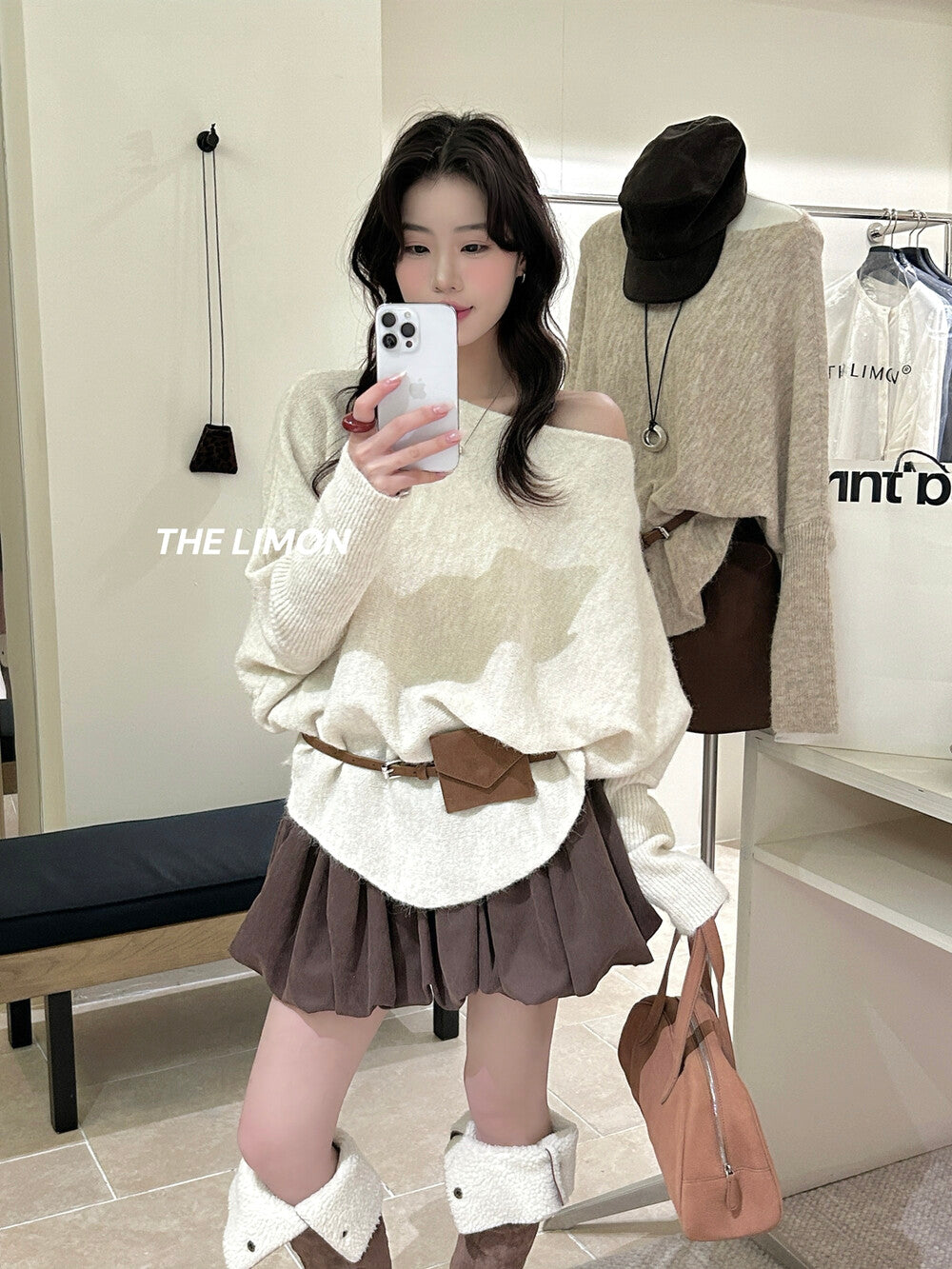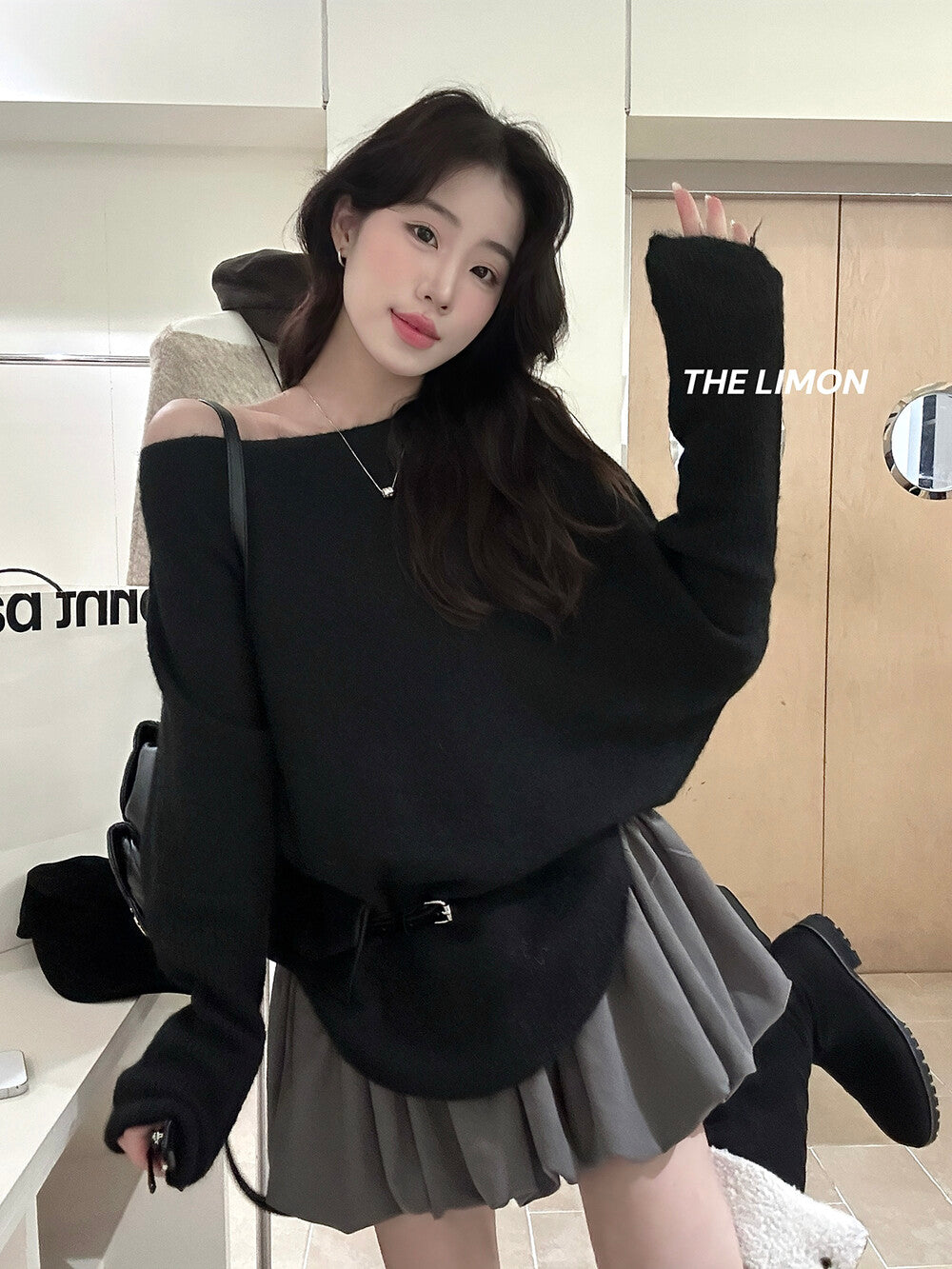 【L006868】實拍檸檬秋季慵懶寬鬆露肩長袖針織衫+腰包(含羊毛8%)250930