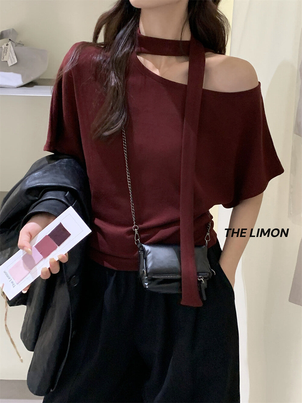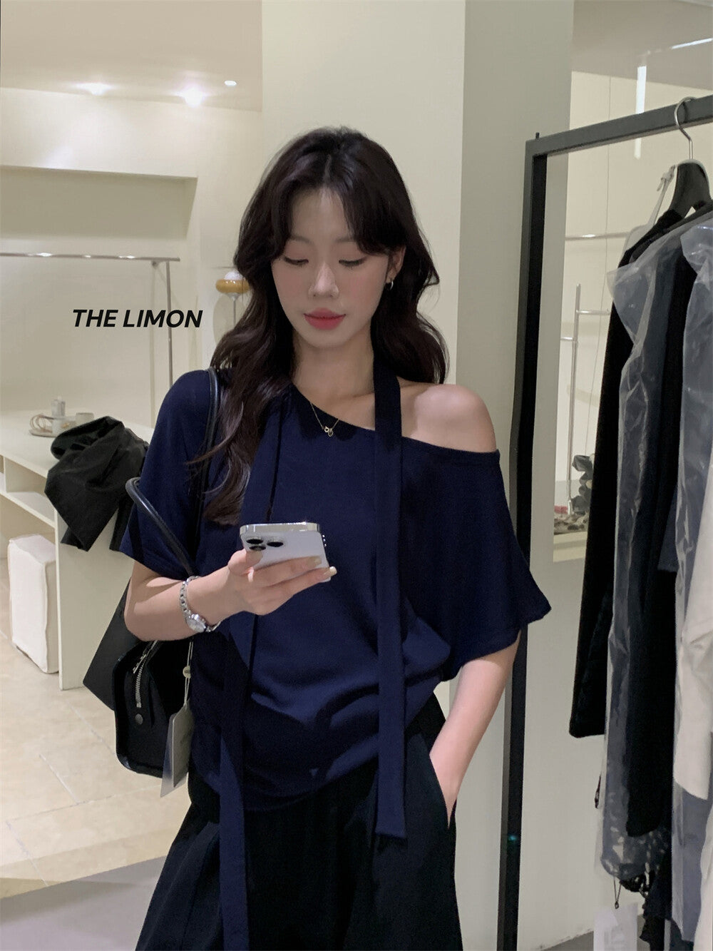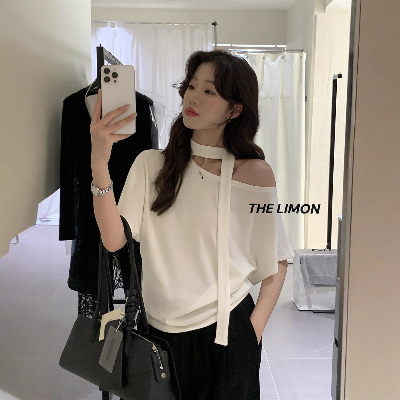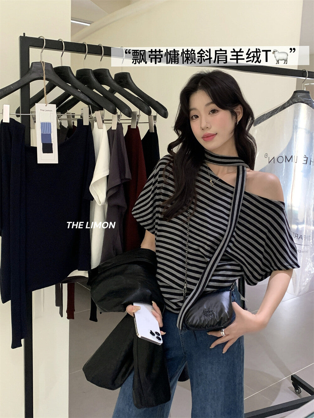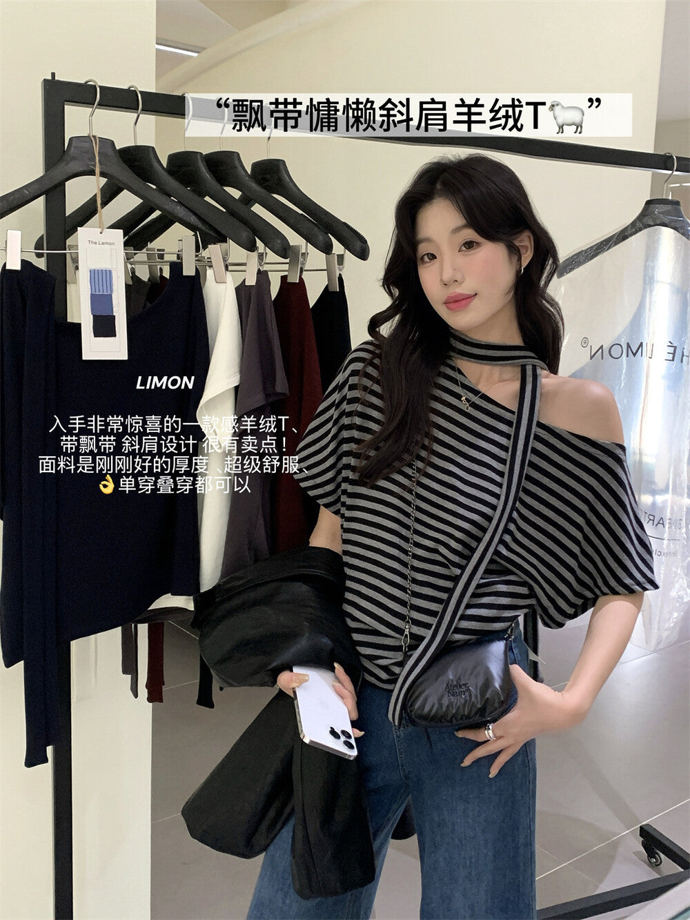 【L1128】實拍檸檬家慵懶羊絨斜肩T恤+飄帶250901