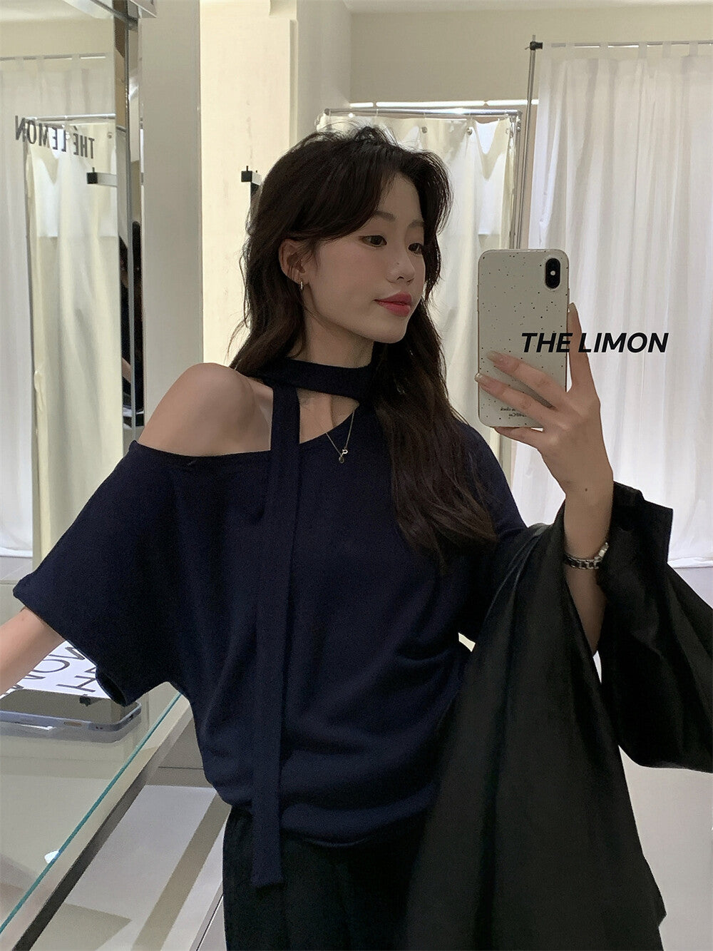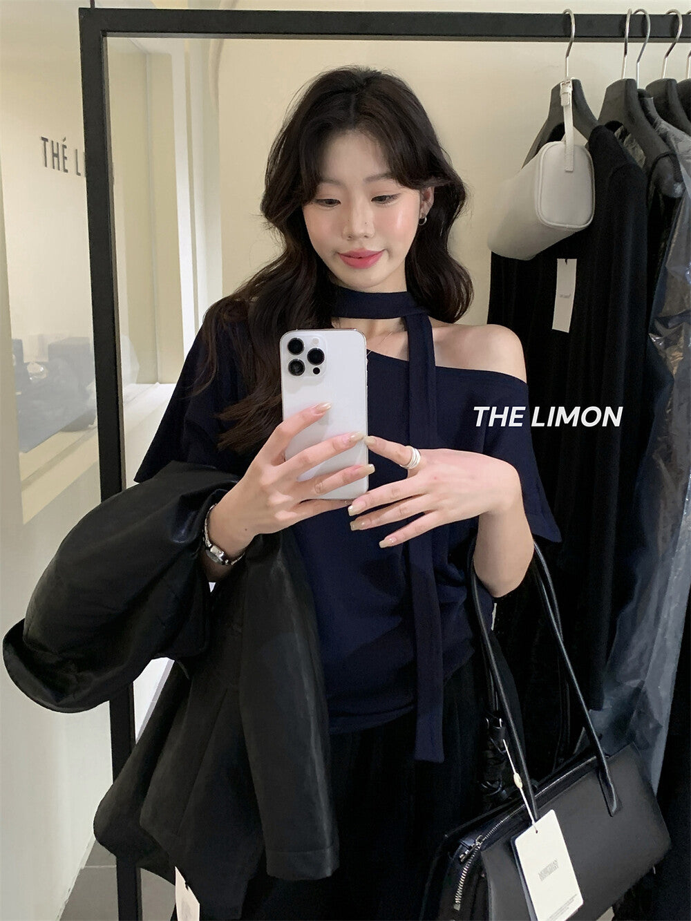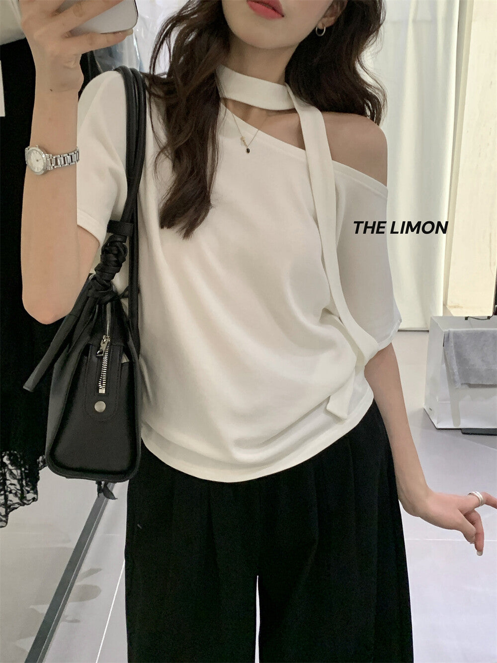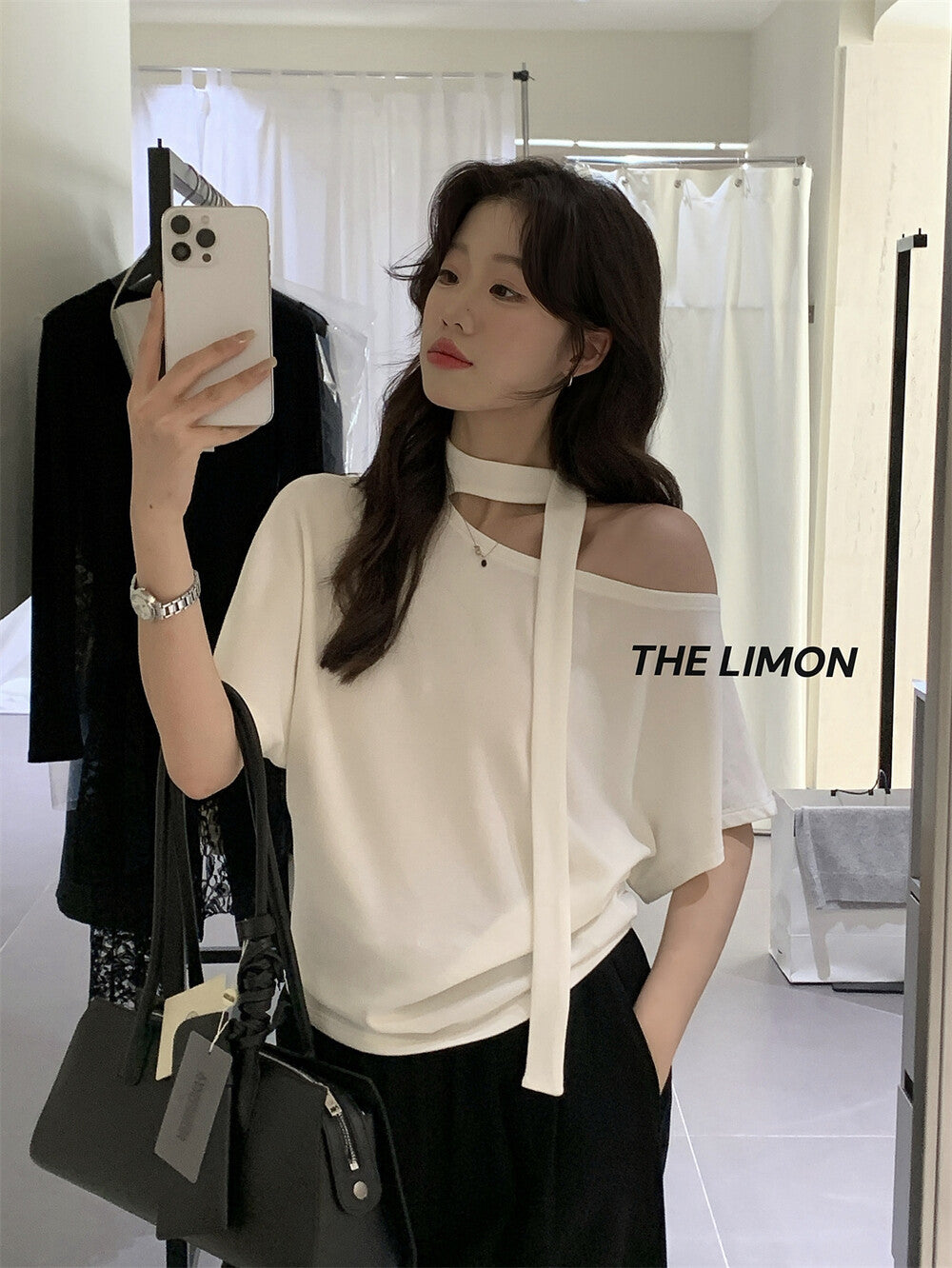【L1128】實拍檸檬家慵懶羊絨斜肩T恤+飄帶250901