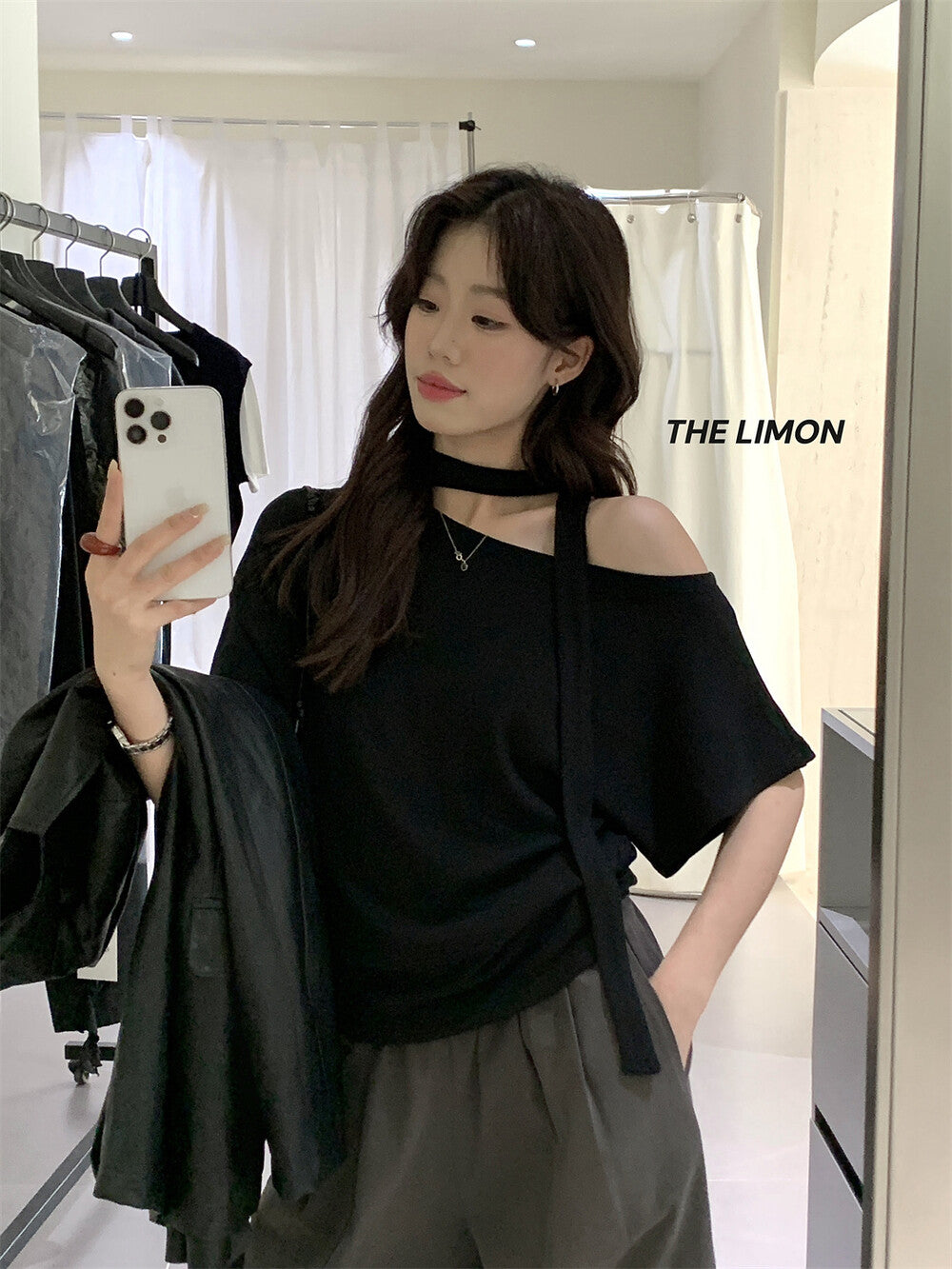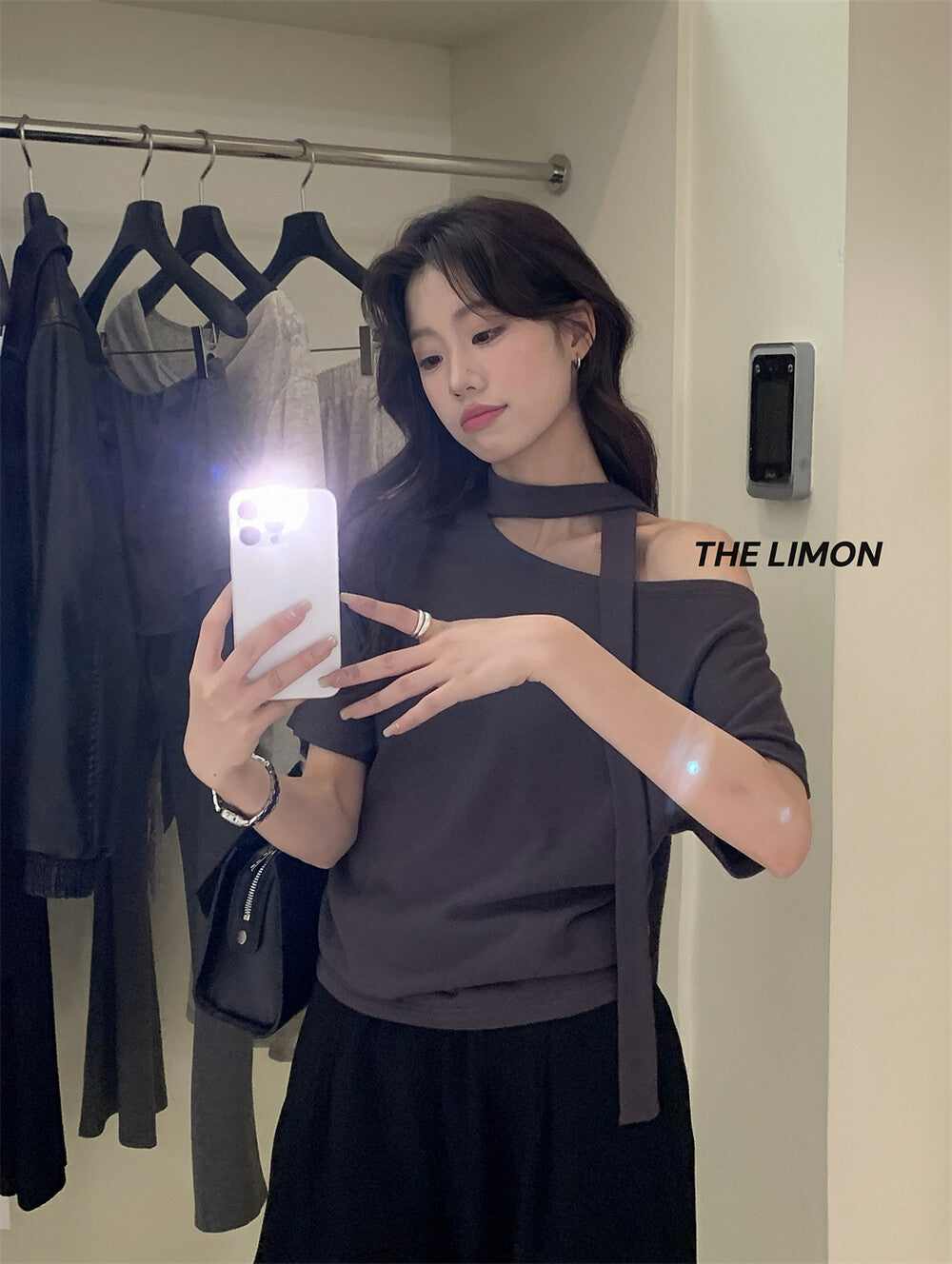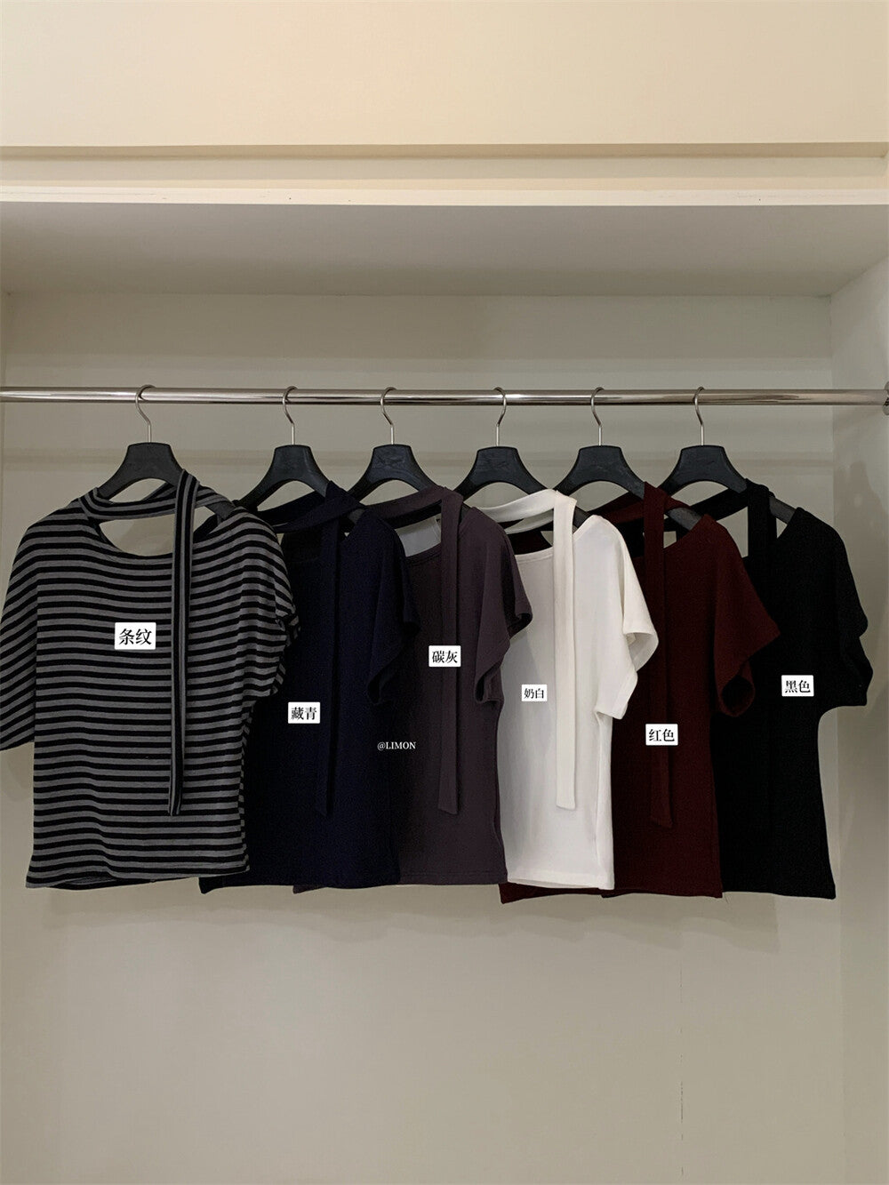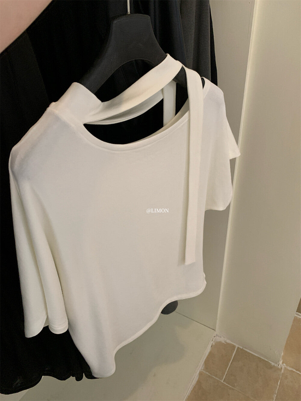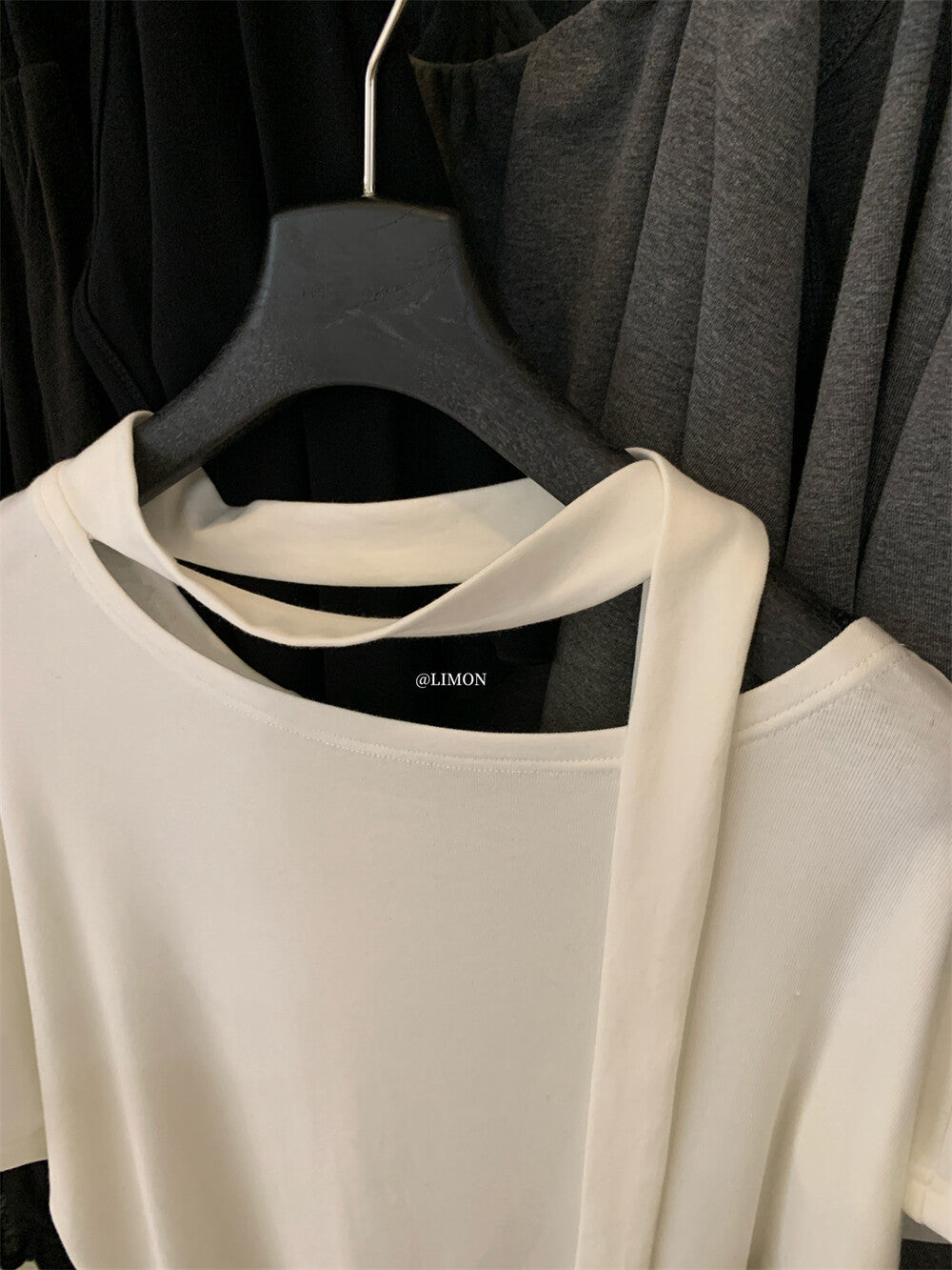 【L1128】實拍檸檬家慵懶羊絨斜肩T恤+飄帶250901
