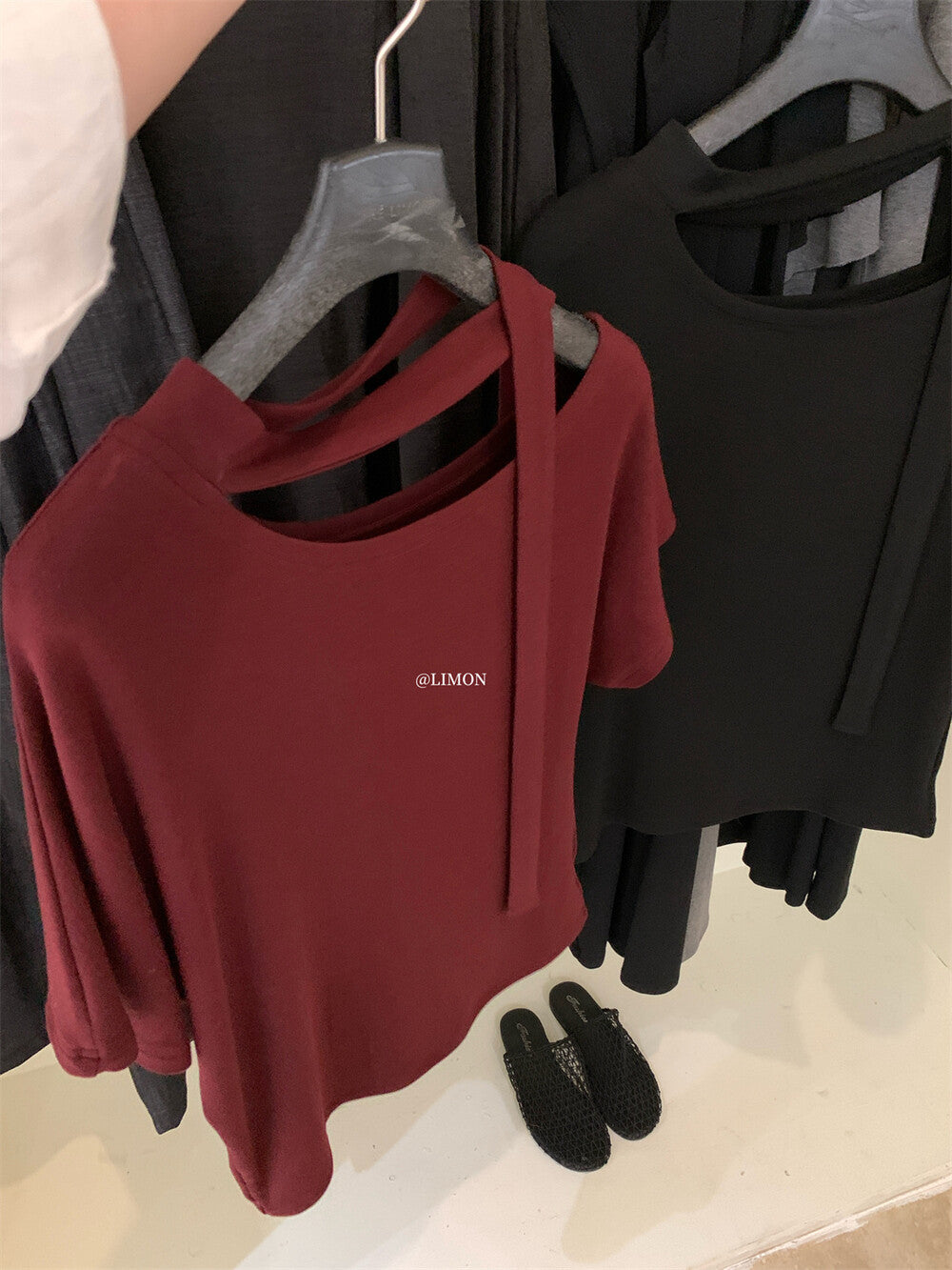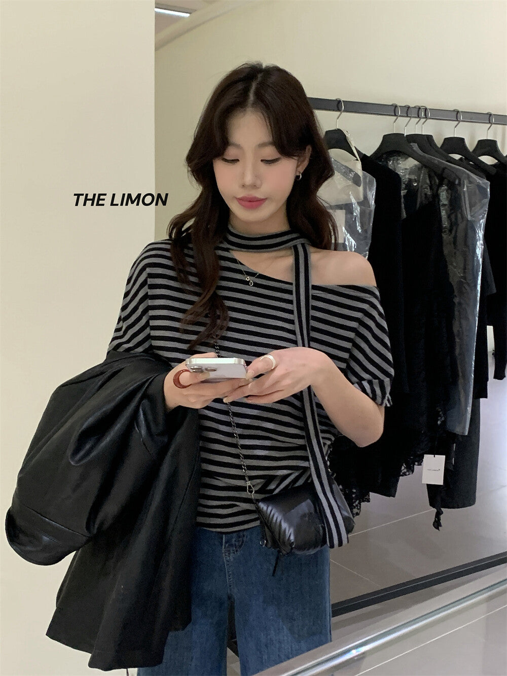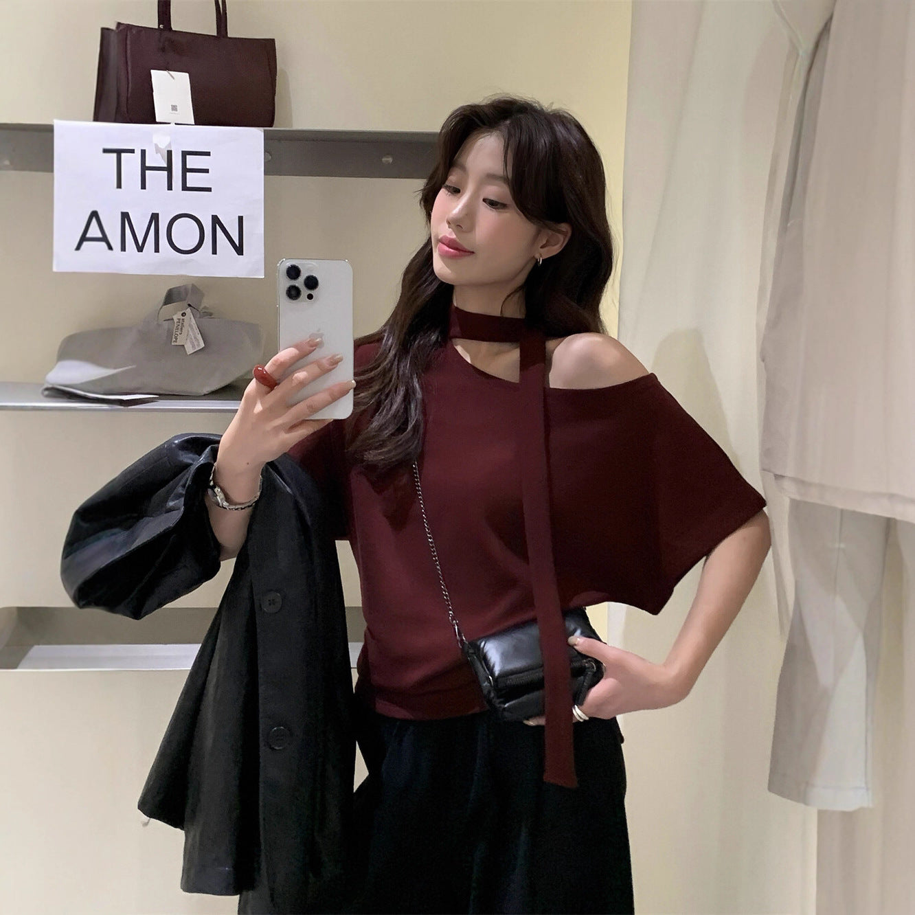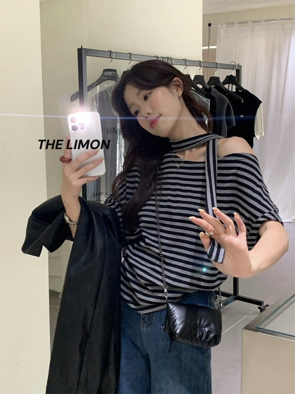 【L1128】實拍檸檬家慵懶羊絨斜肩T恤+飄帶250901