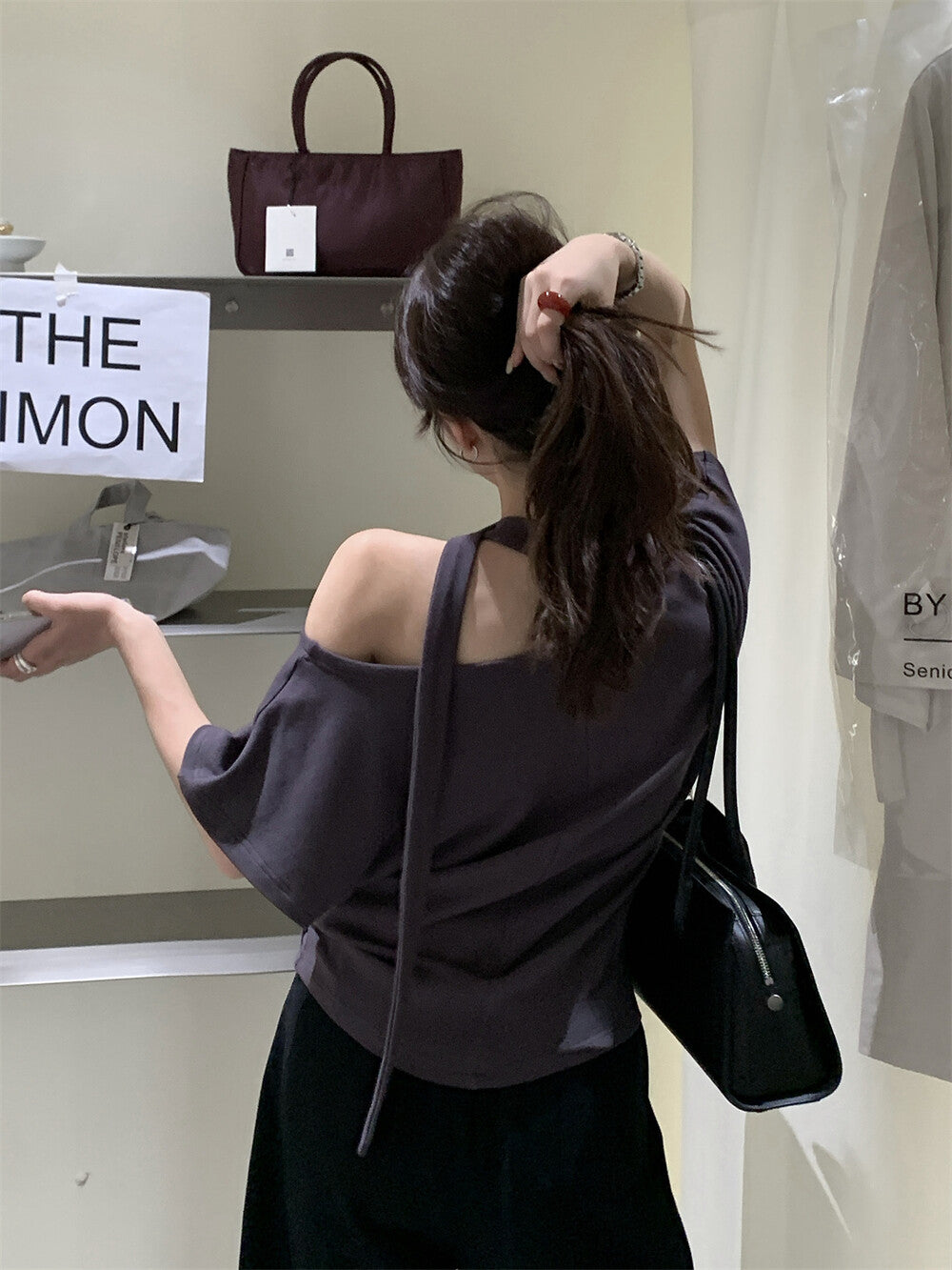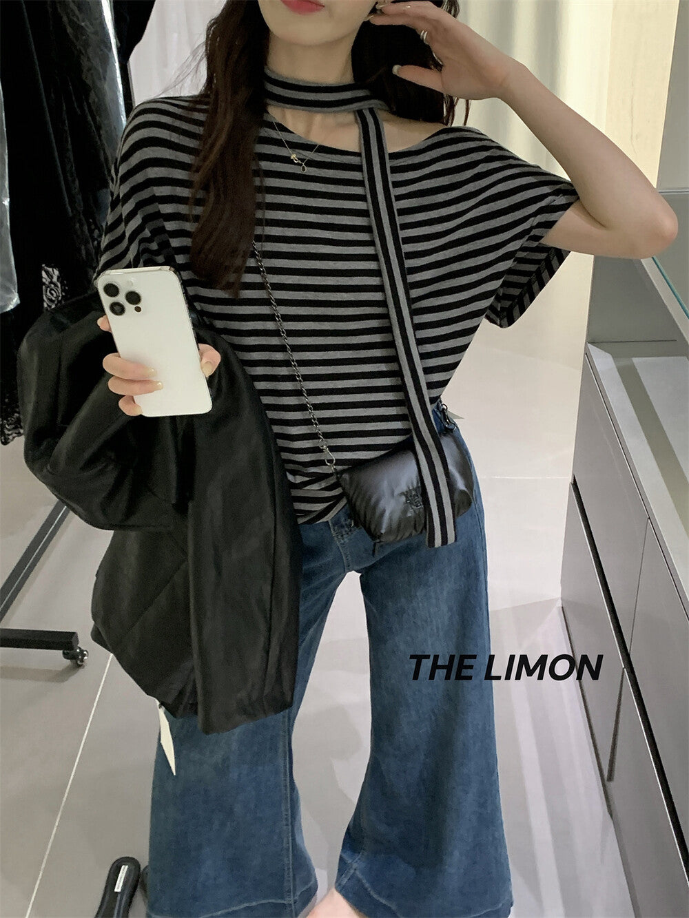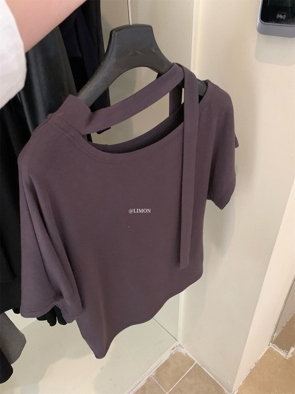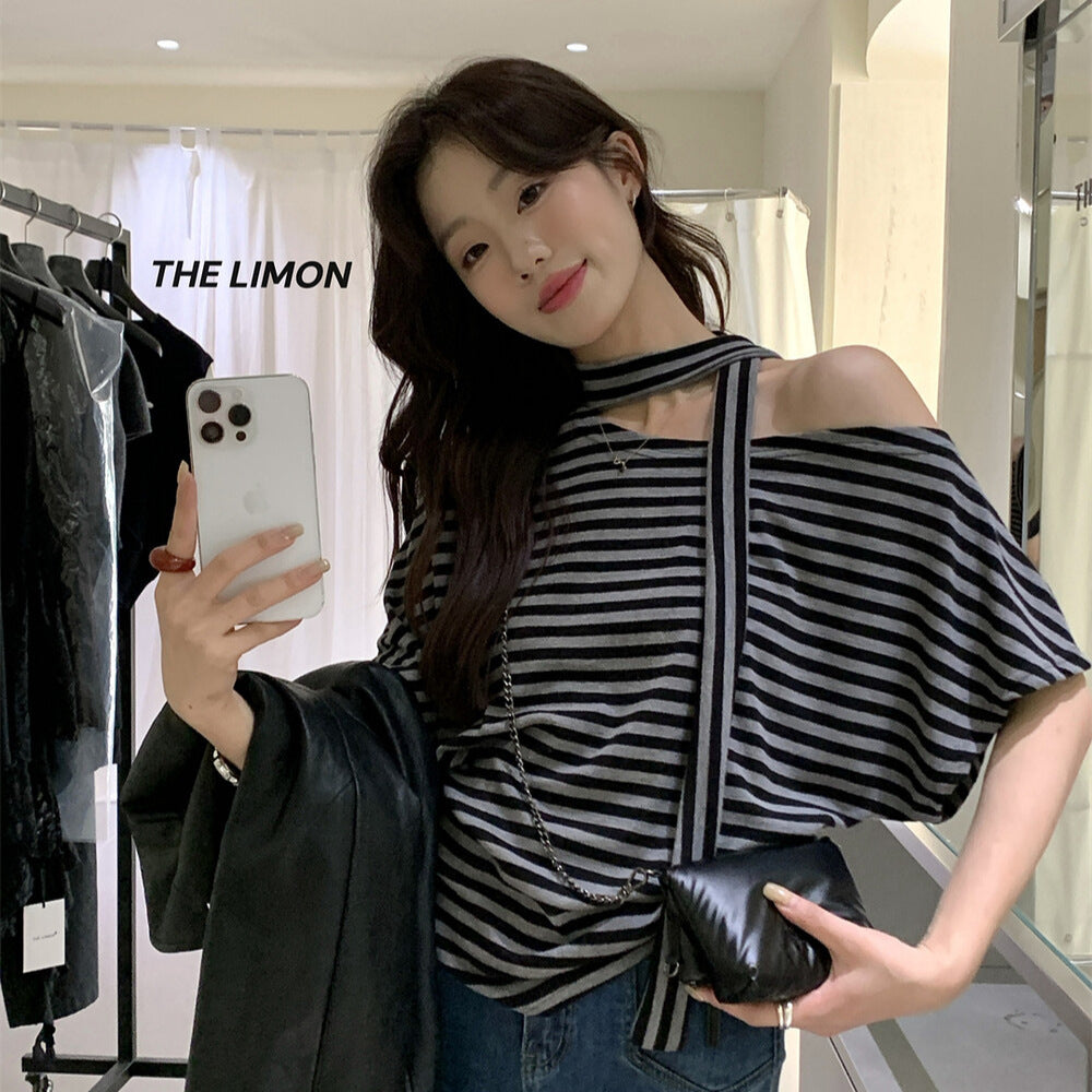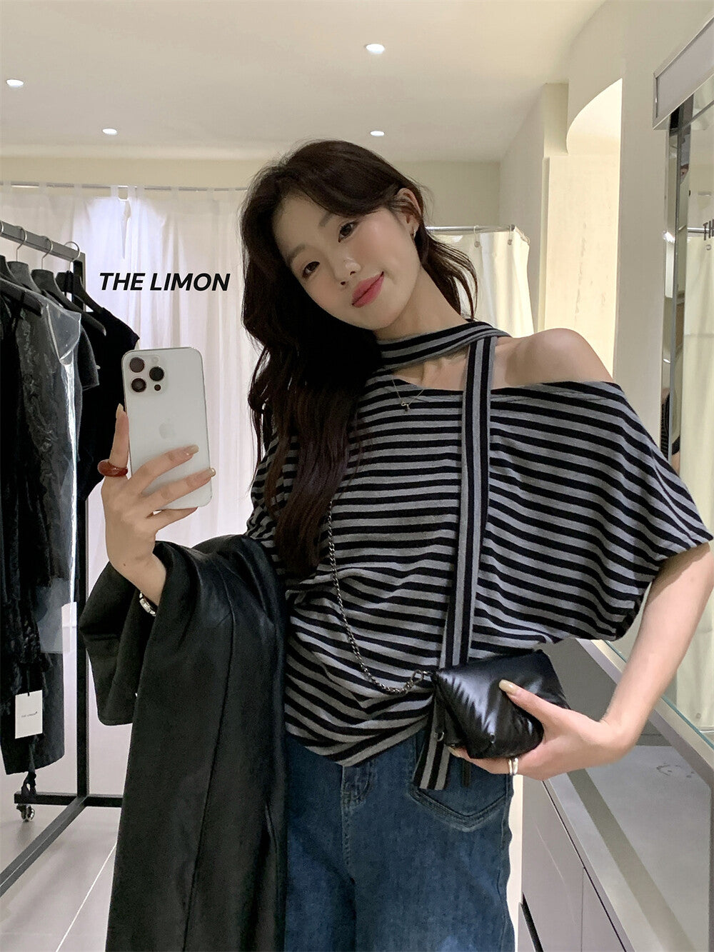 【L1128】實拍檸檬家慵懶羊絨斜肩T恤+飄帶250901