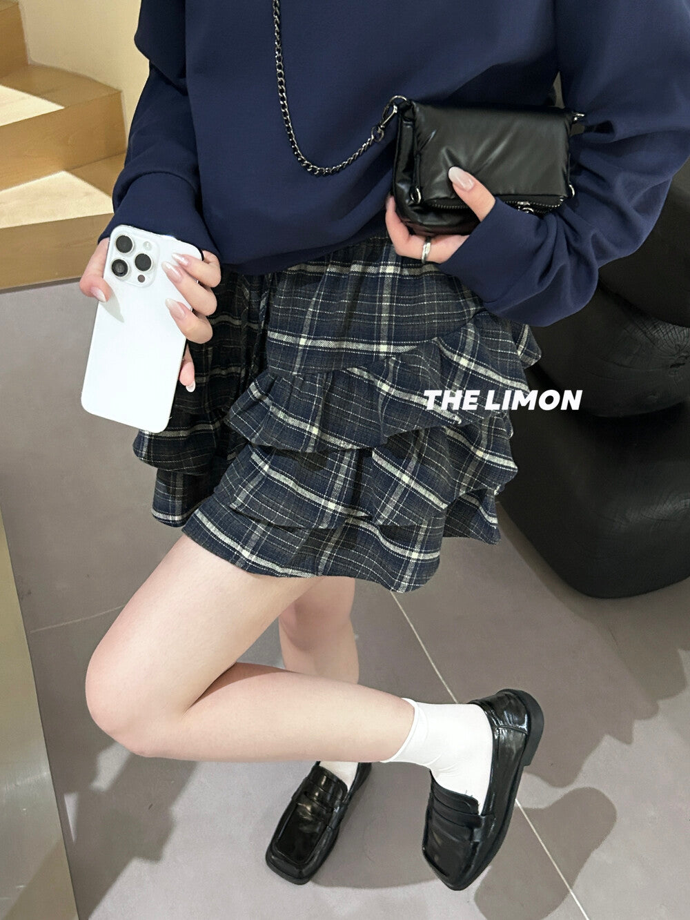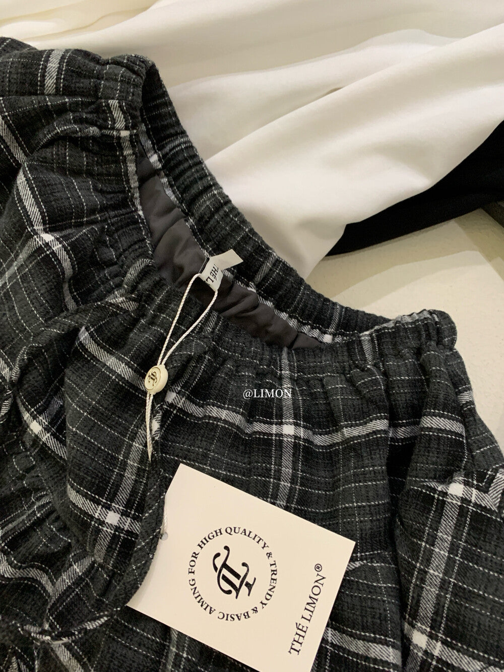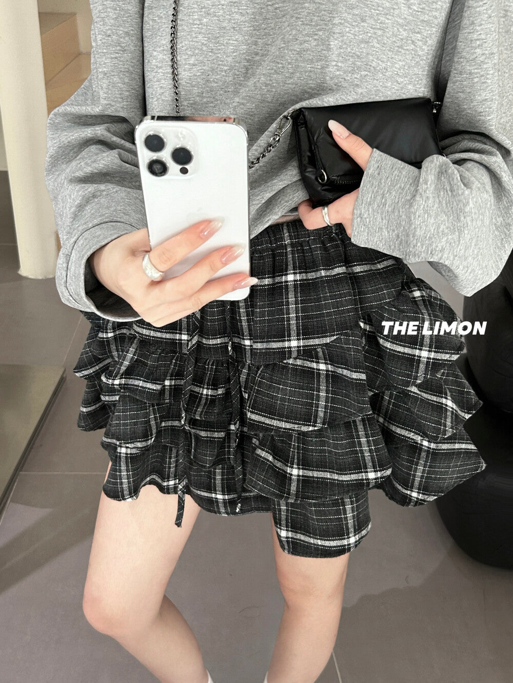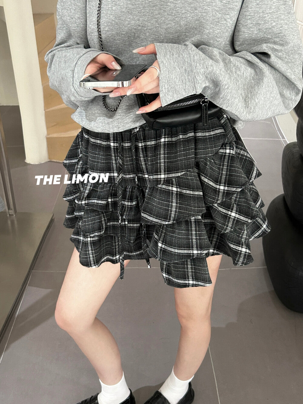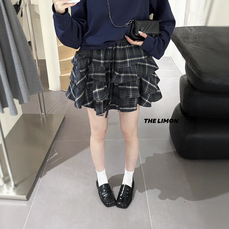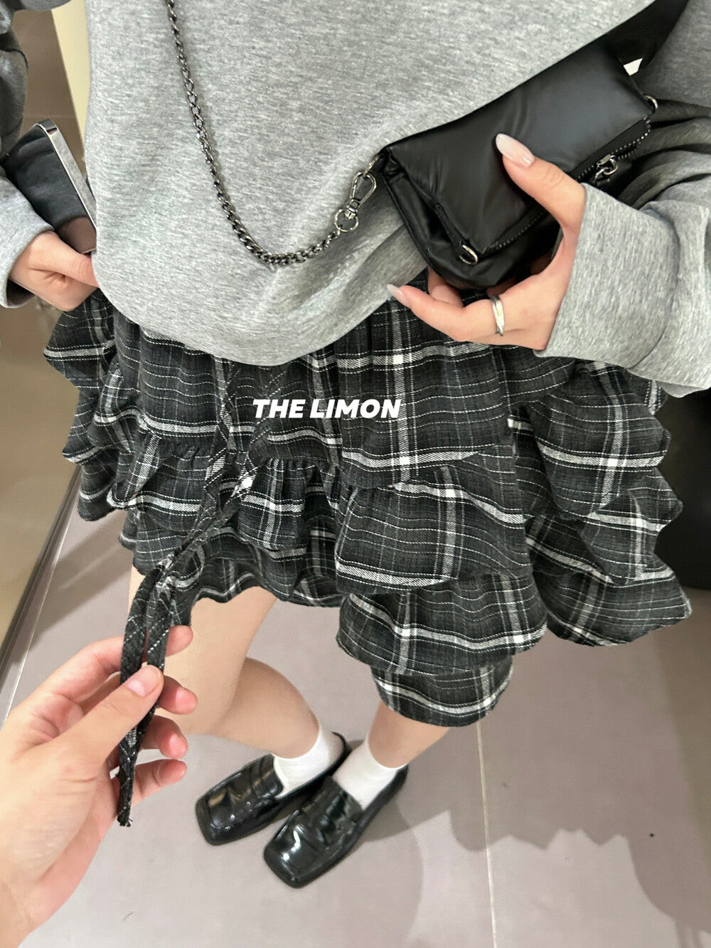 【L1139】實拍檸檬秋季磨毛復古格紋繫帶蛋糕裙250915