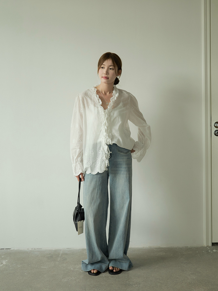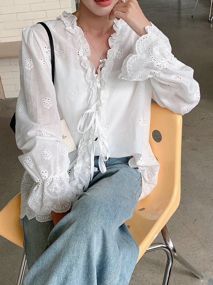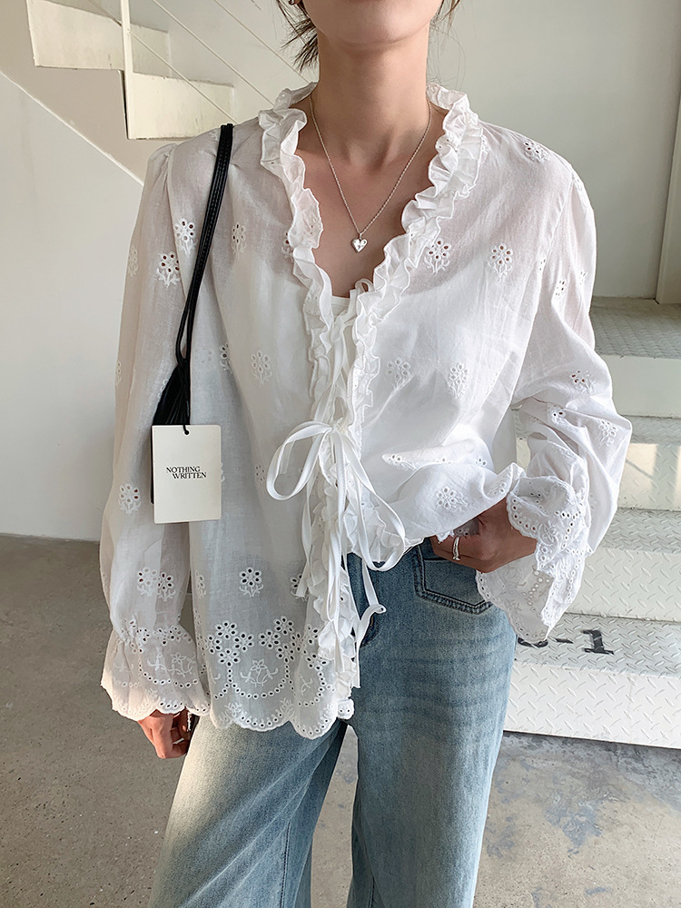 【L2757】實拍韓系氣質荷葉邊繫帶長袖罩衫250825