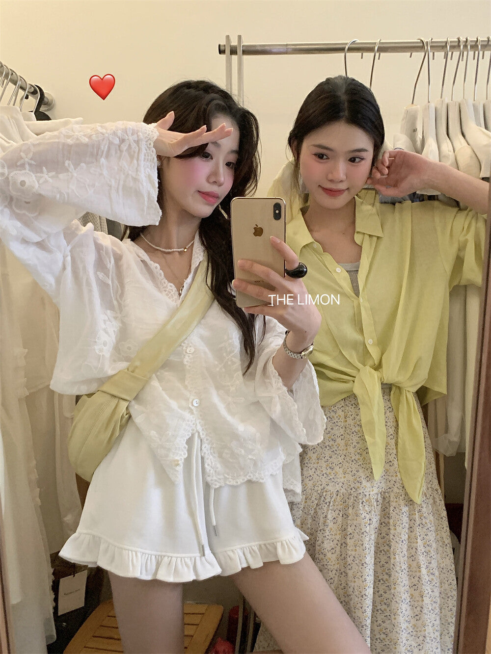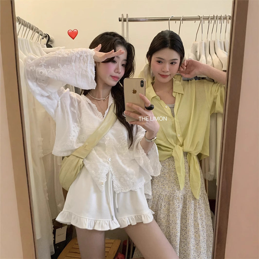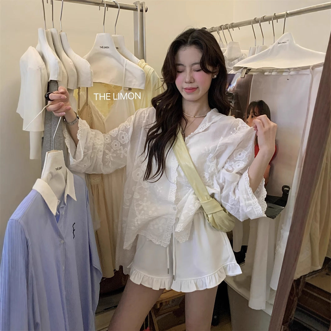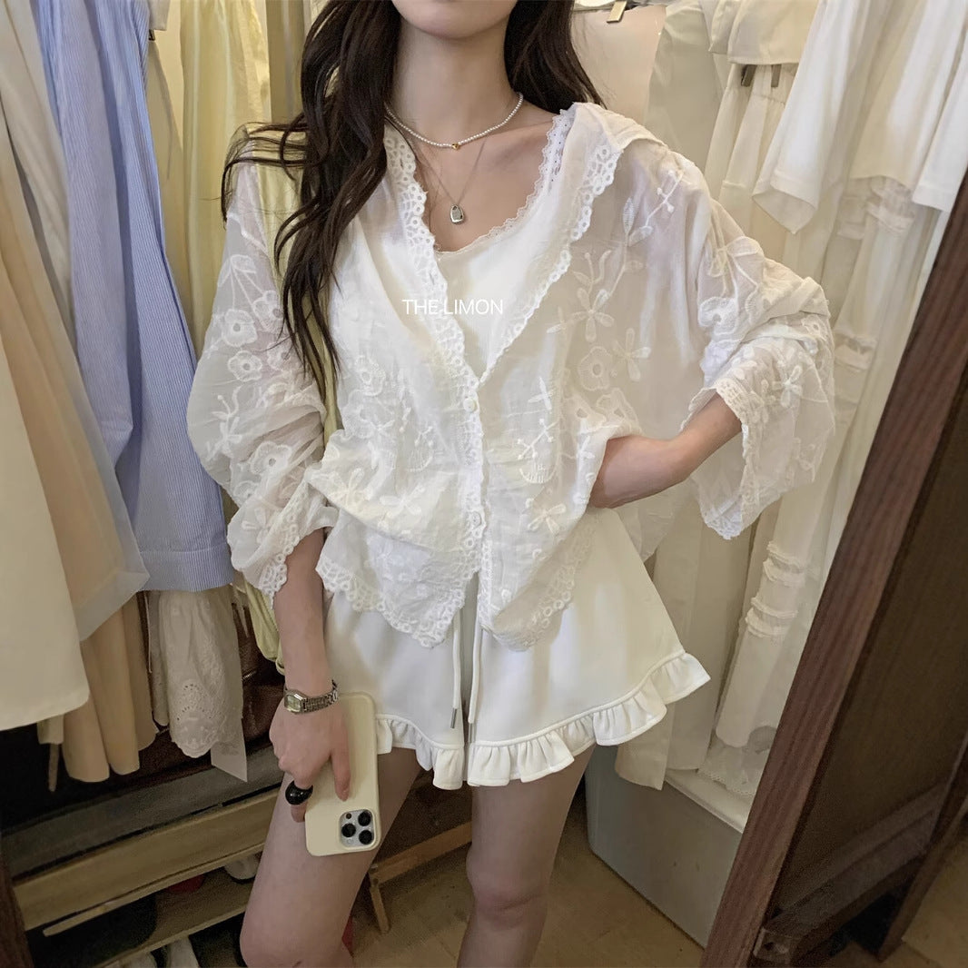 【L8509】實拍檸檬春夏蕾絲刺繡連帽長袖襯衫250414