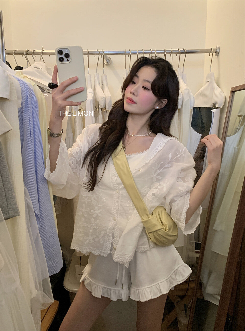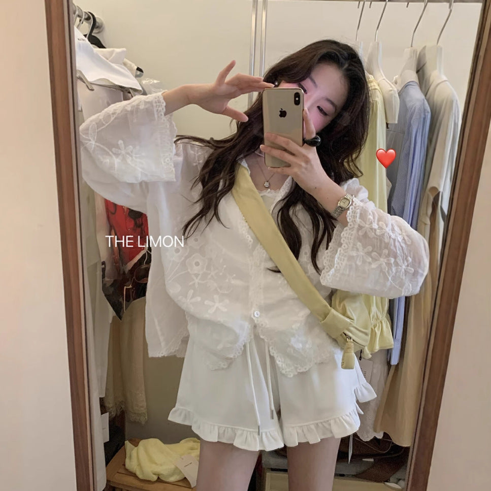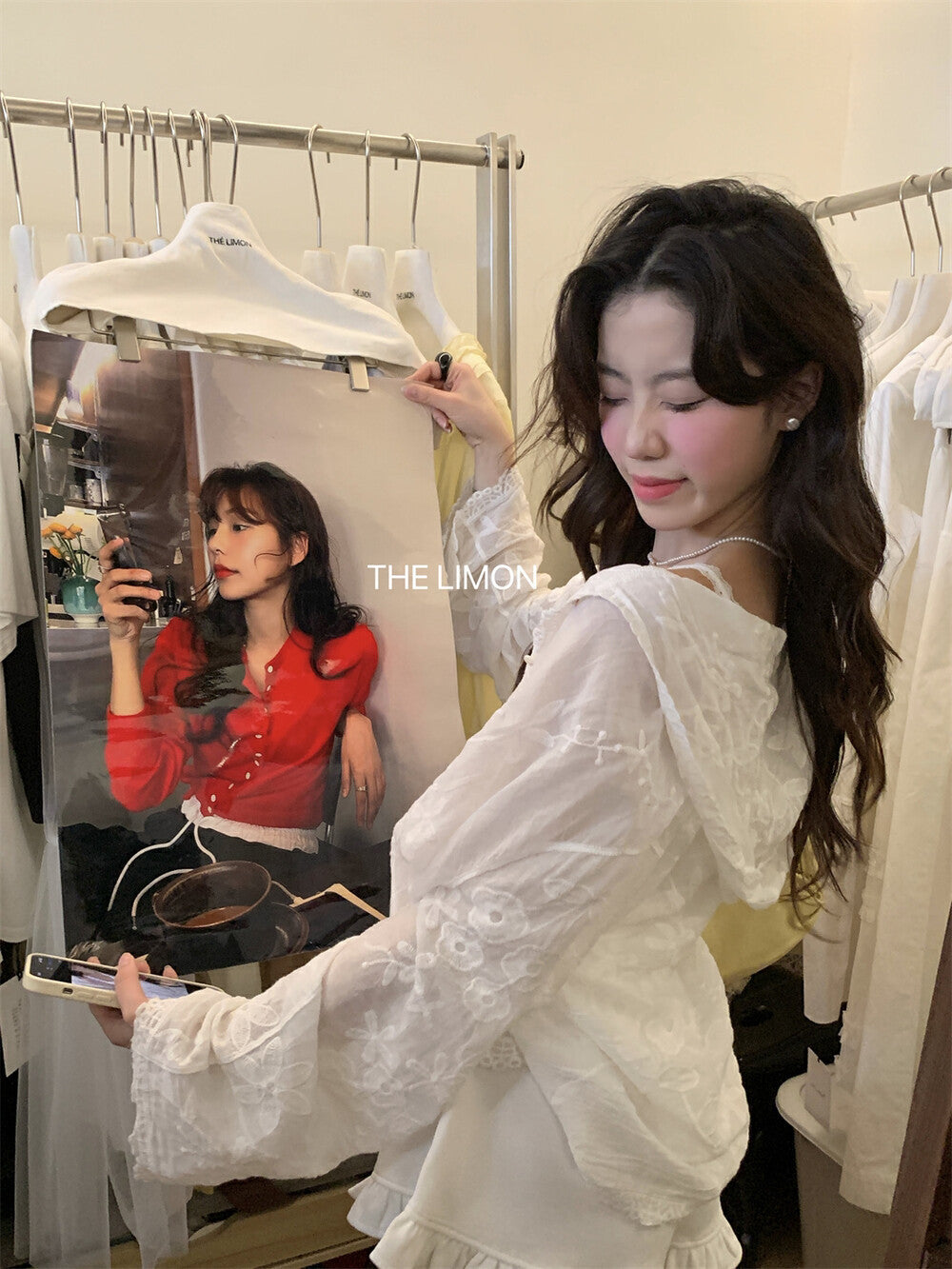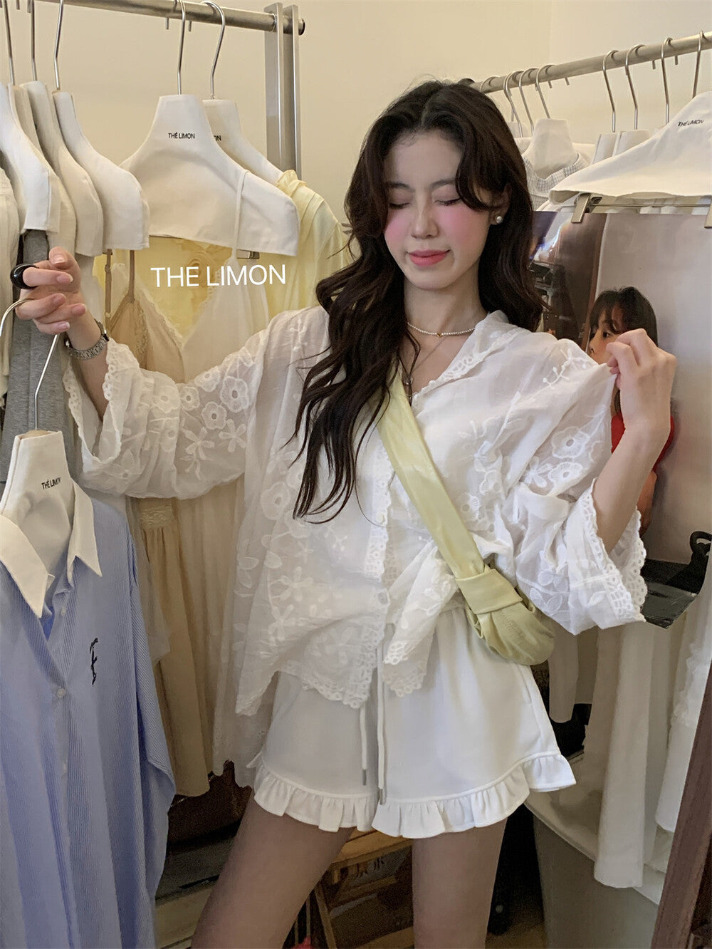 【L8509】實拍檸檬春夏蕾絲刺繡連帽長袖襯衫250414