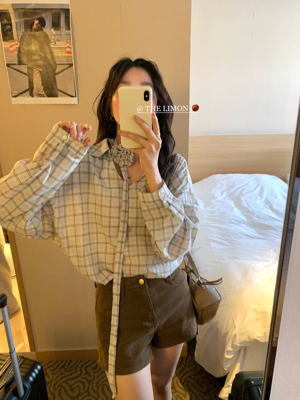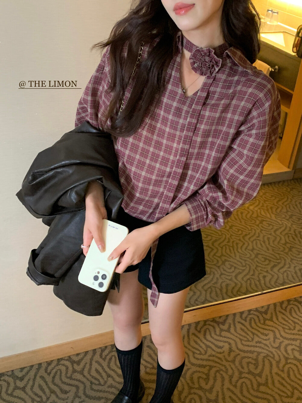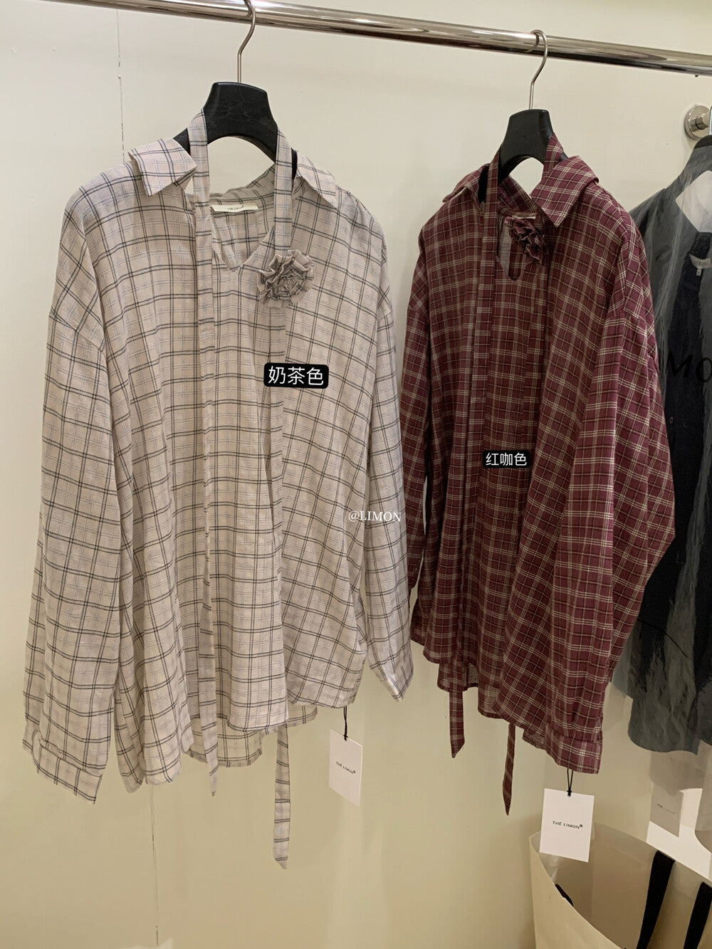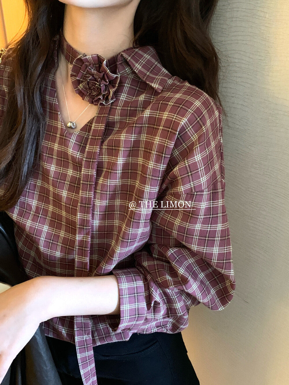 【L9113】實拍檸檬家早秋法式時髦復古格紋長袖襯衫+胸花可拆250901