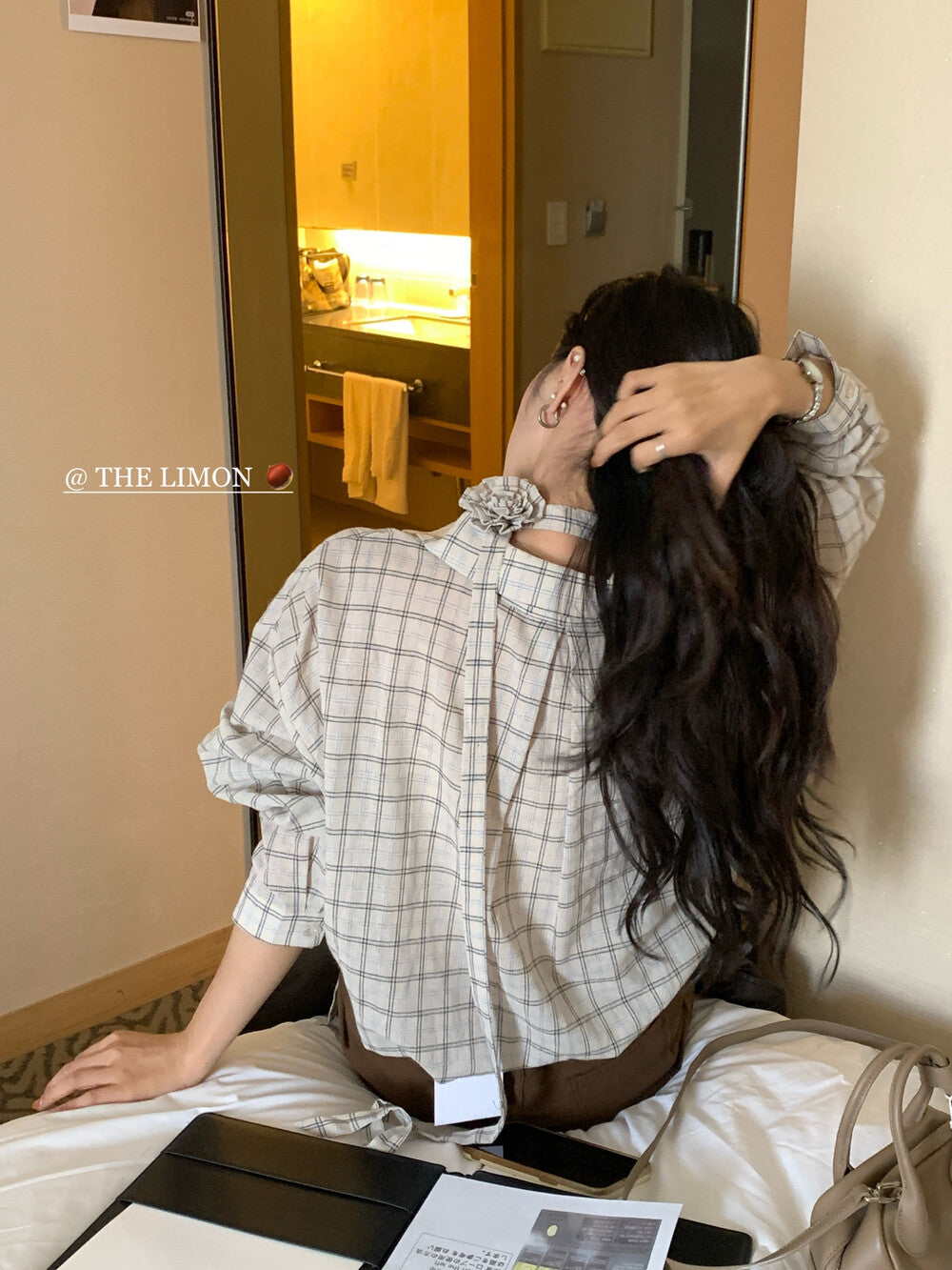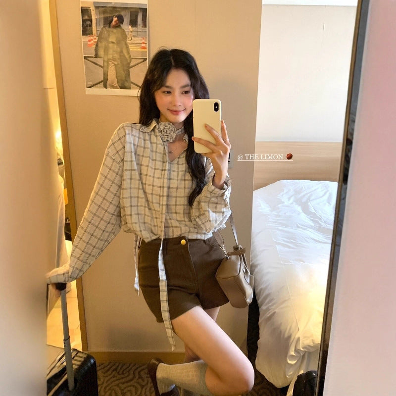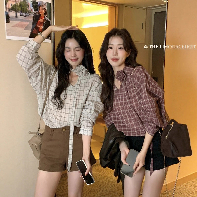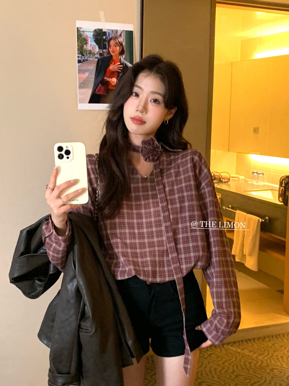 【L9113】實拍檸檬家早秋法式時髦復古格紋長袖襯衫+胸花可拆250901