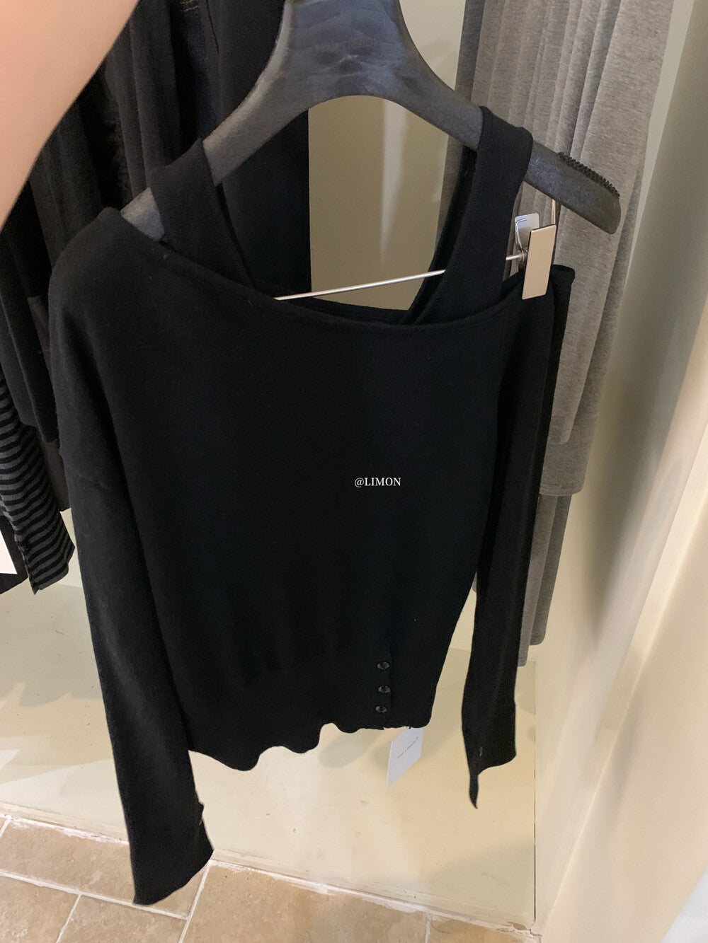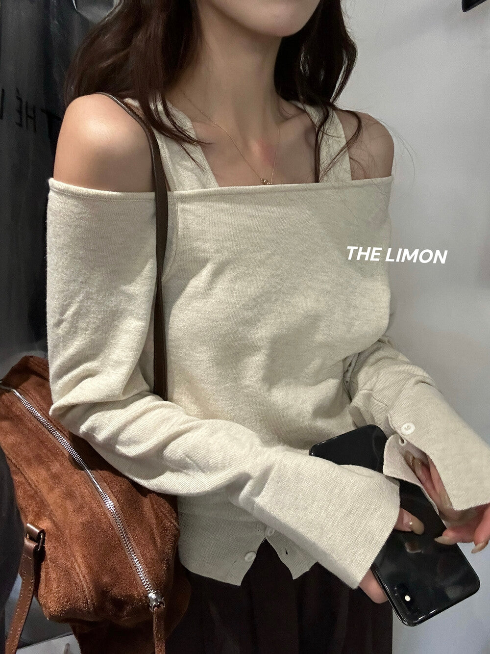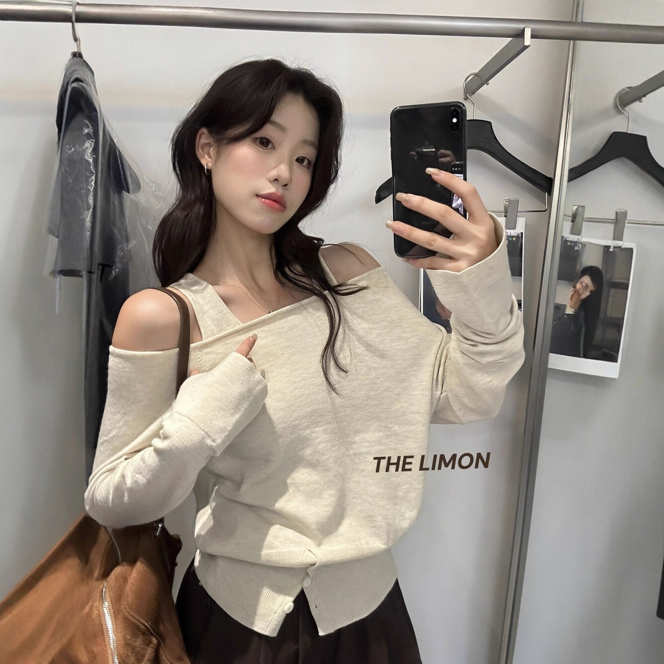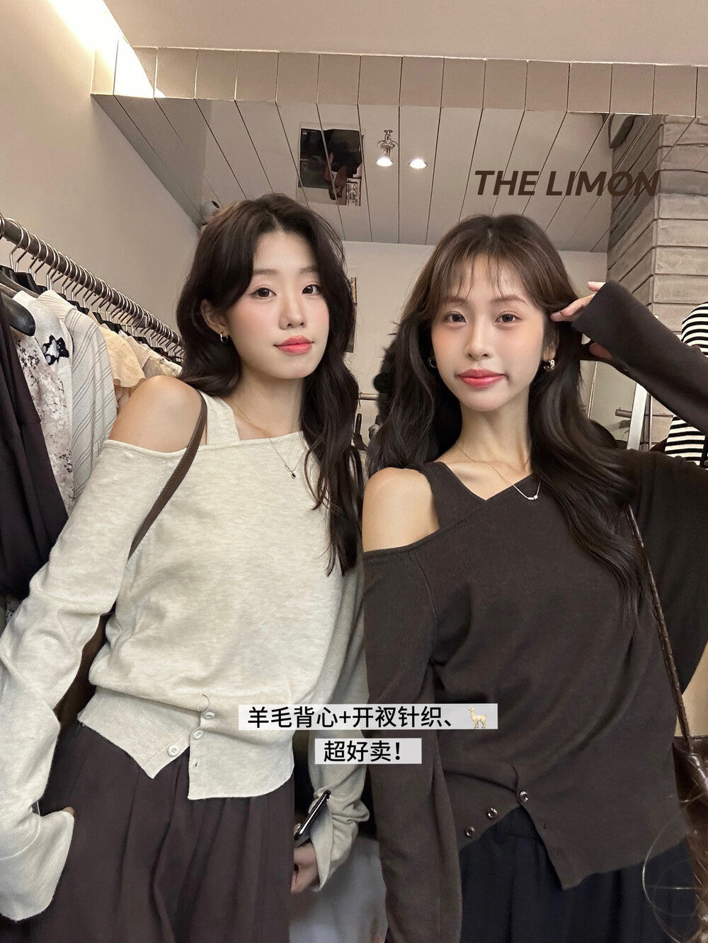【L99903】實拍檸檬家下擺紐扣斜肩長袖針織衫+內搭背心 2件套250901
