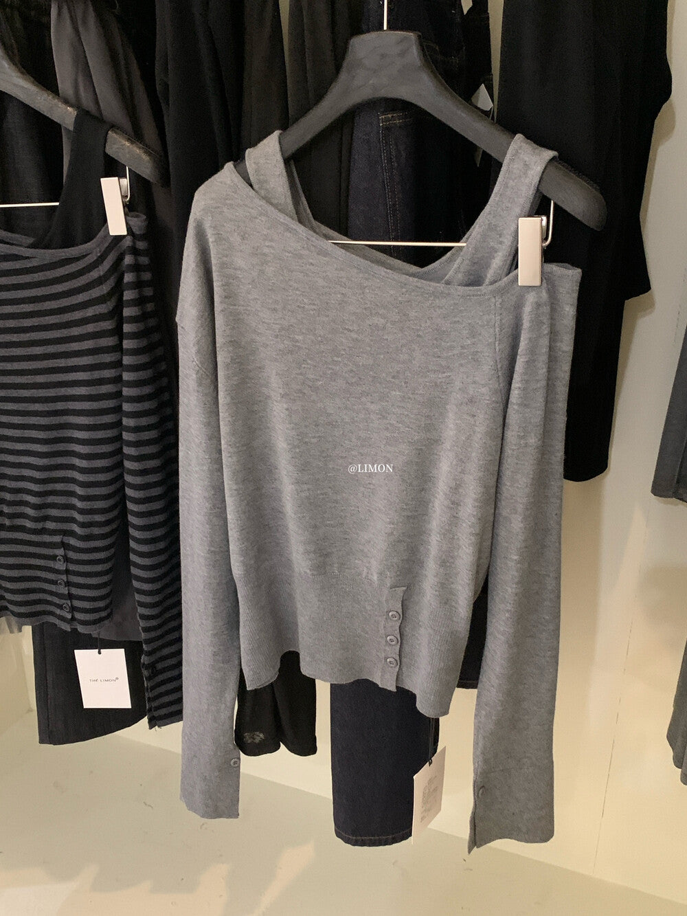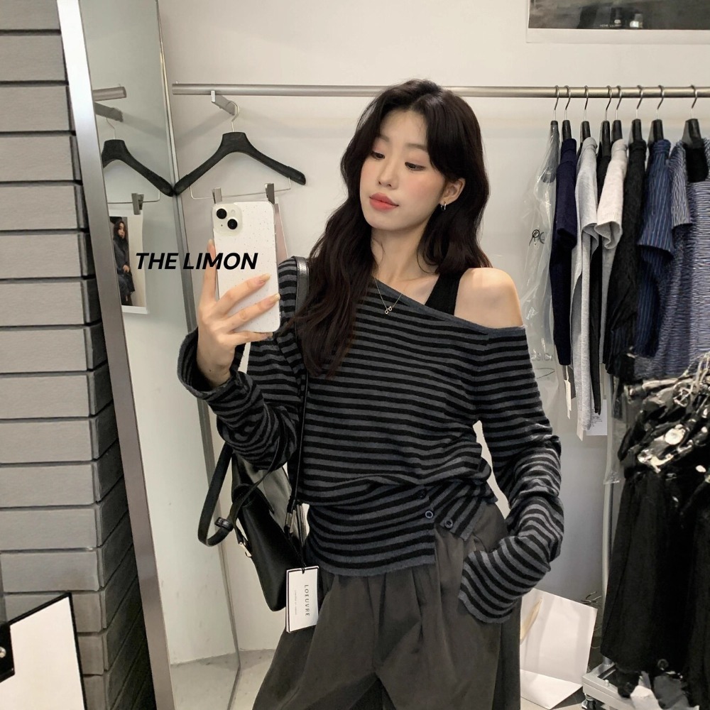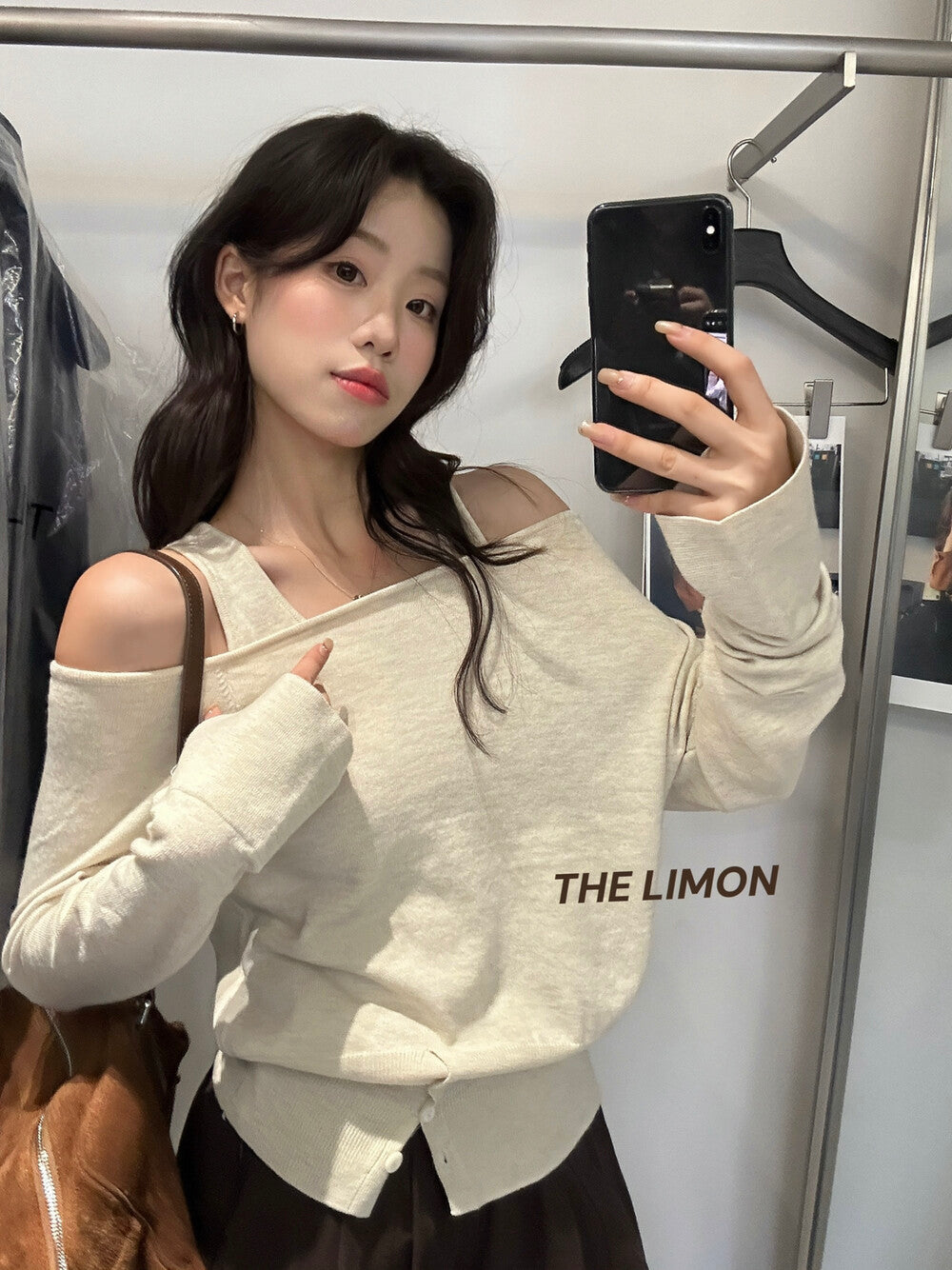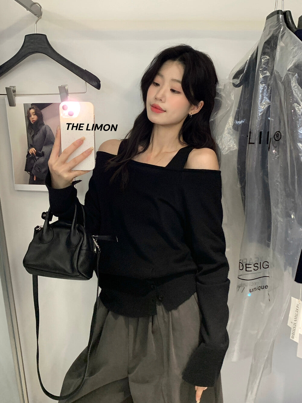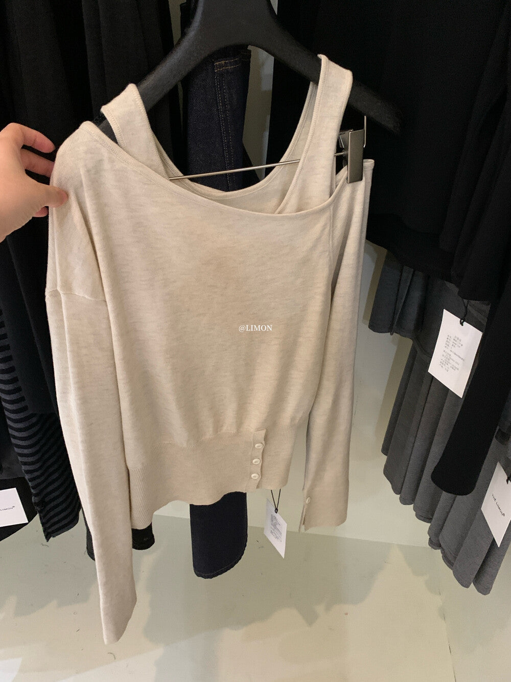 【L99903】實拍檸檬家下擺紐扣斜肩長袖針織衫+內搭背心 2件套250901