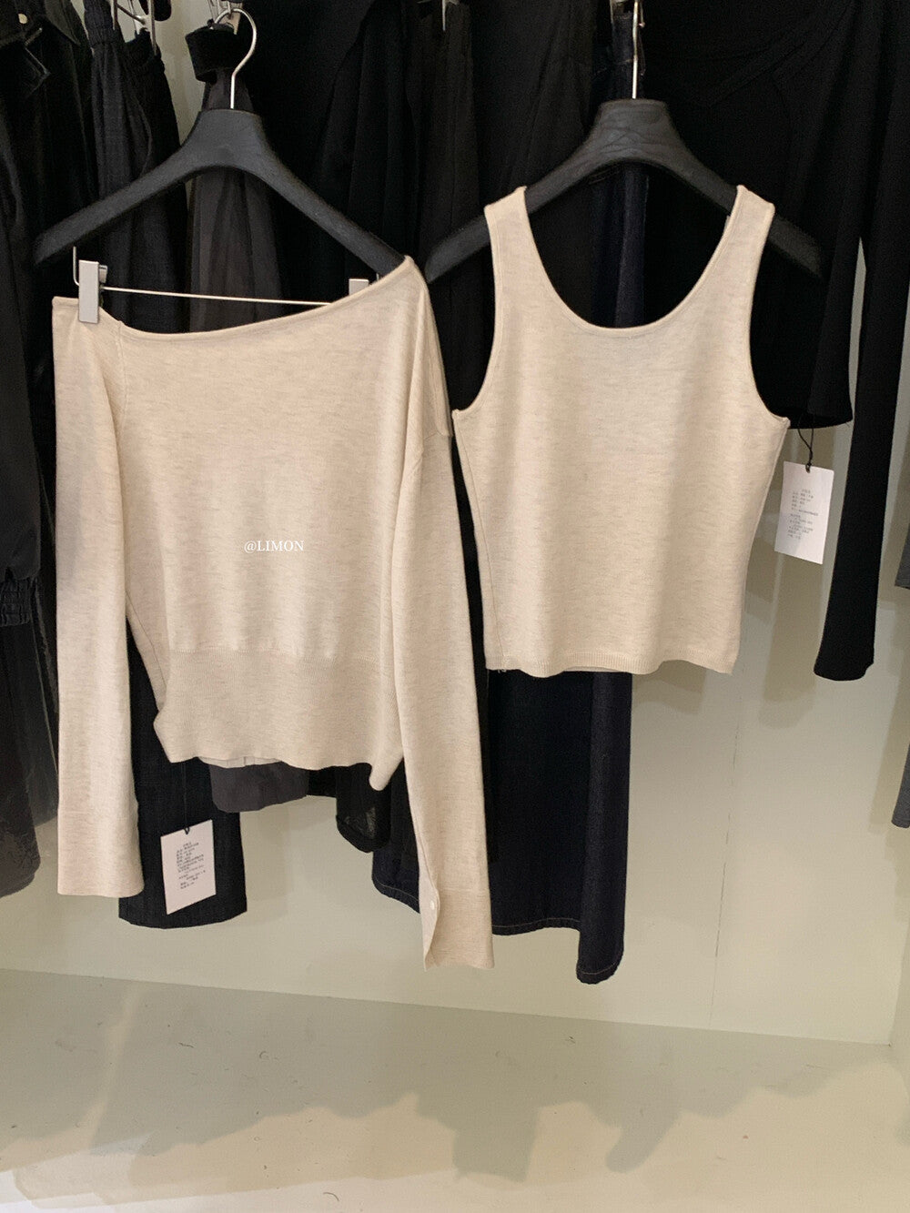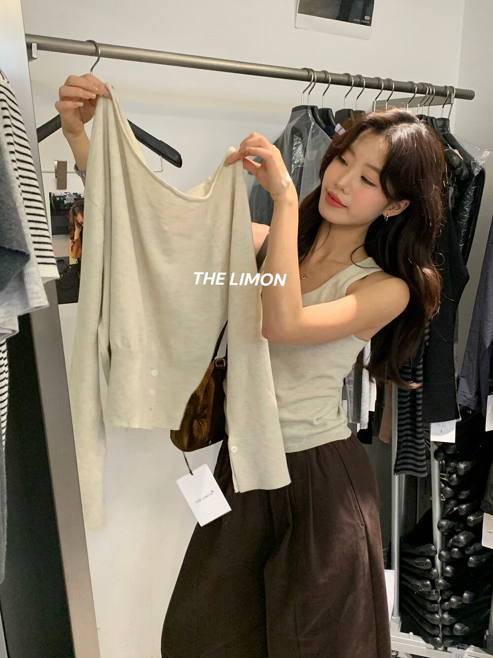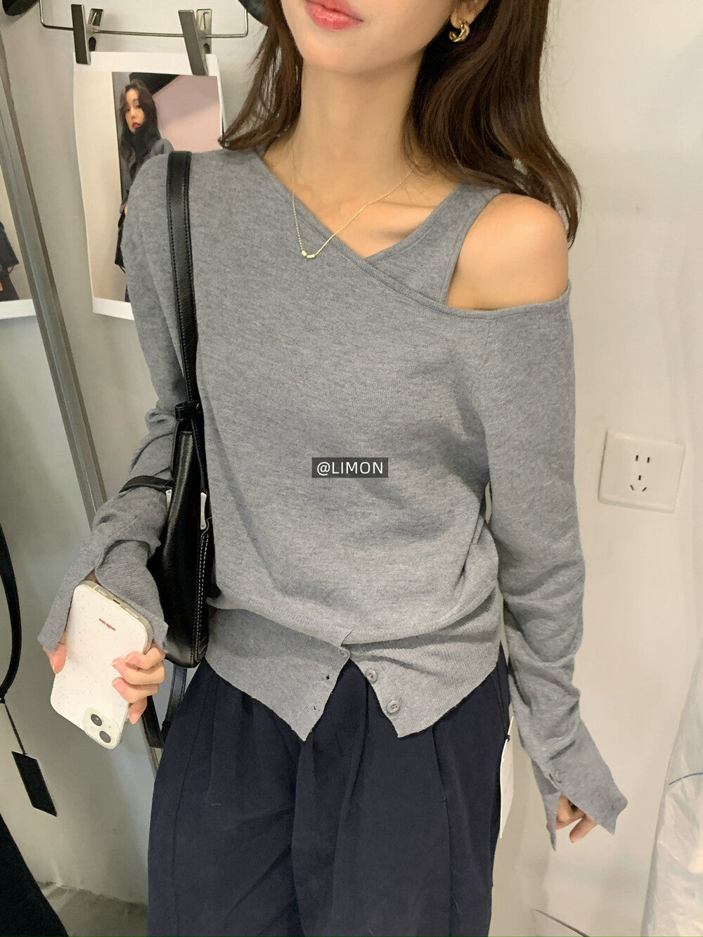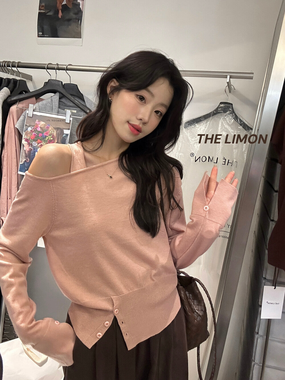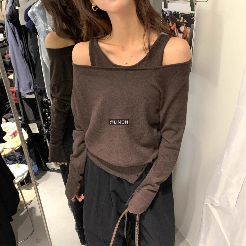 【L99903】實拍檸檬家下擺紐扣斜肩長袖針織衫+內搭背心 2件套250901