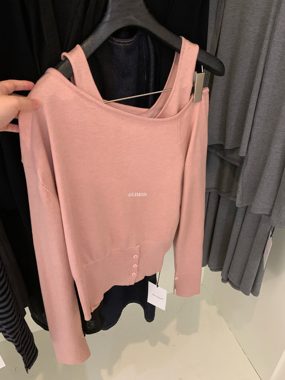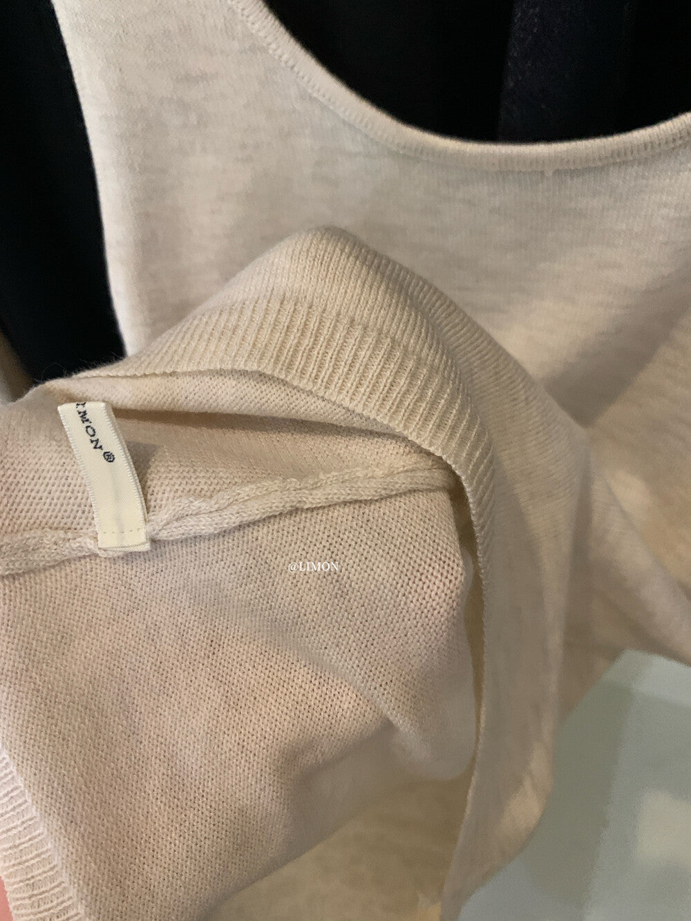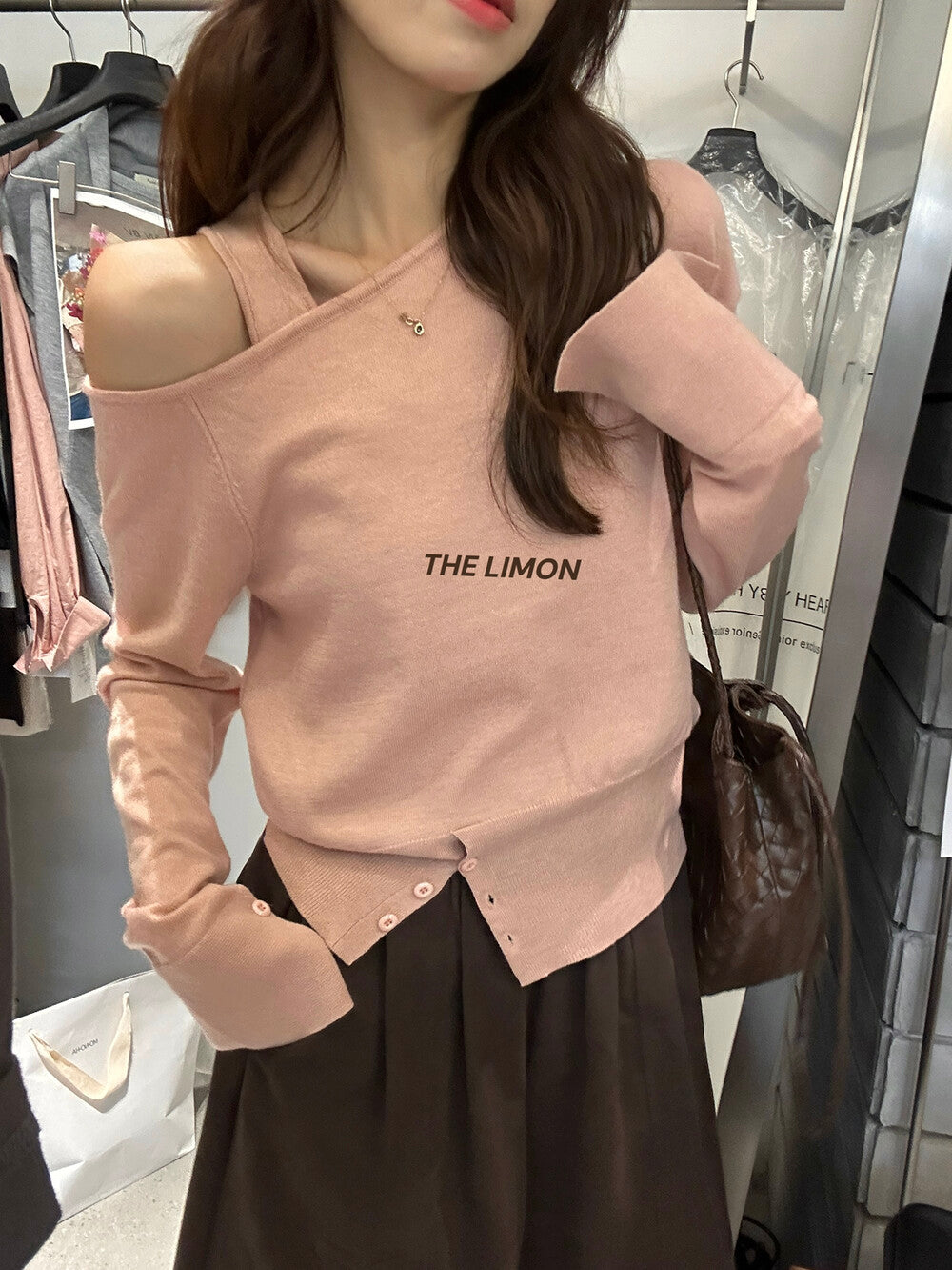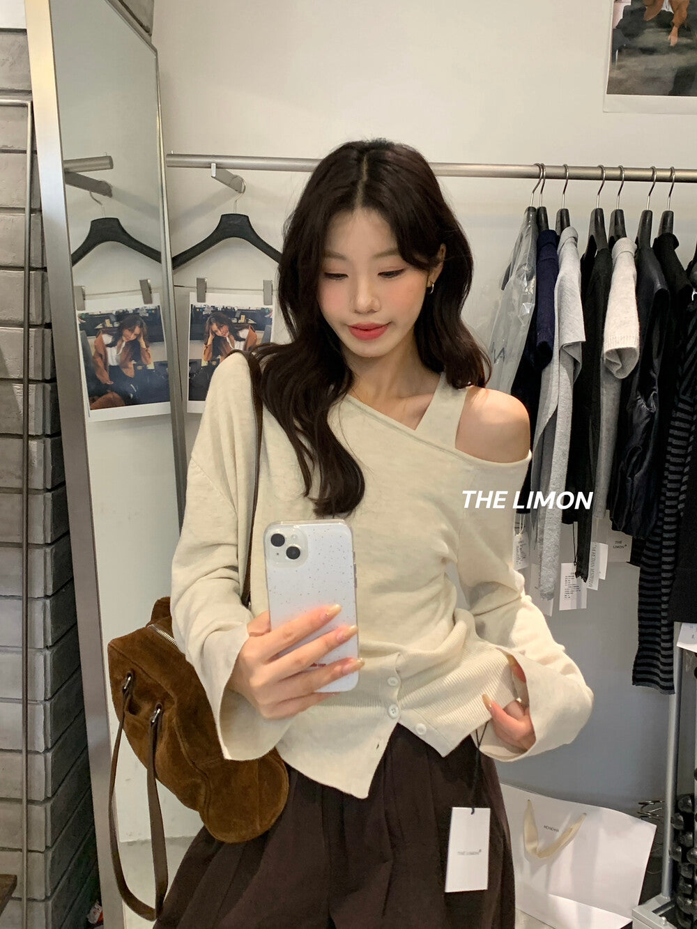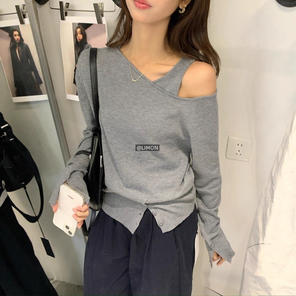 【L99903】實拍檸檬家下擺紐扣斜肩長袖針織衫+內搭背心 2件套250901