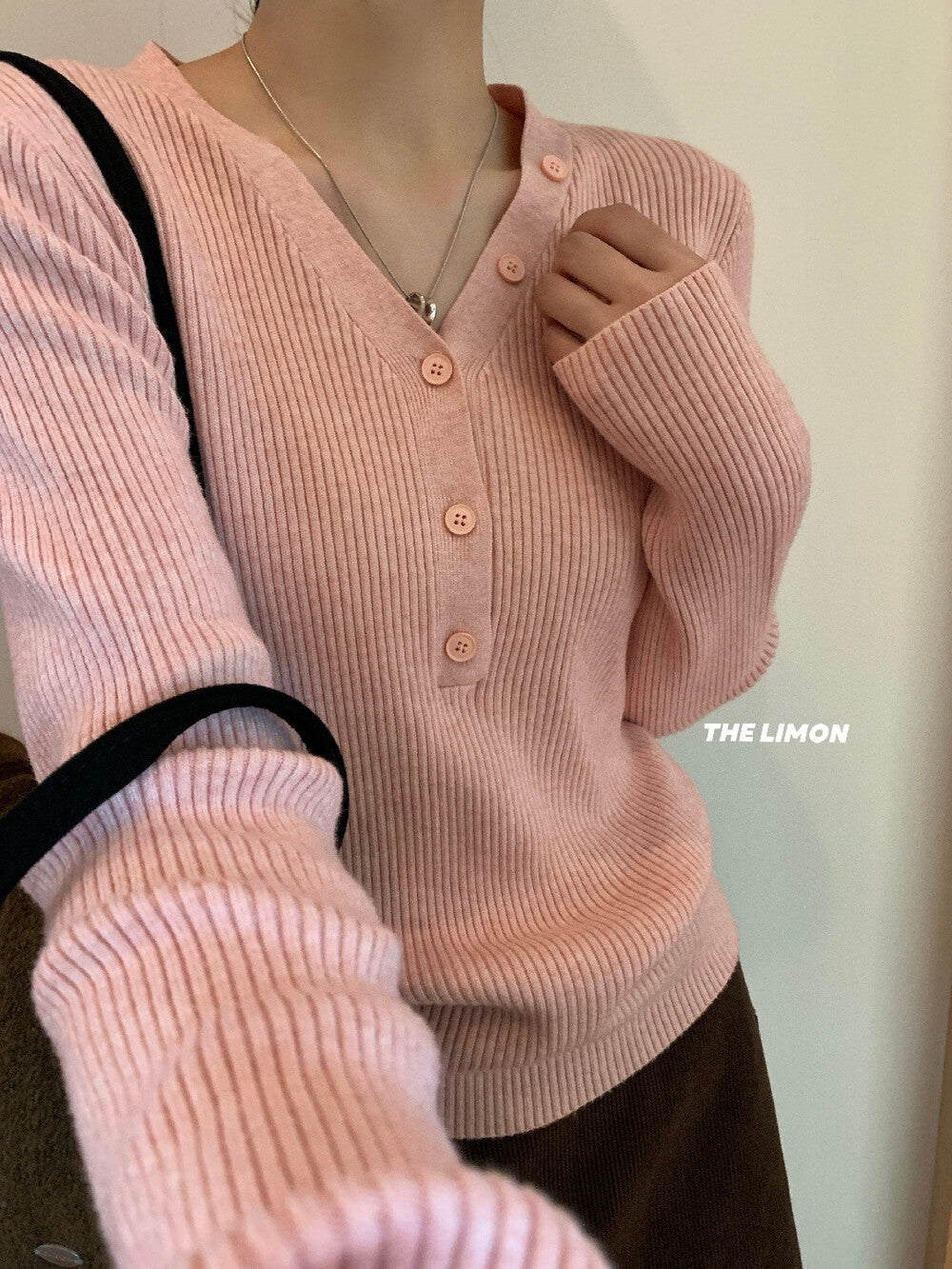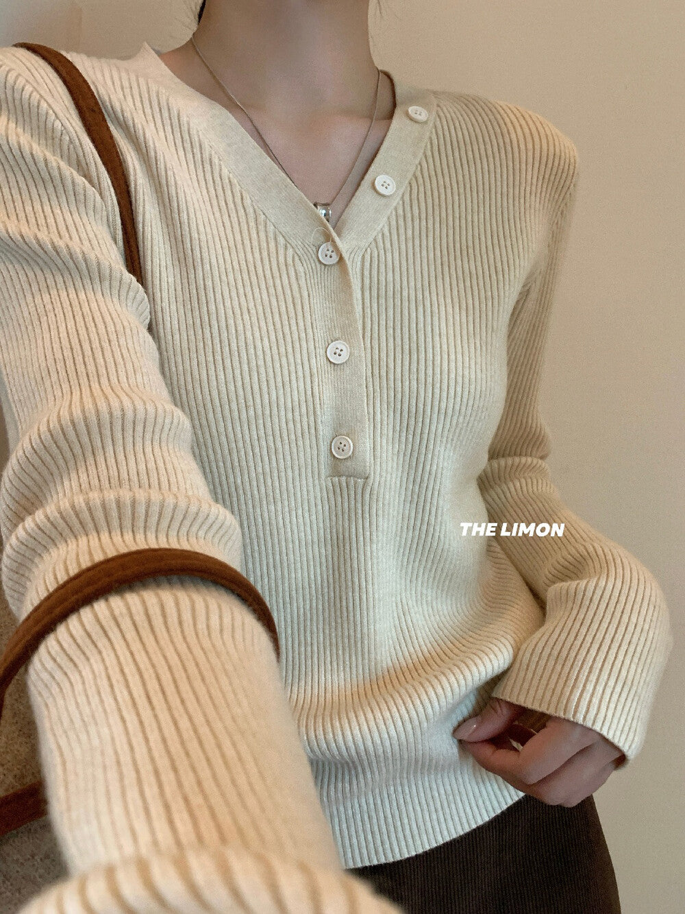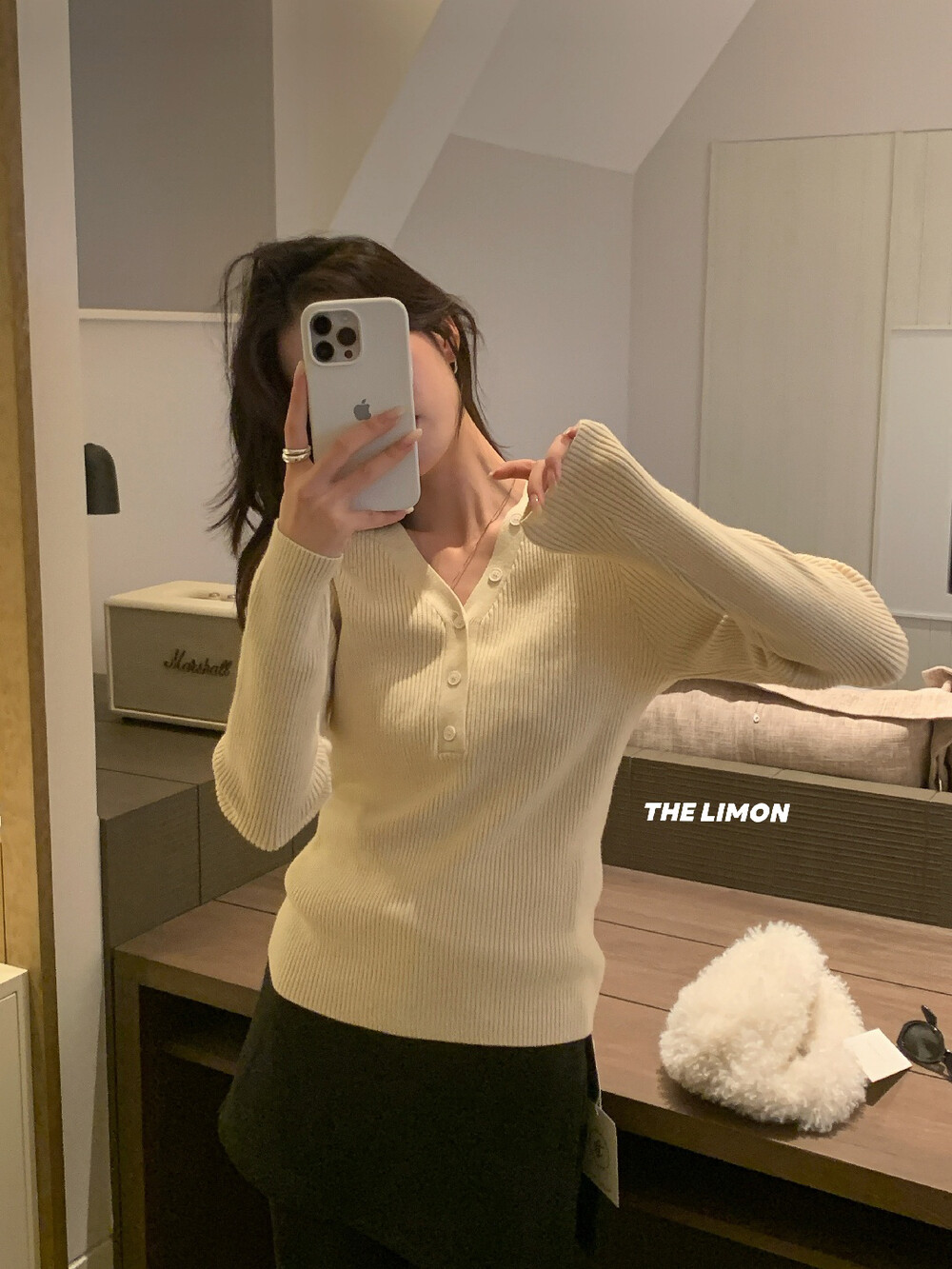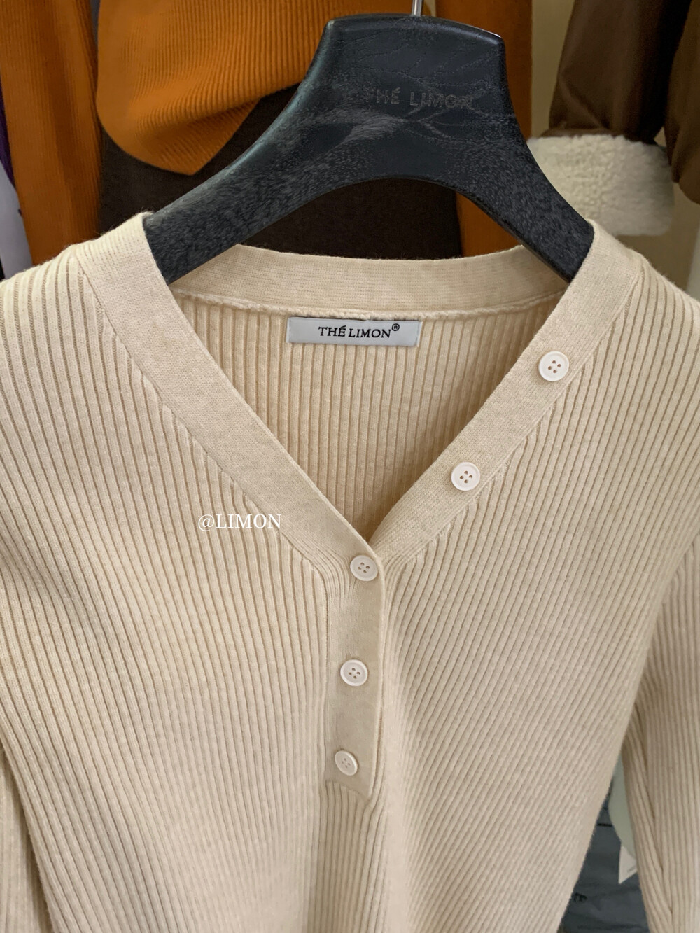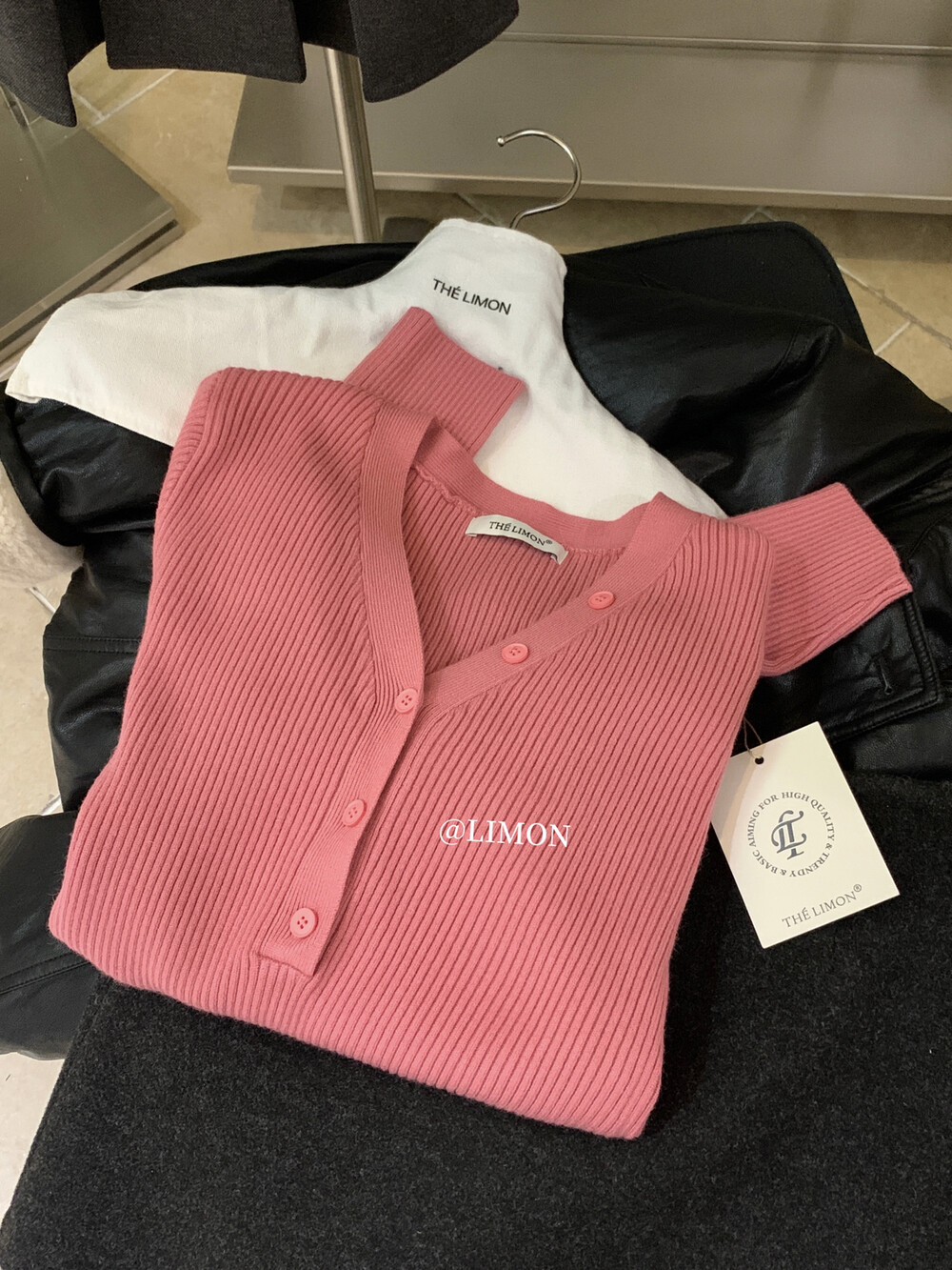 【L99909】檸檬秋冬超修身V領纽扣長袖針織衫251117