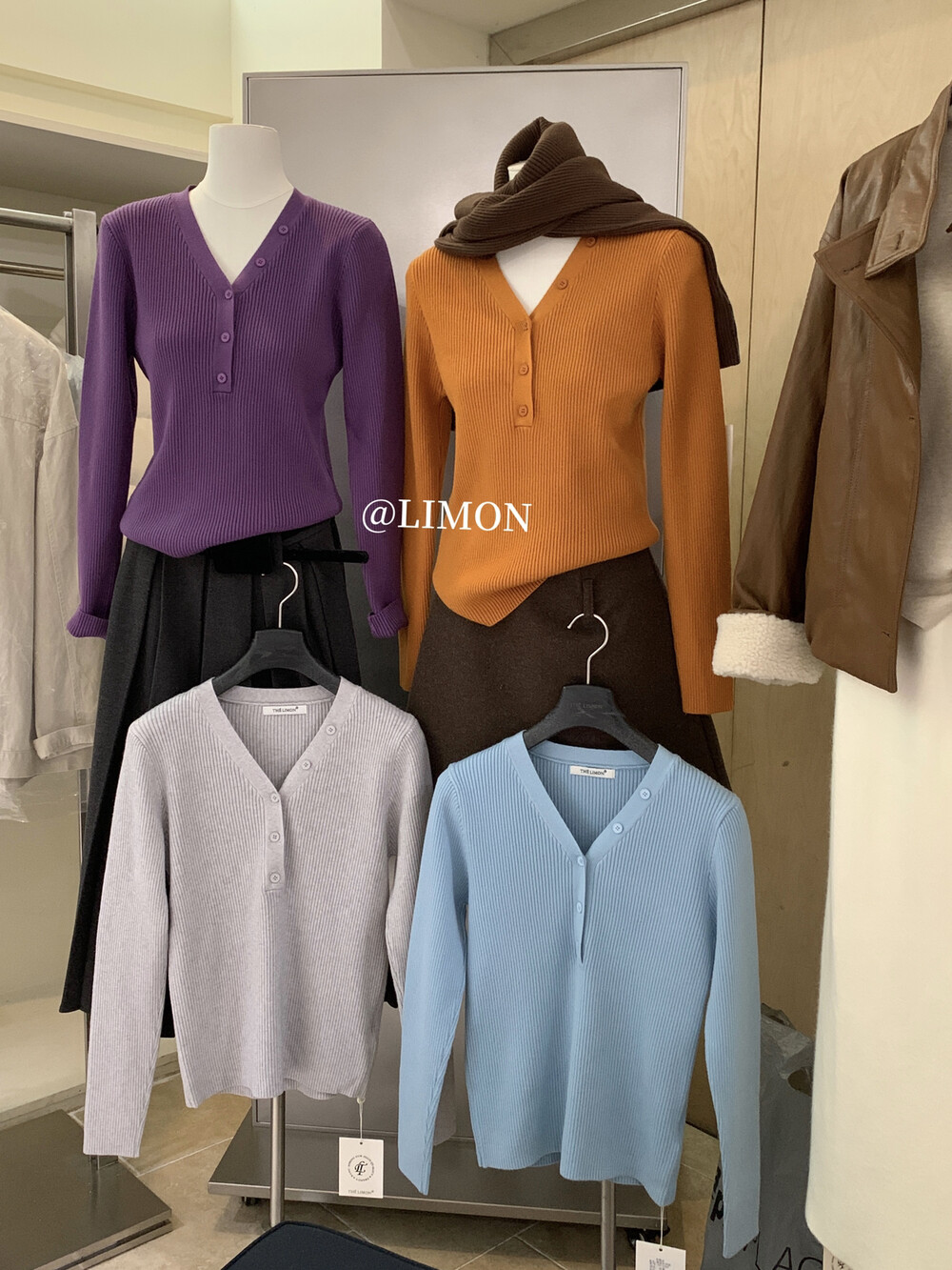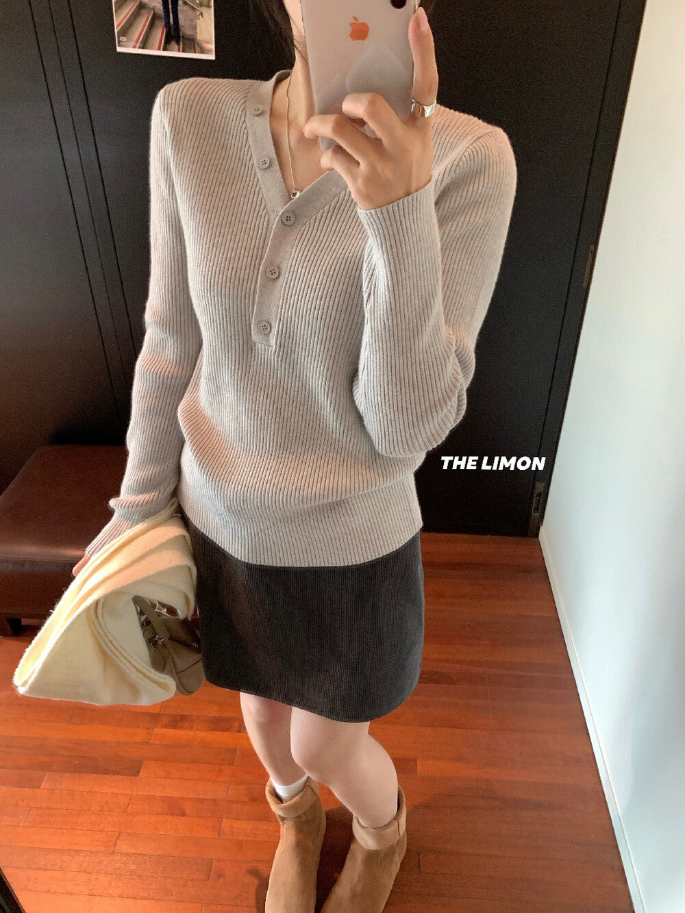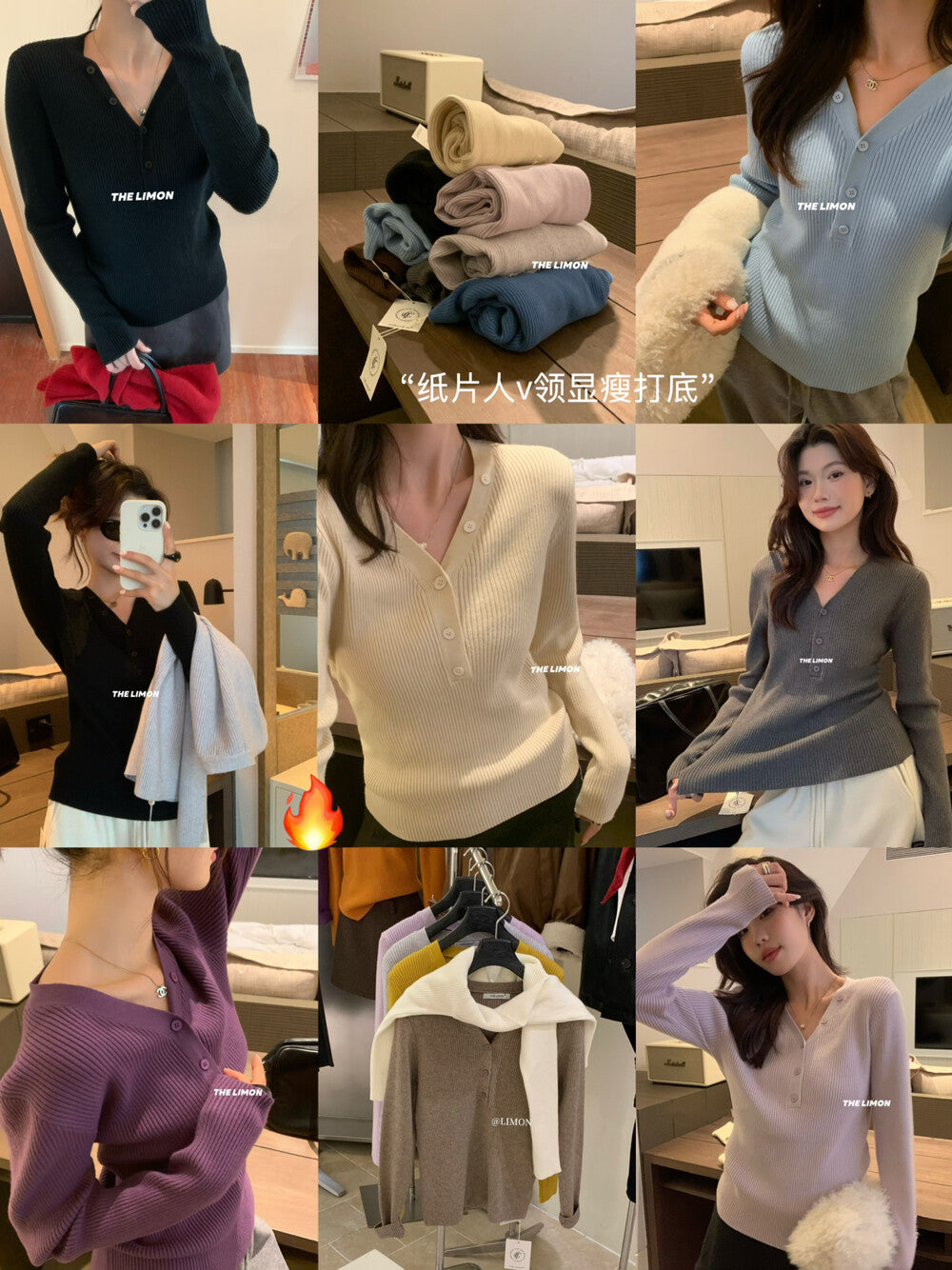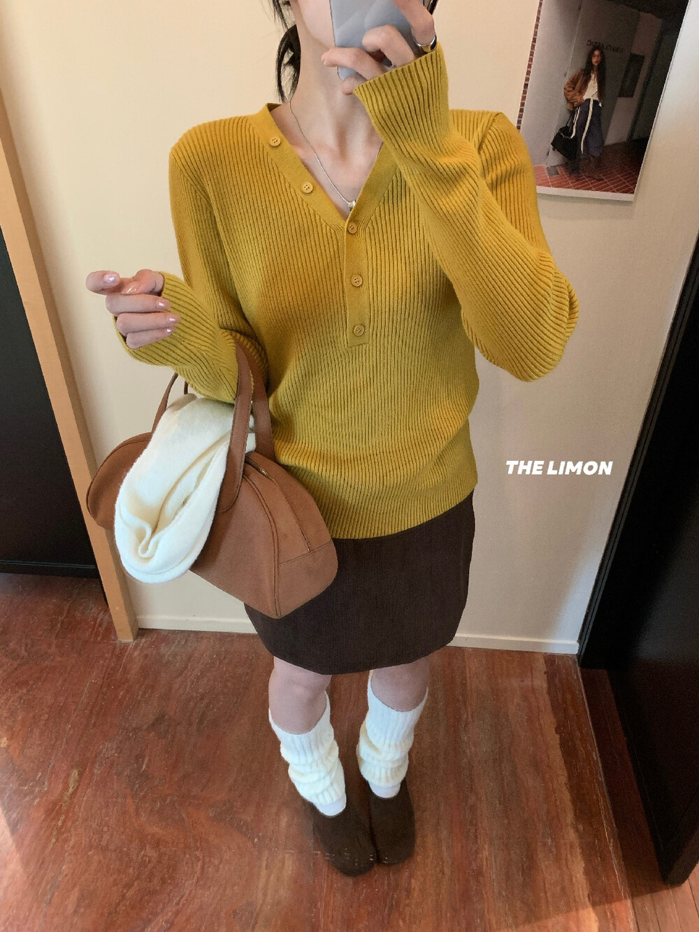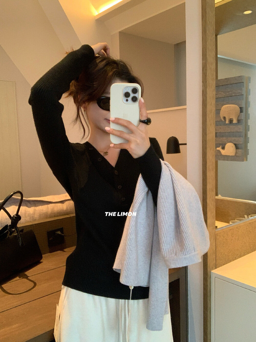 【L99909】檸檬秋冬超修身V領纽扣長袖針織衫251117