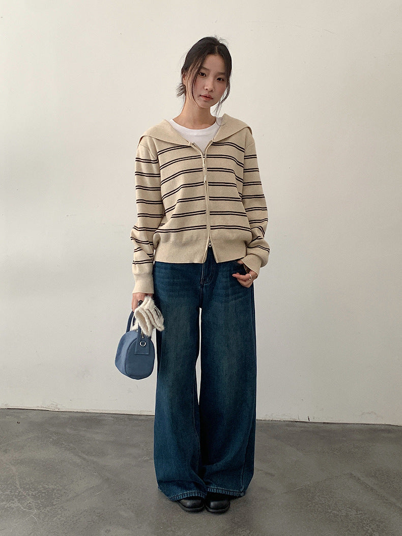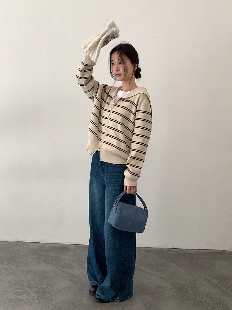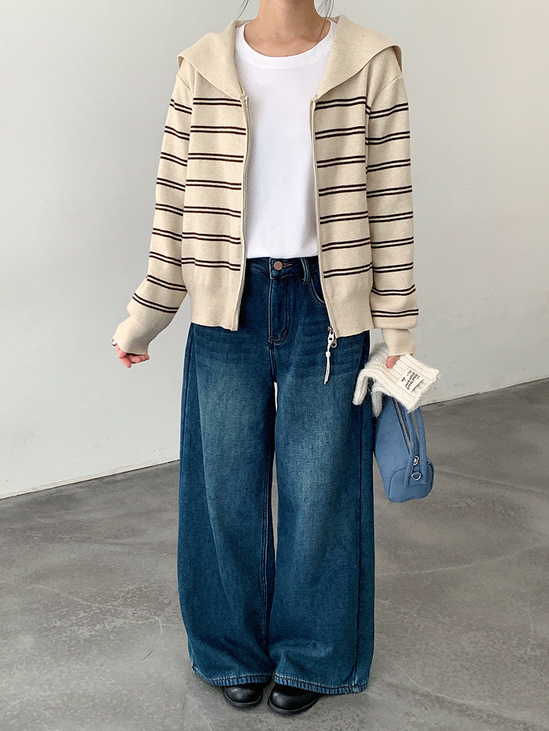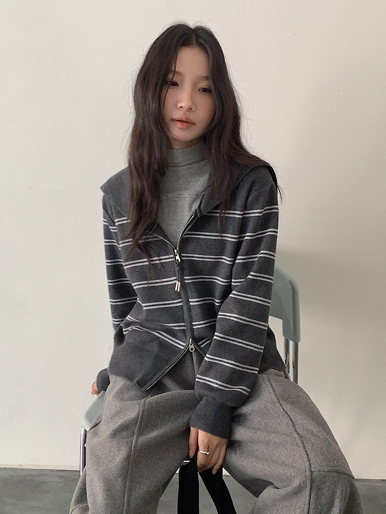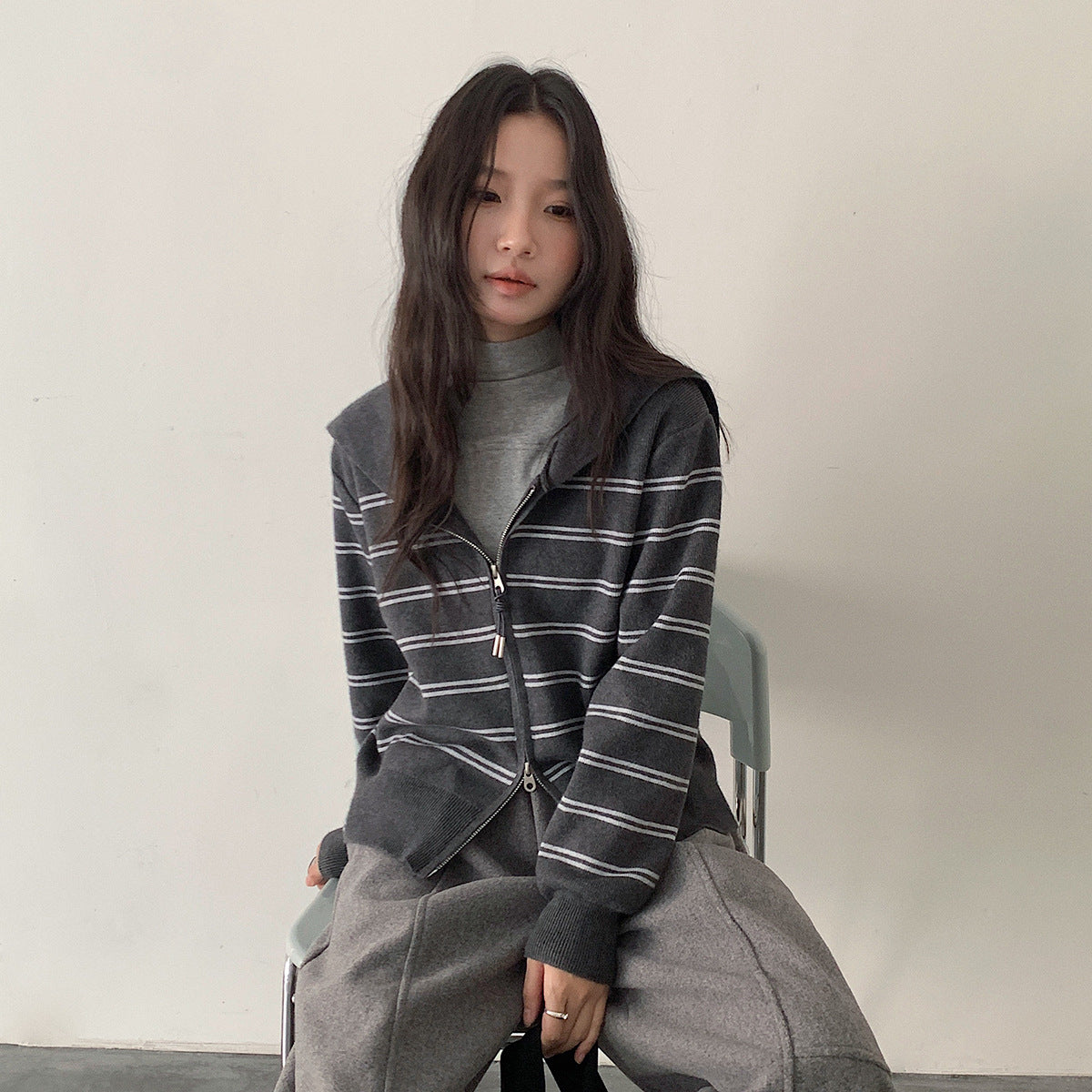 【LD11036】實拍雙頭拉鍊海軍領條紋針織開衫251202