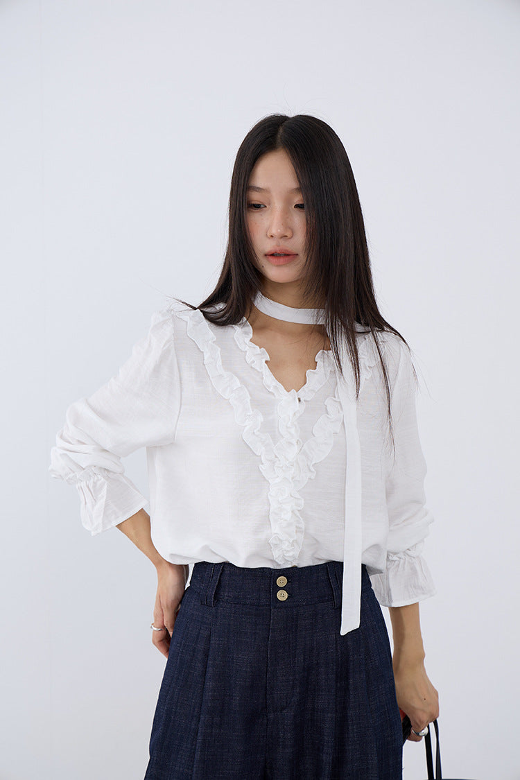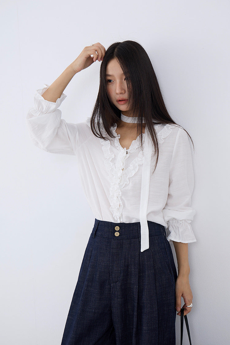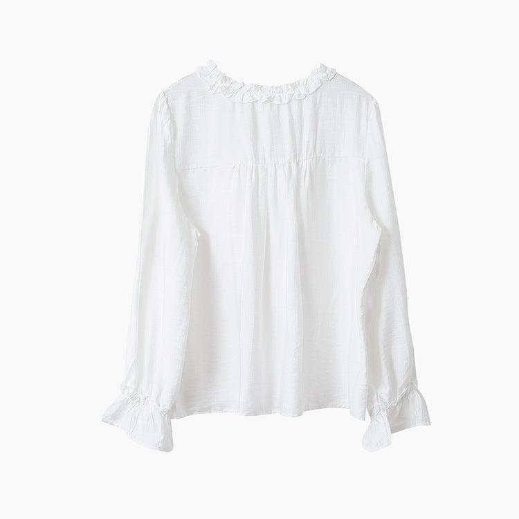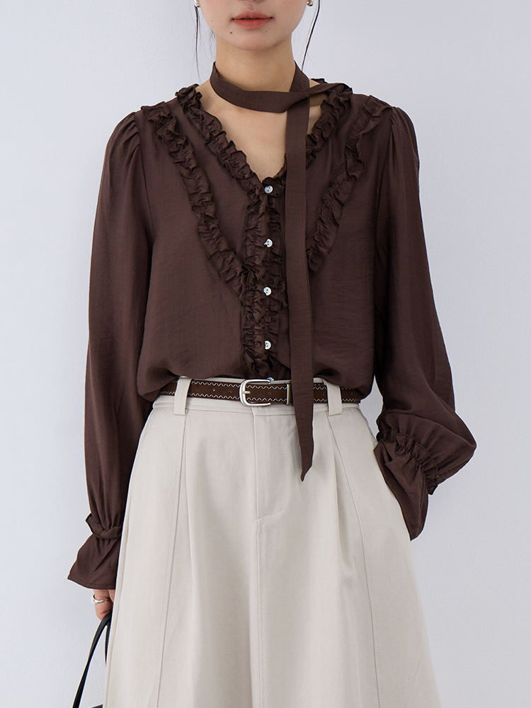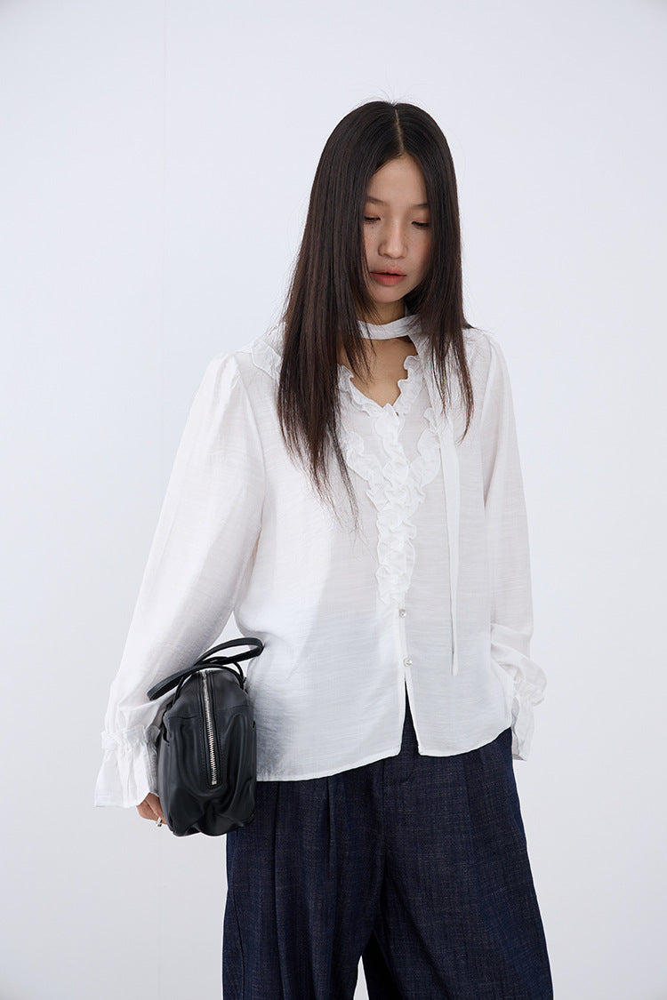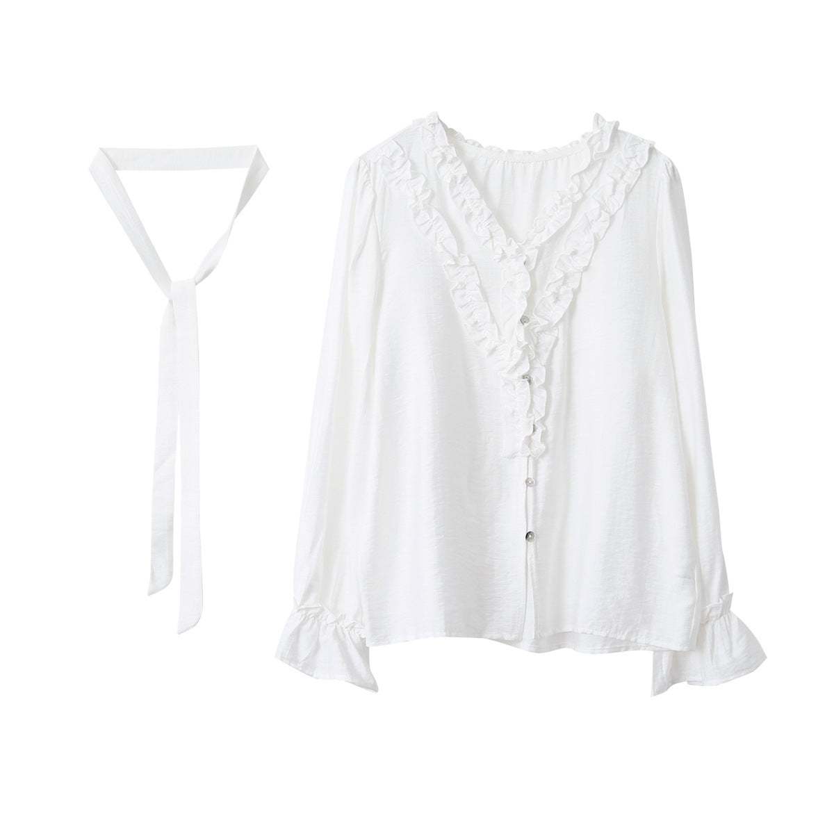 【LD3160】實拍法式氣質荷葉長袖襯衫飄帶250908