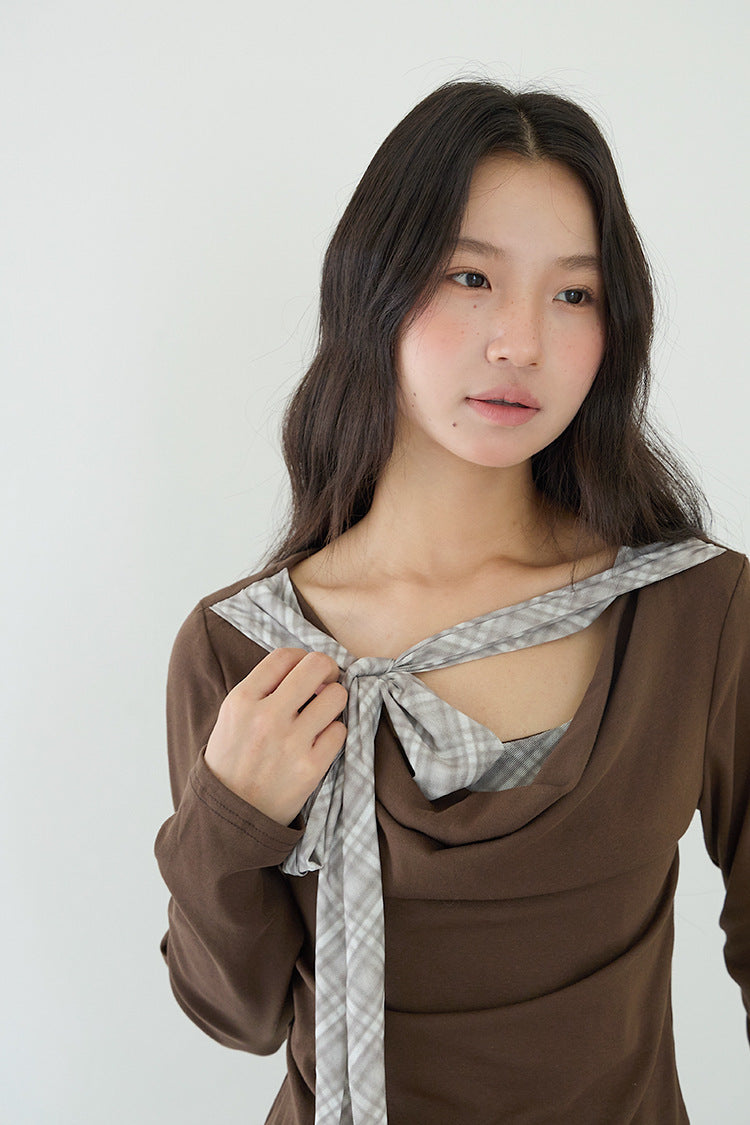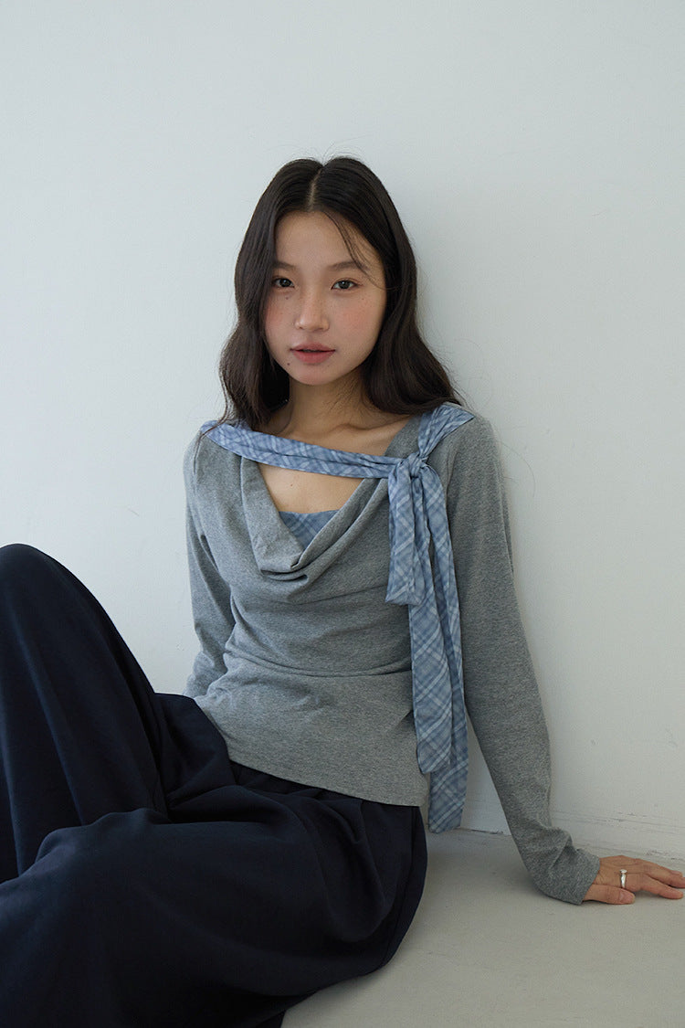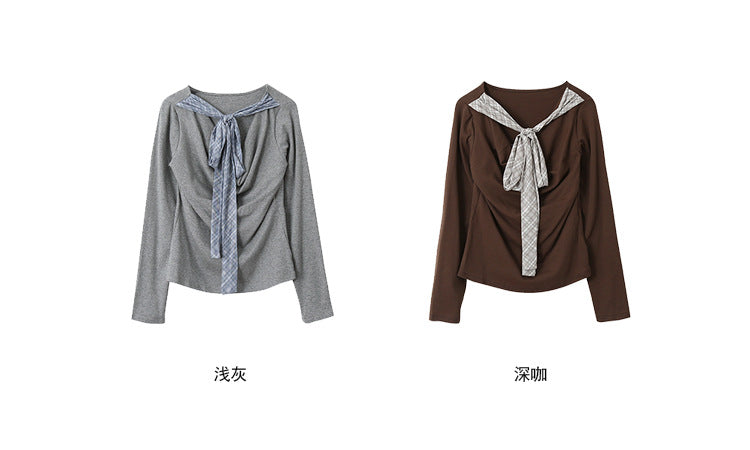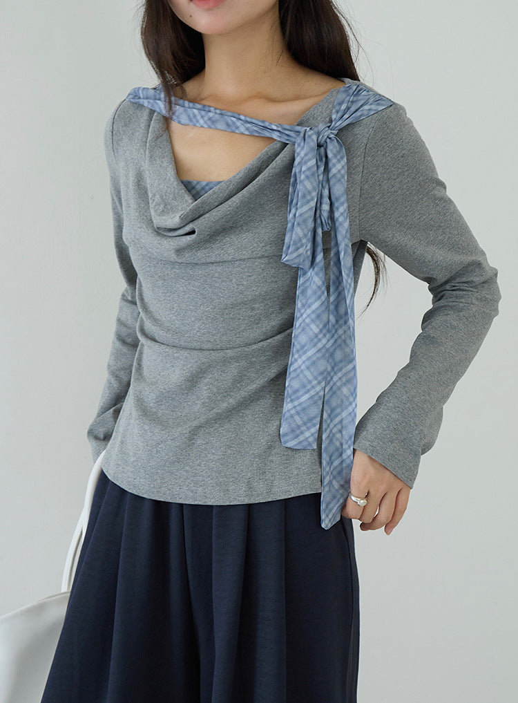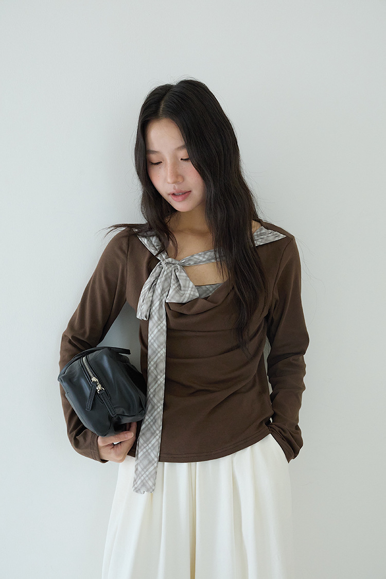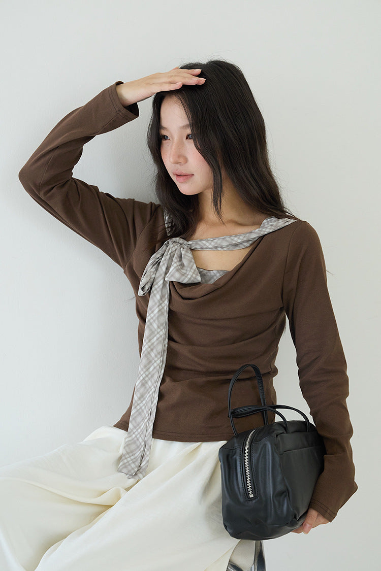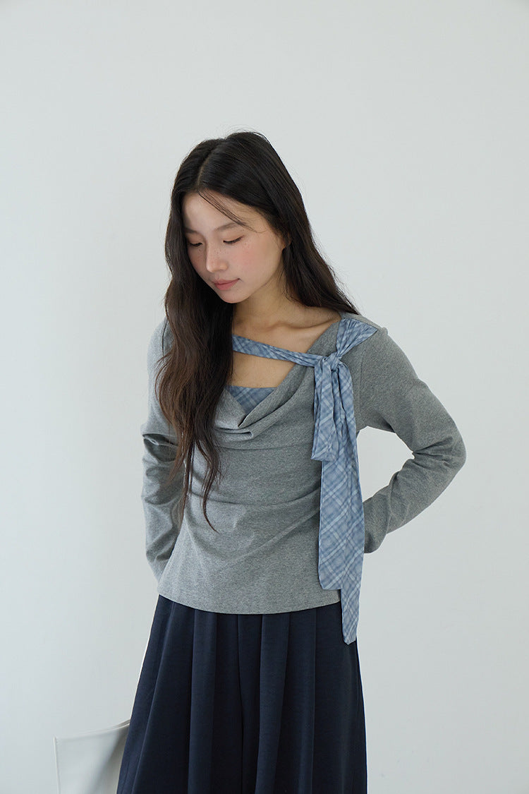 【LD3192】實拍法式菱格飄帶假兩件蕩領T恤250922