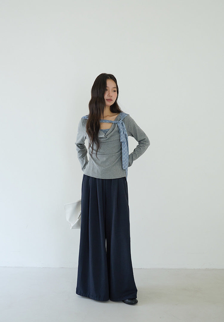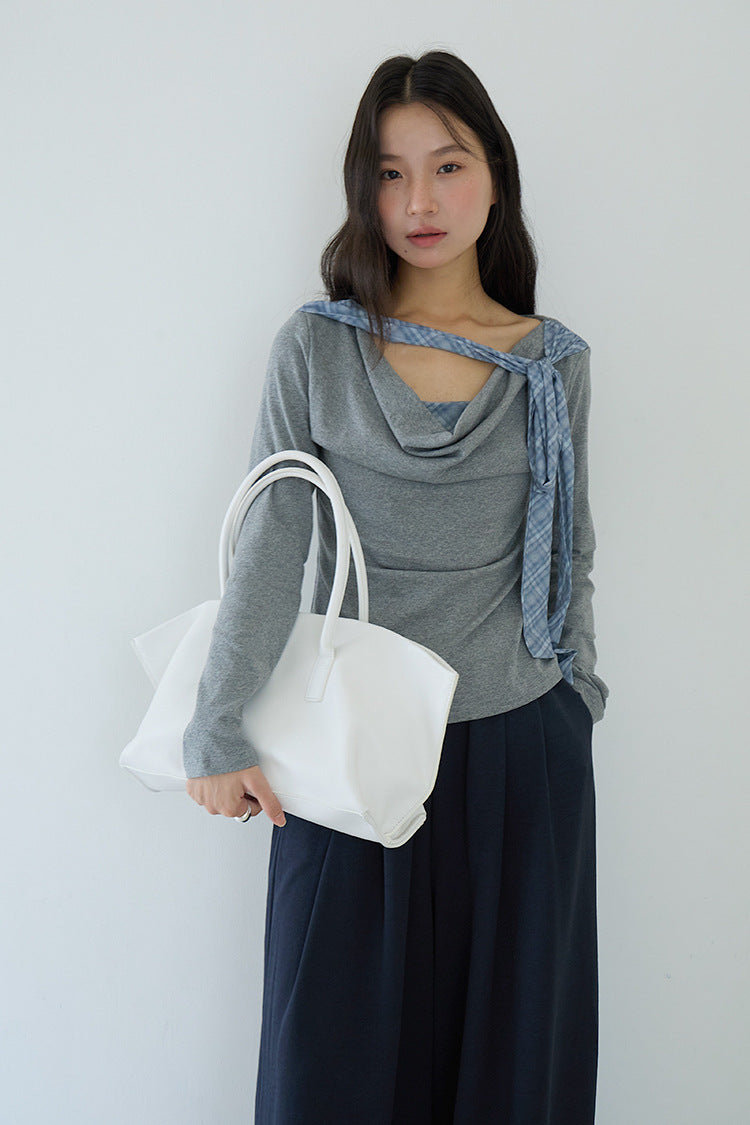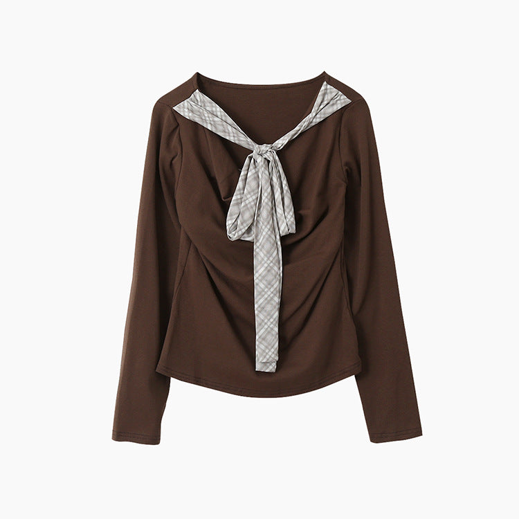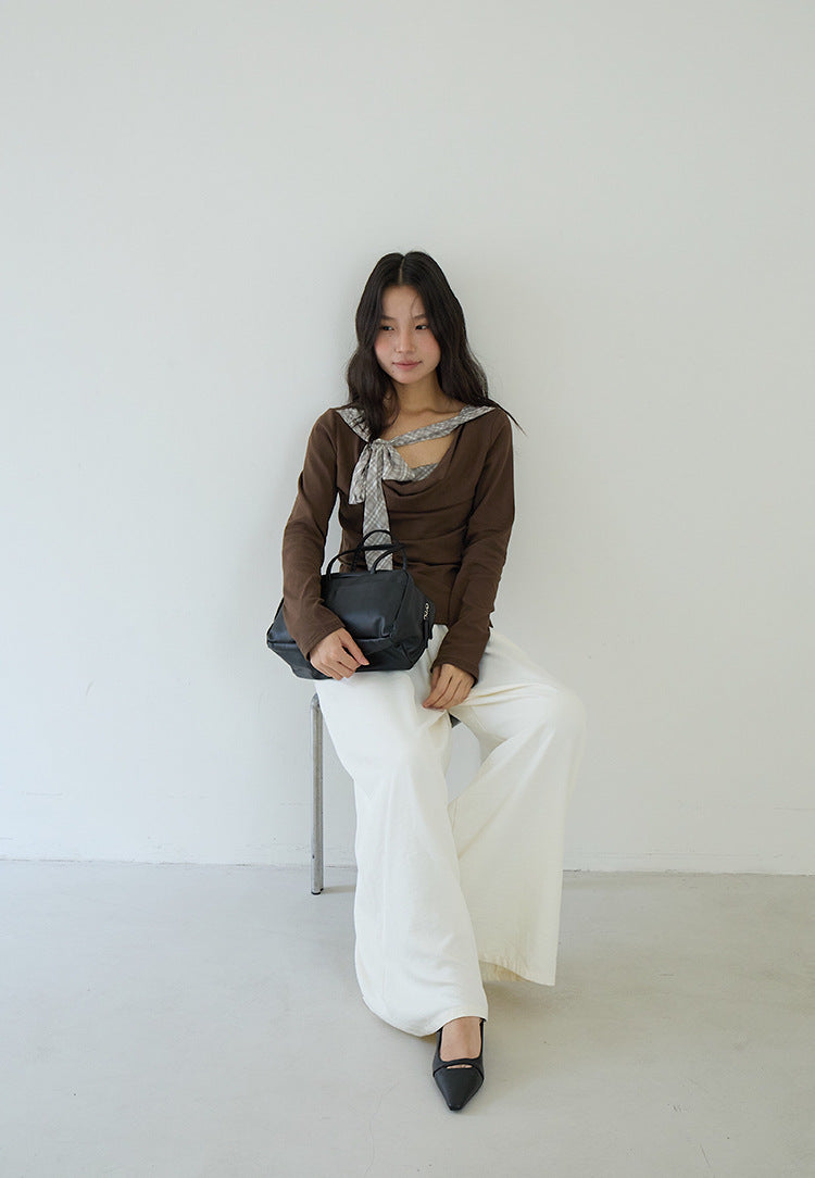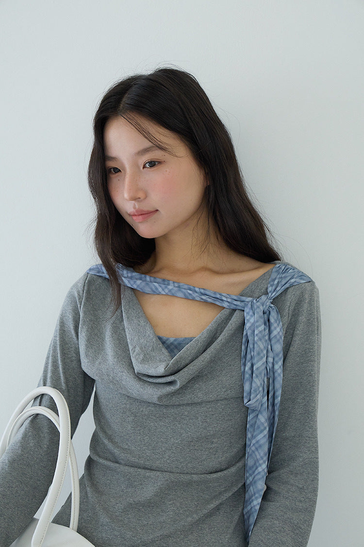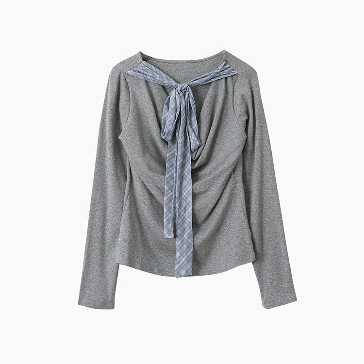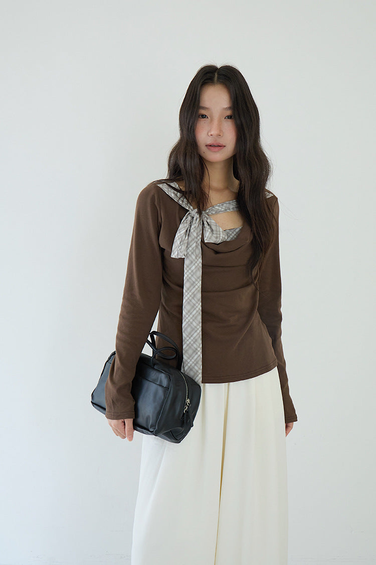 【LD3192】實拍法式菱格飄帶假兩件蕩領T恤250922