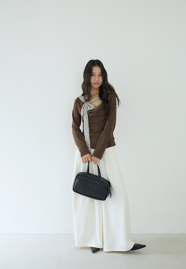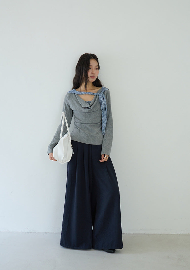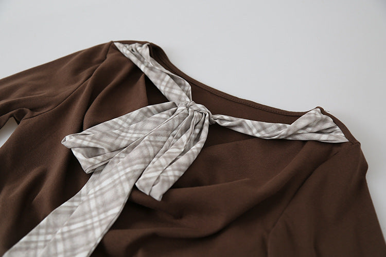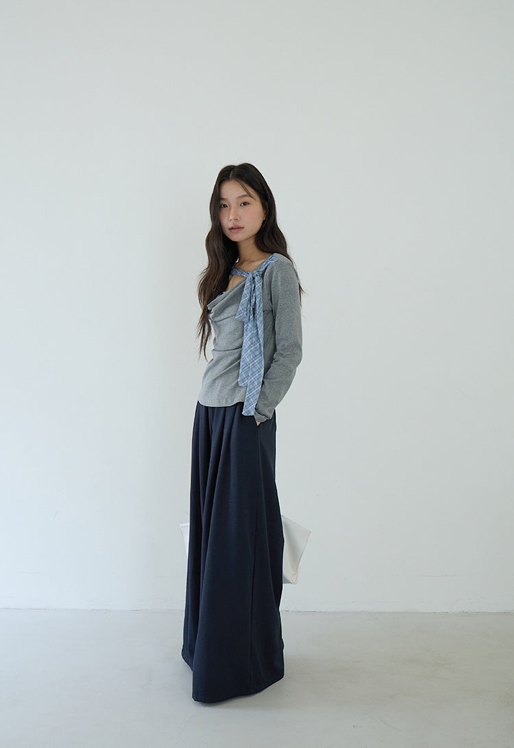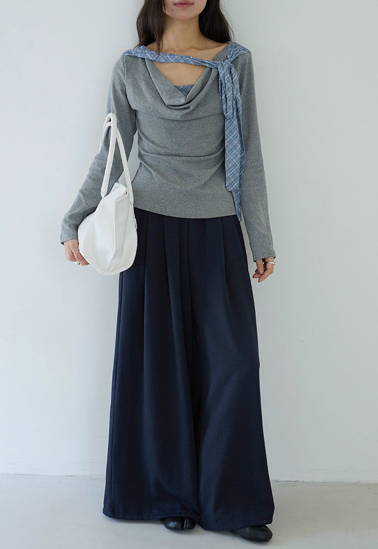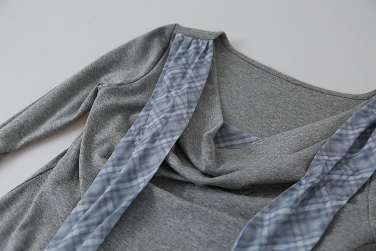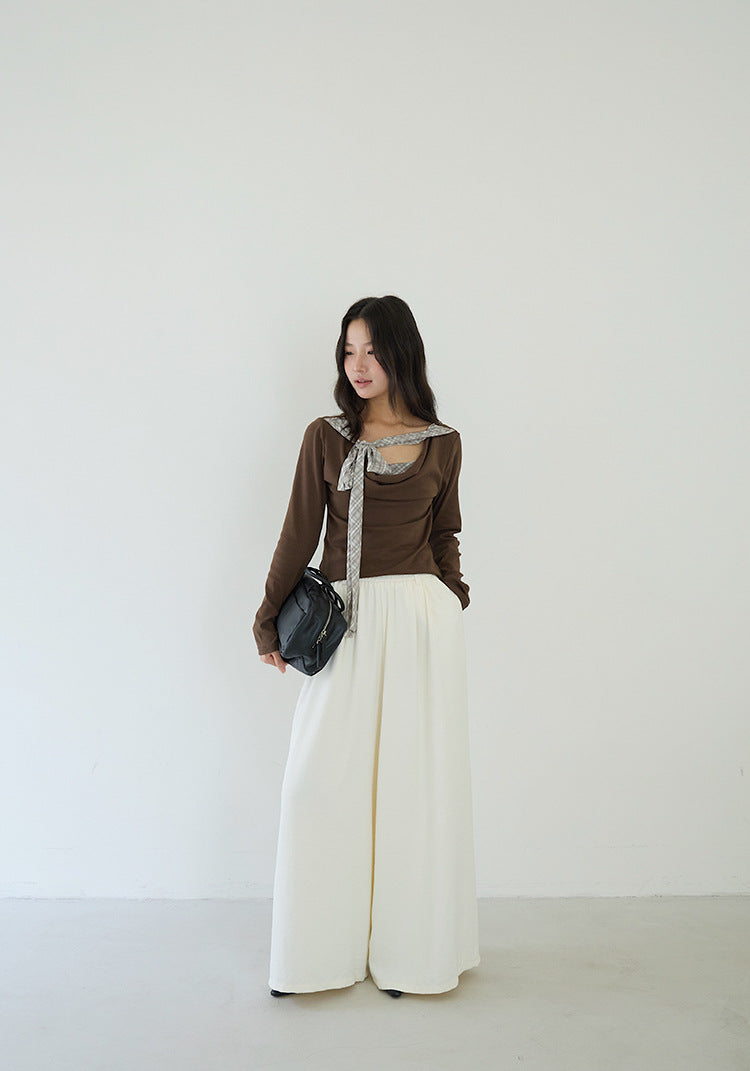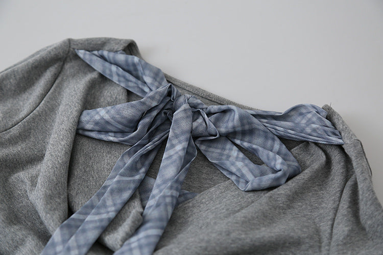 【LD3192】實拍法式菱格飄帶假兩件蕩領T恤250922