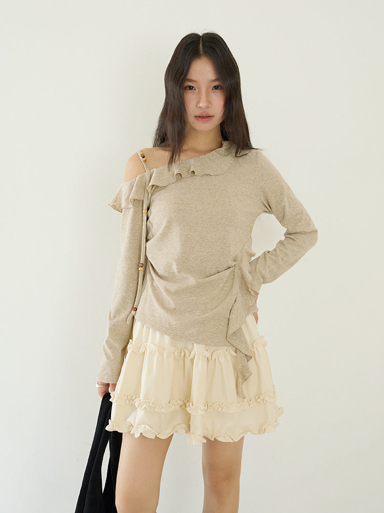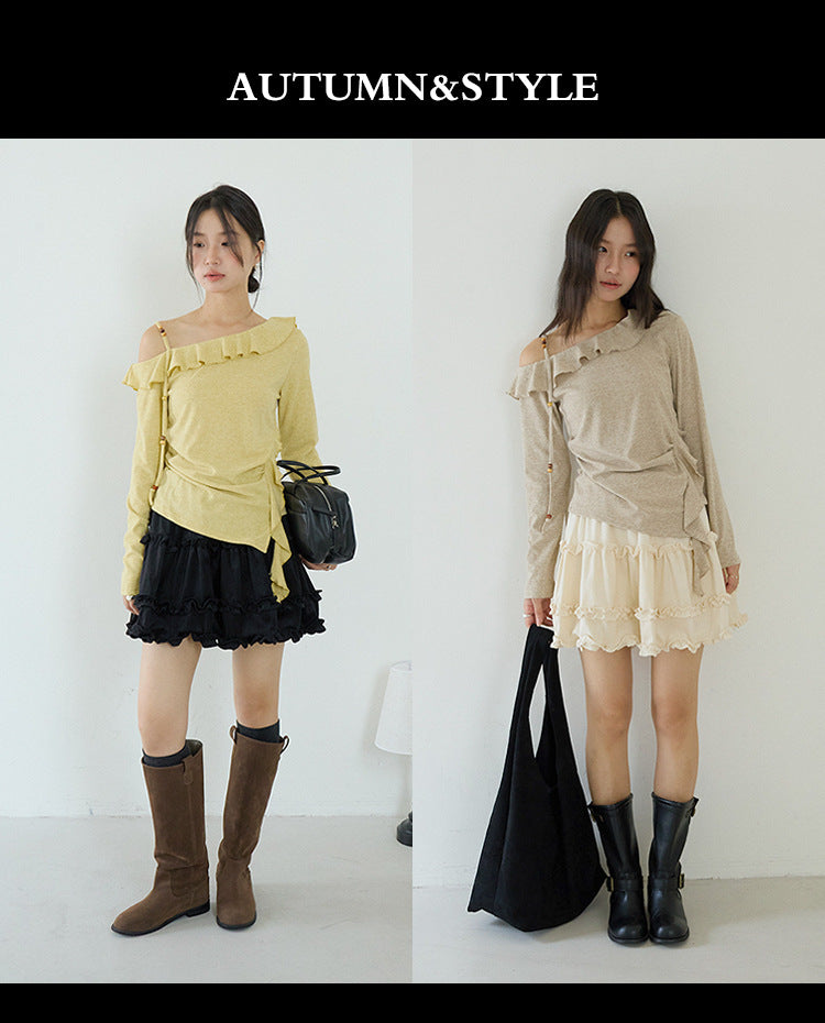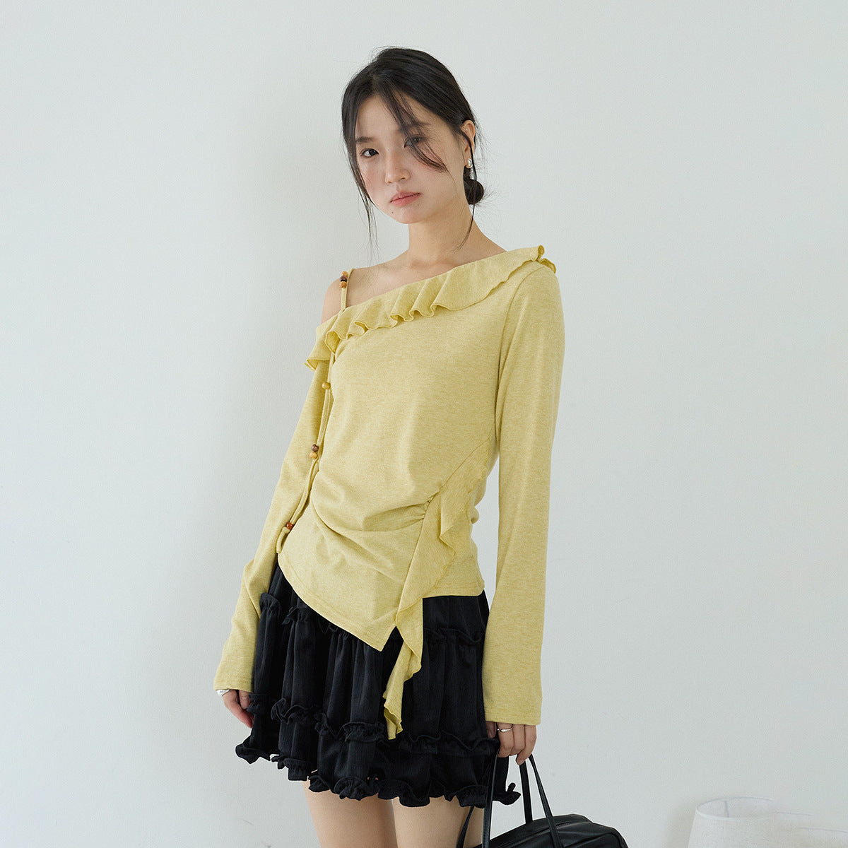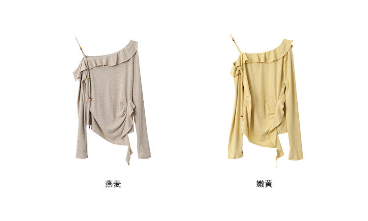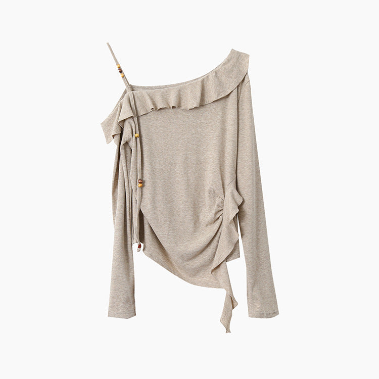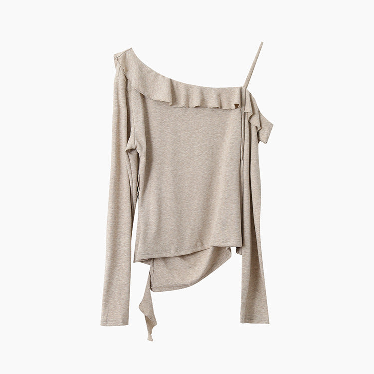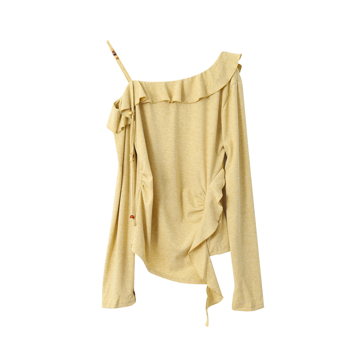 【LD3216】實拍斜肩小荷葉混紡棉長袖T恤250929