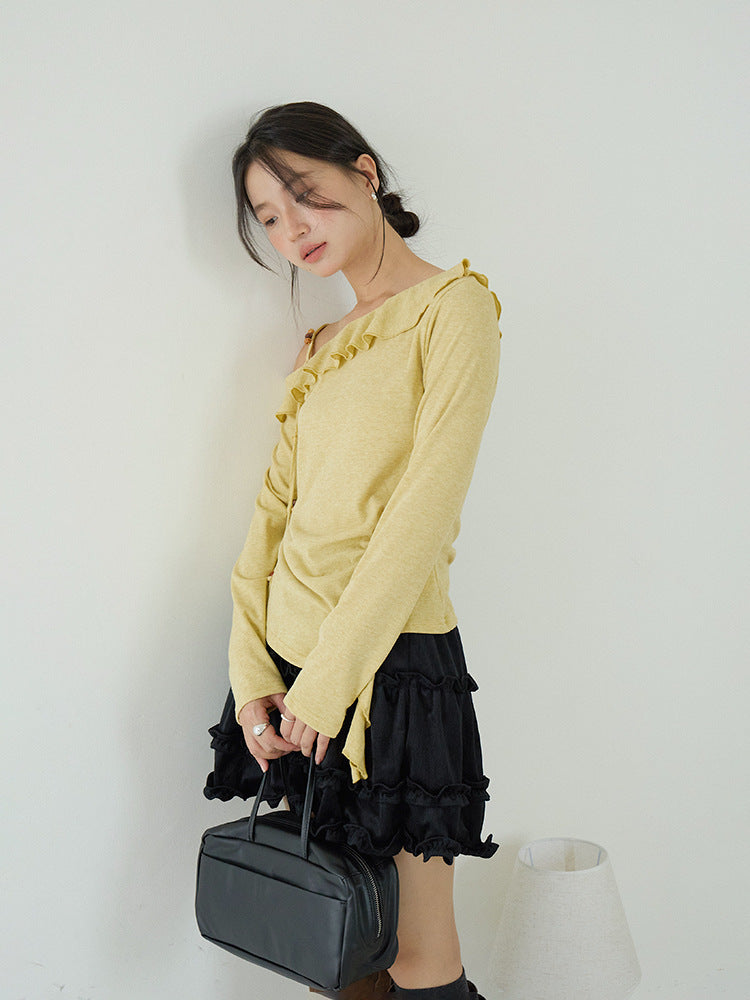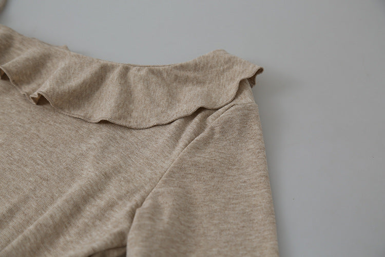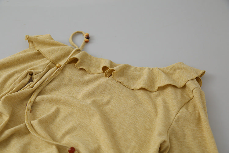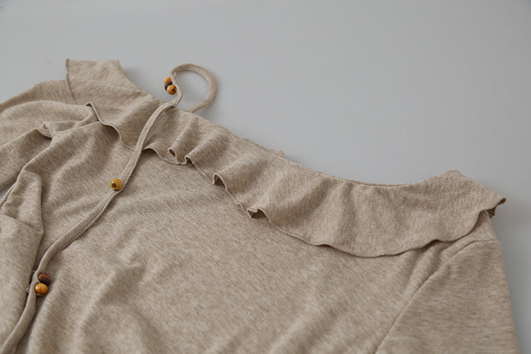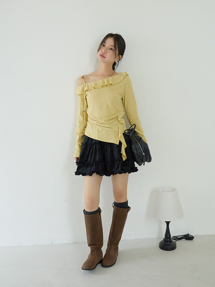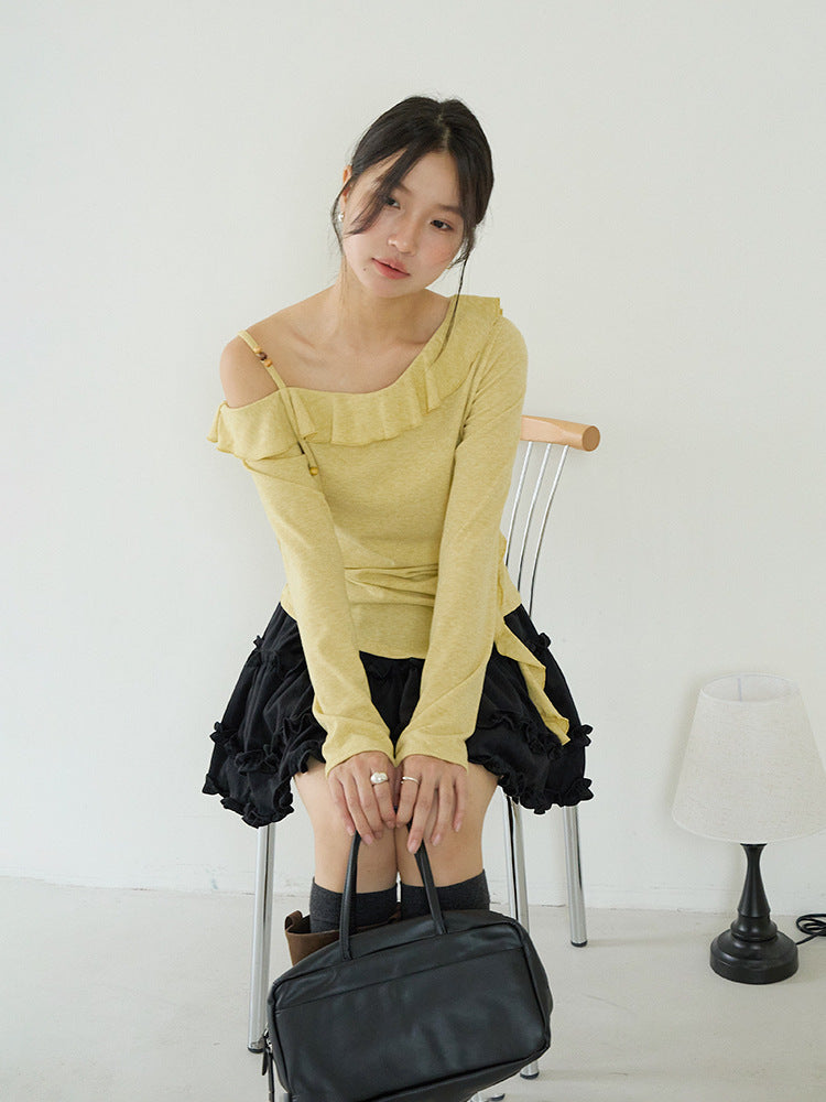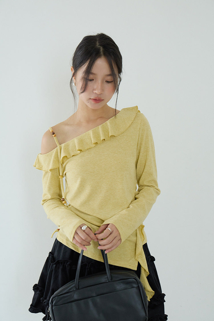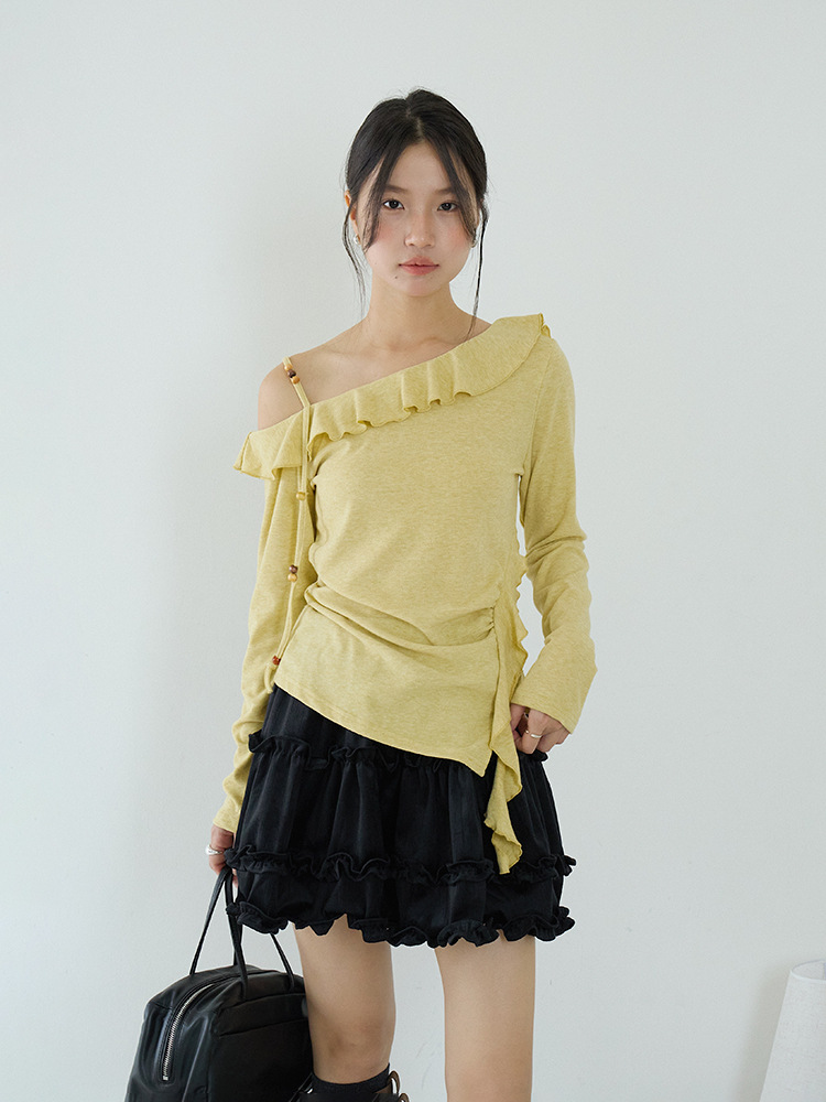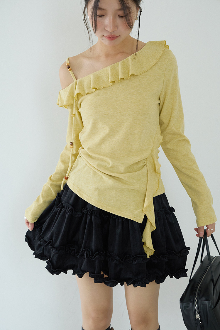 【LD3216】實拍斜肩小荷葉混紡棉長袖T恤250929