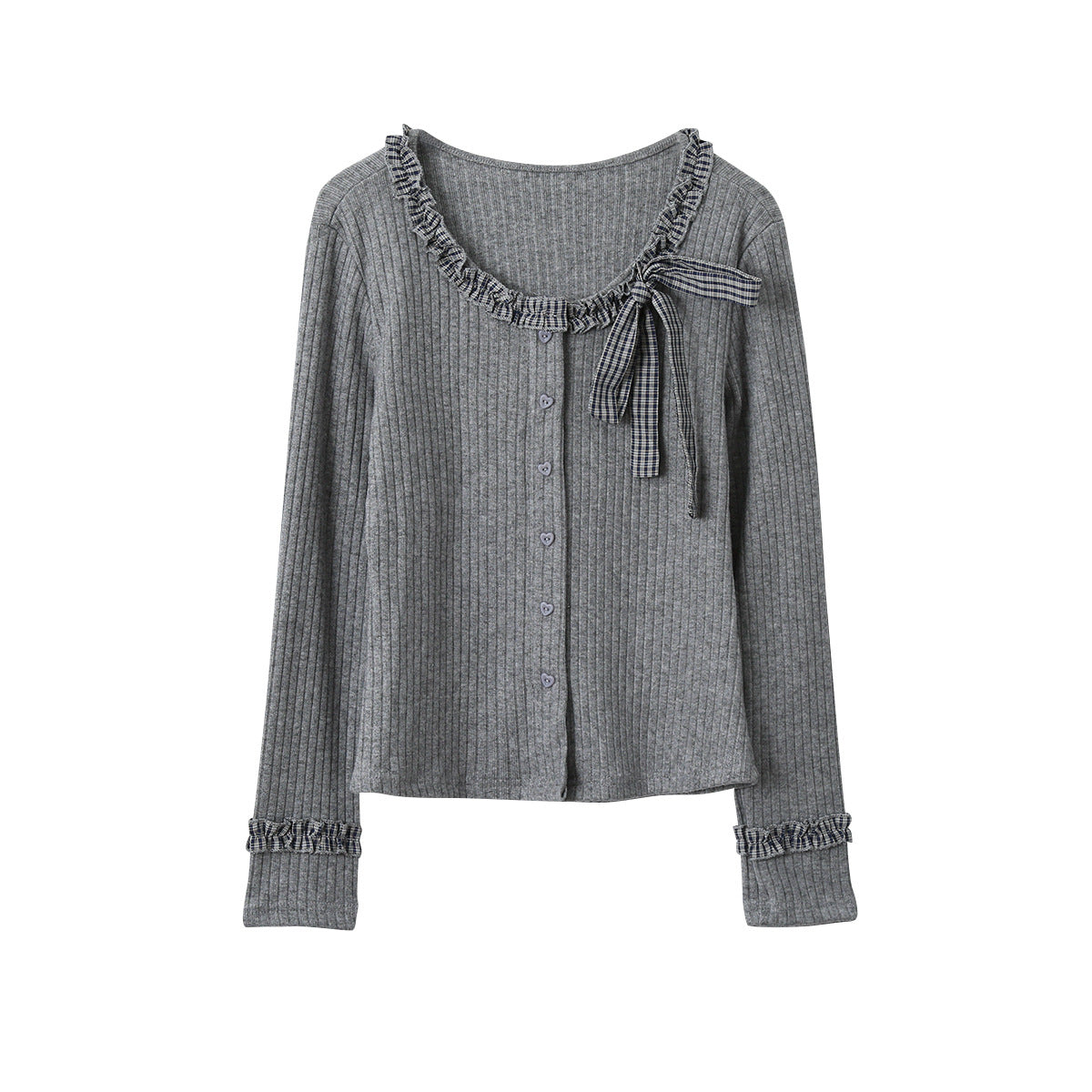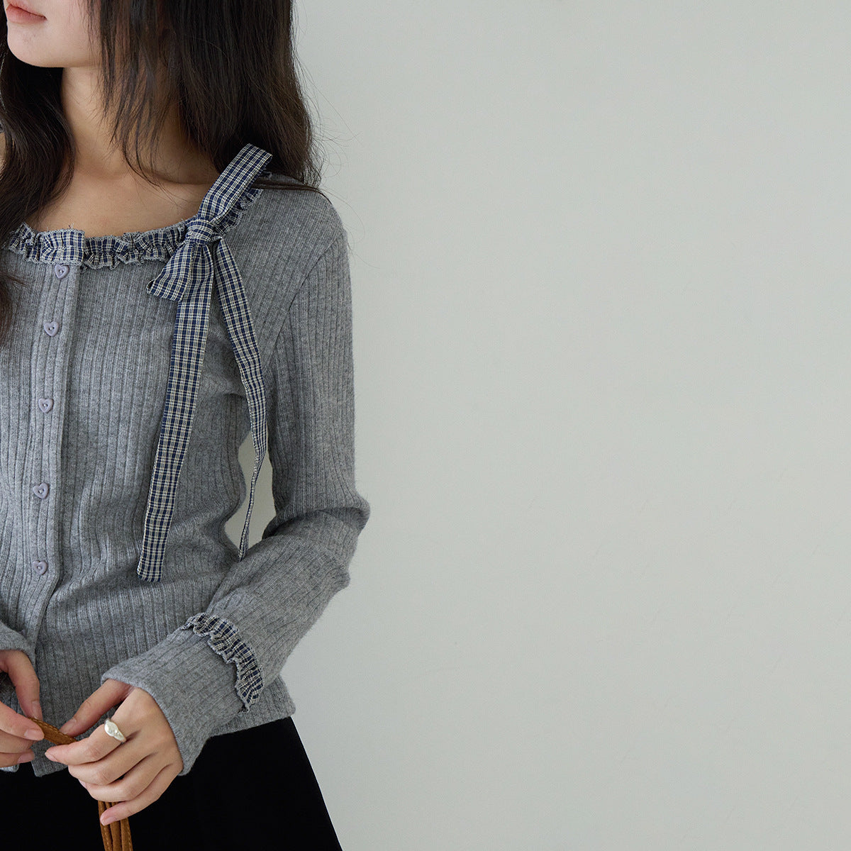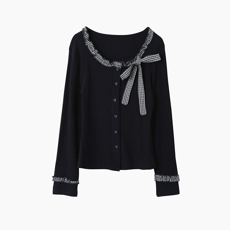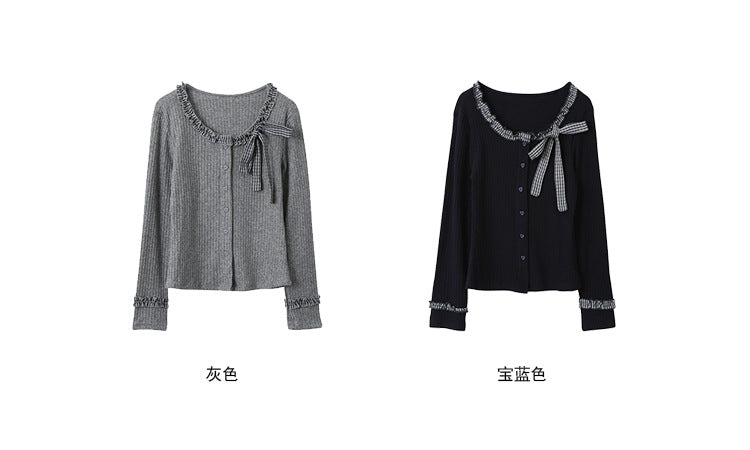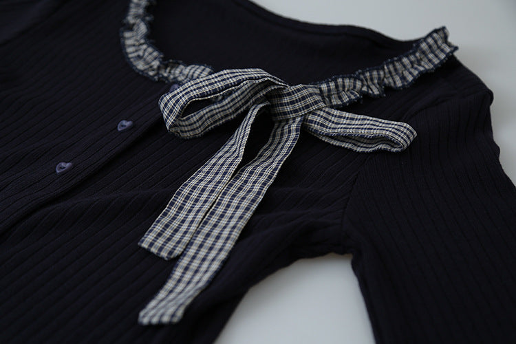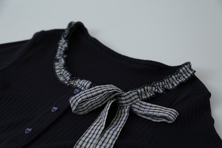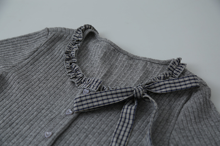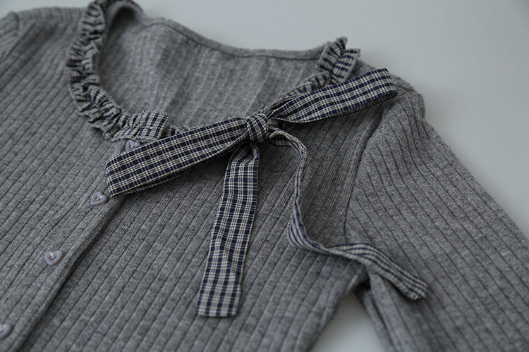 【LD3260】實拍美式復古假兩件格子蝴蝶結長袖上衣251012