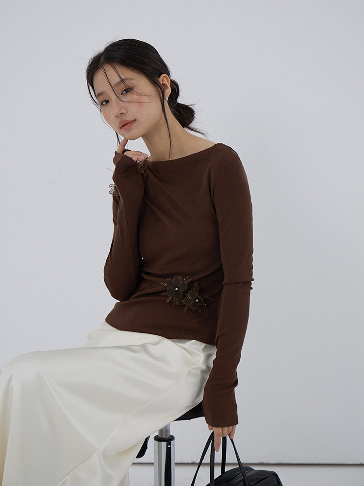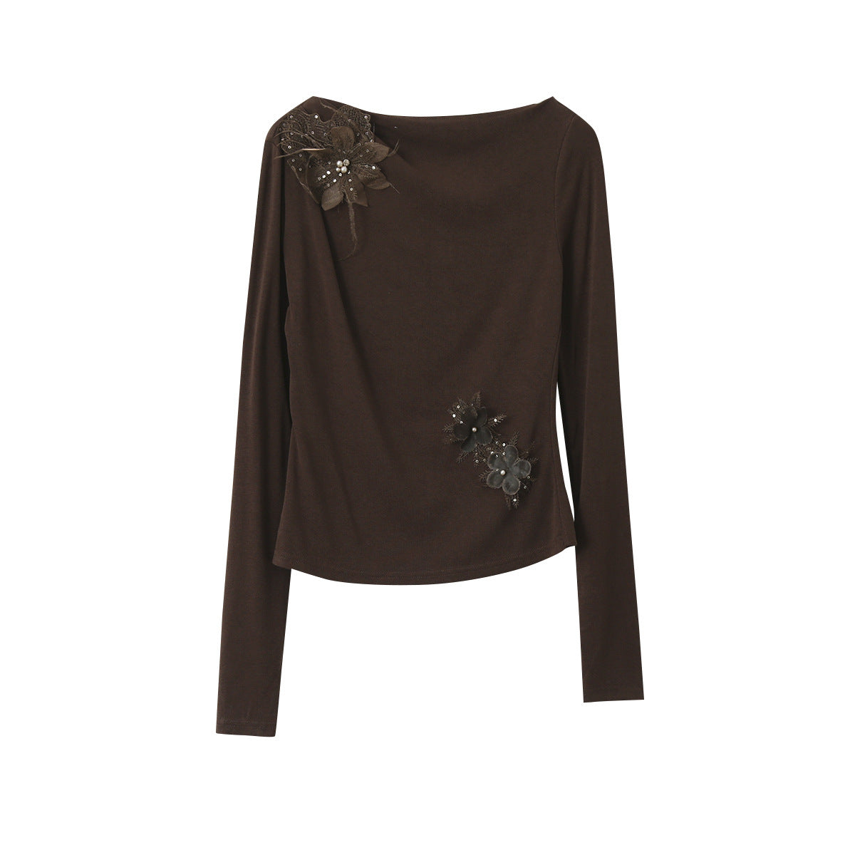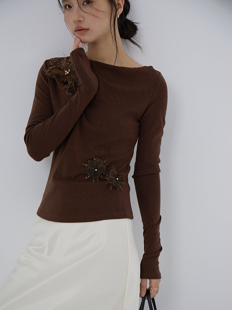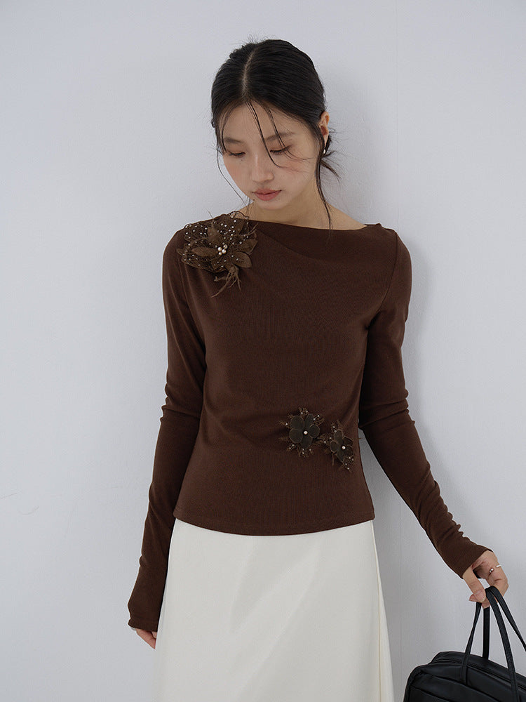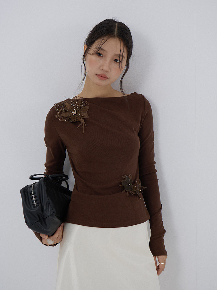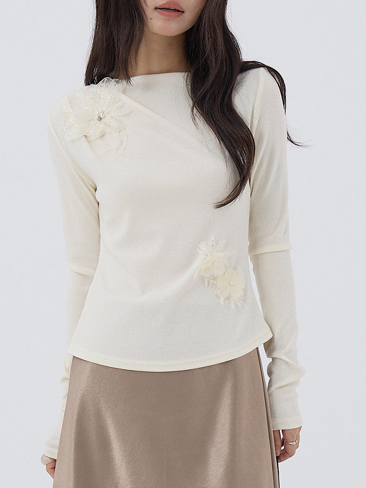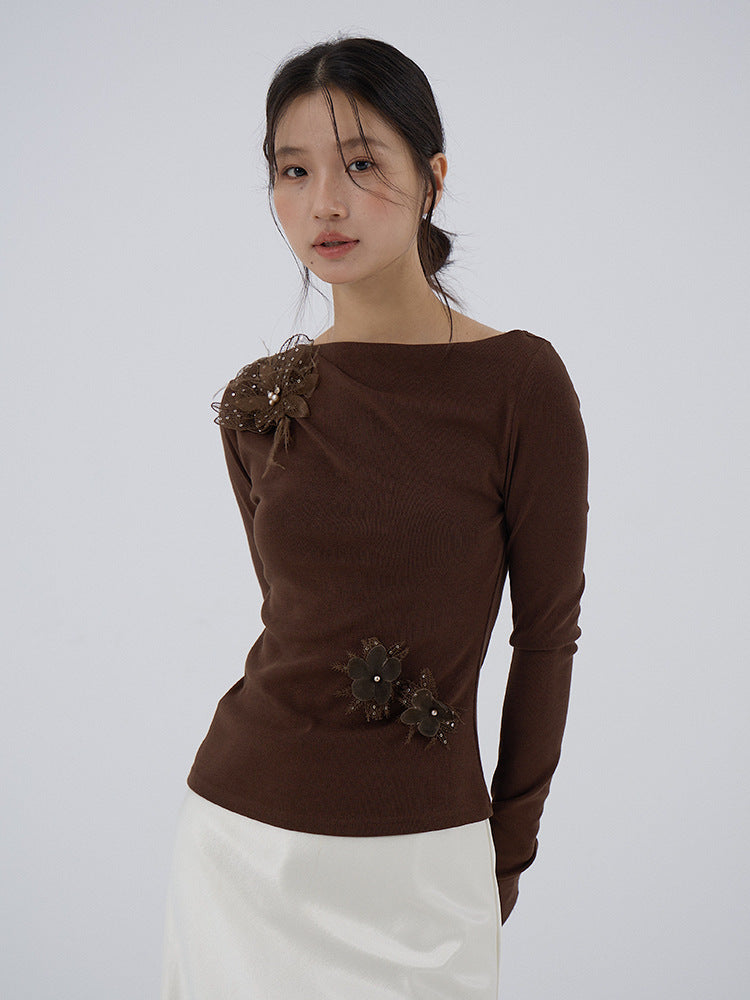 【LD3277】實拍立體花朵長袖一字領T恤251103