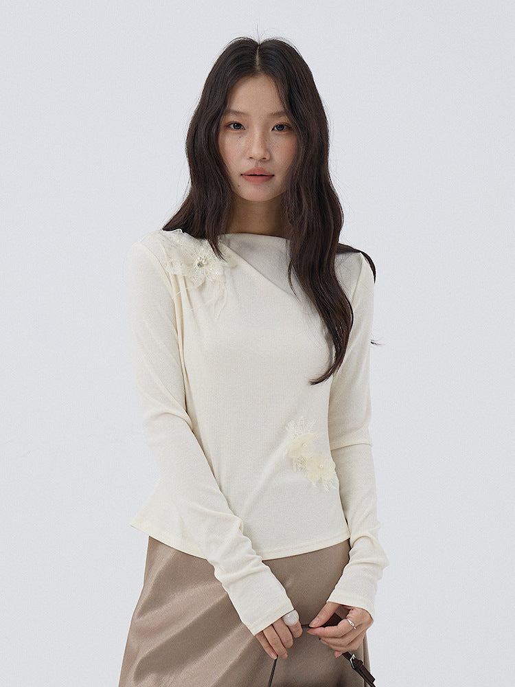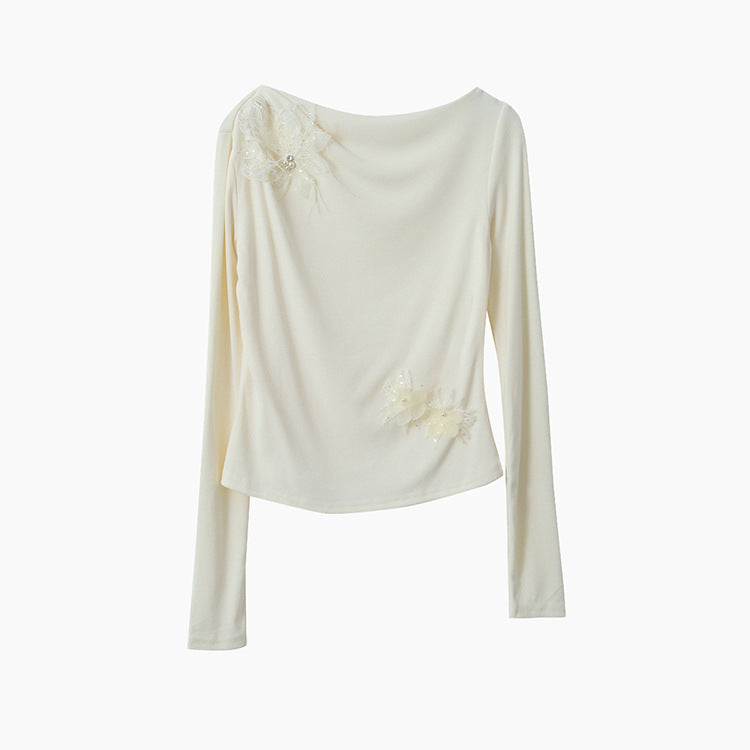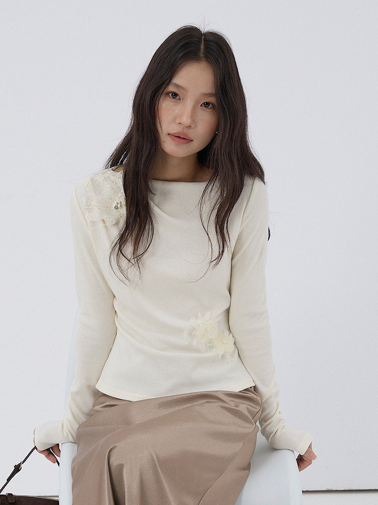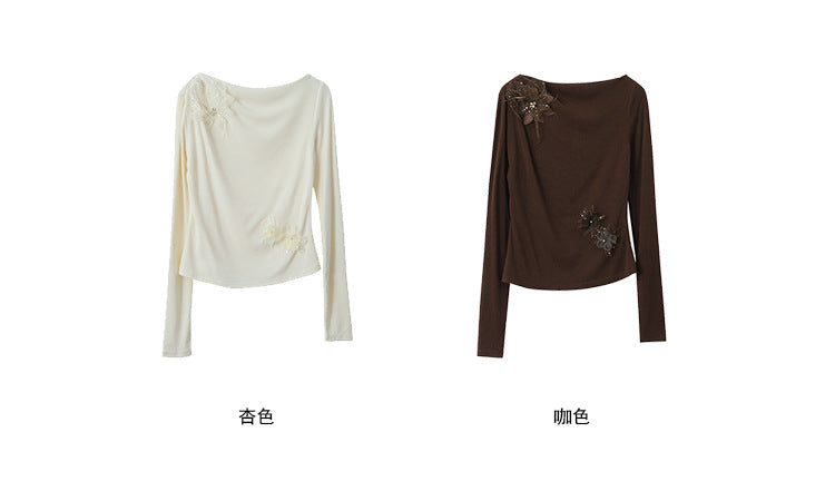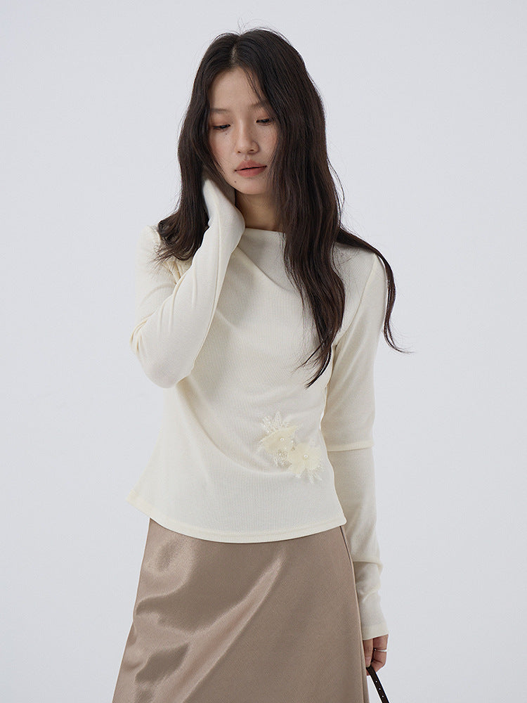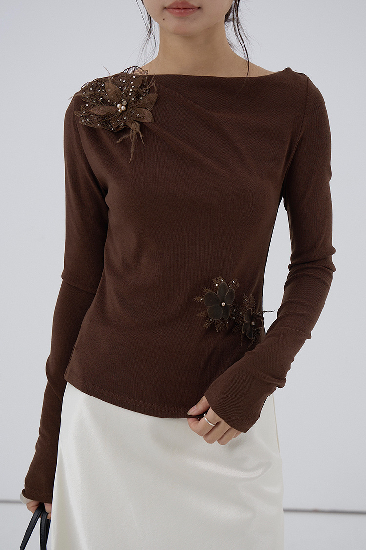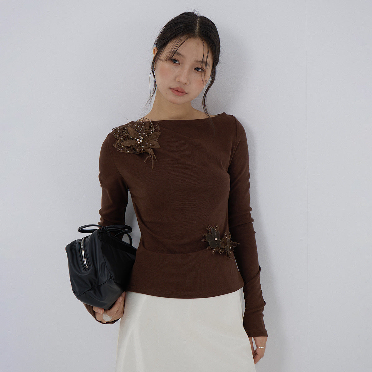 【LD3277】實拍立體花朵長袖一字領T恤251103
