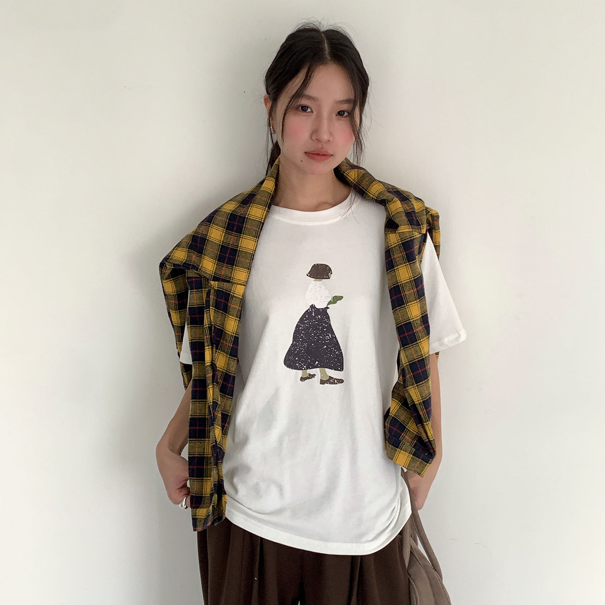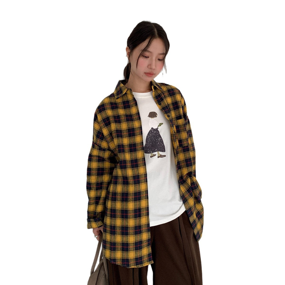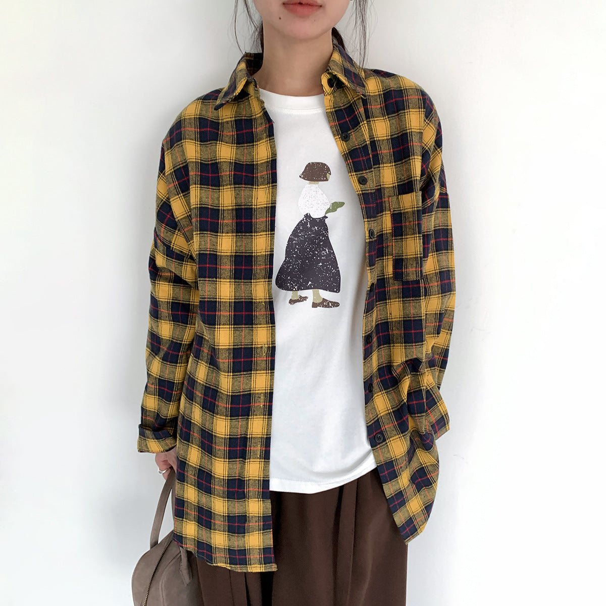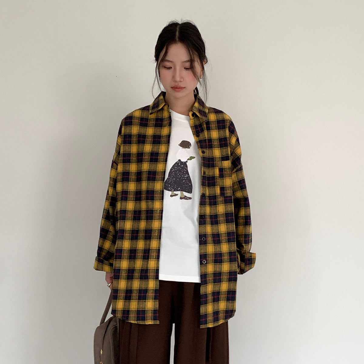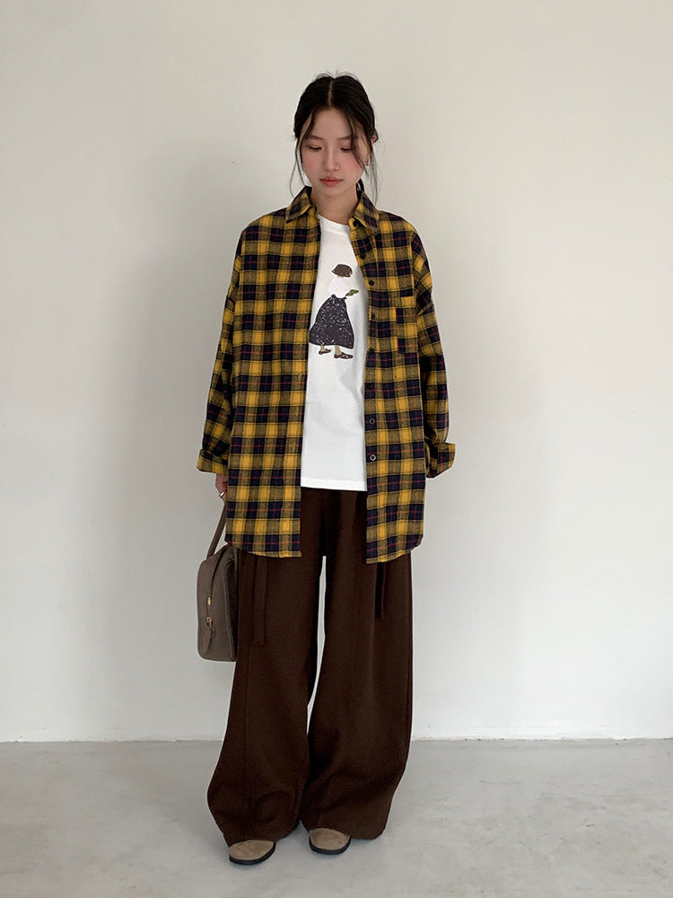 【LD5521】實拍復古黃色長袖格子襯衫251006