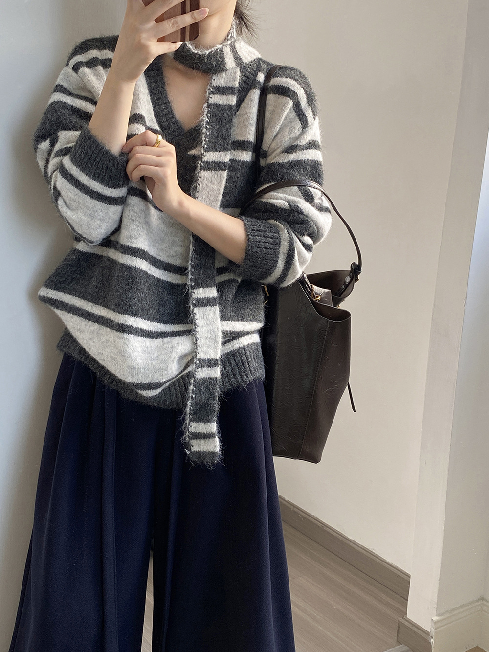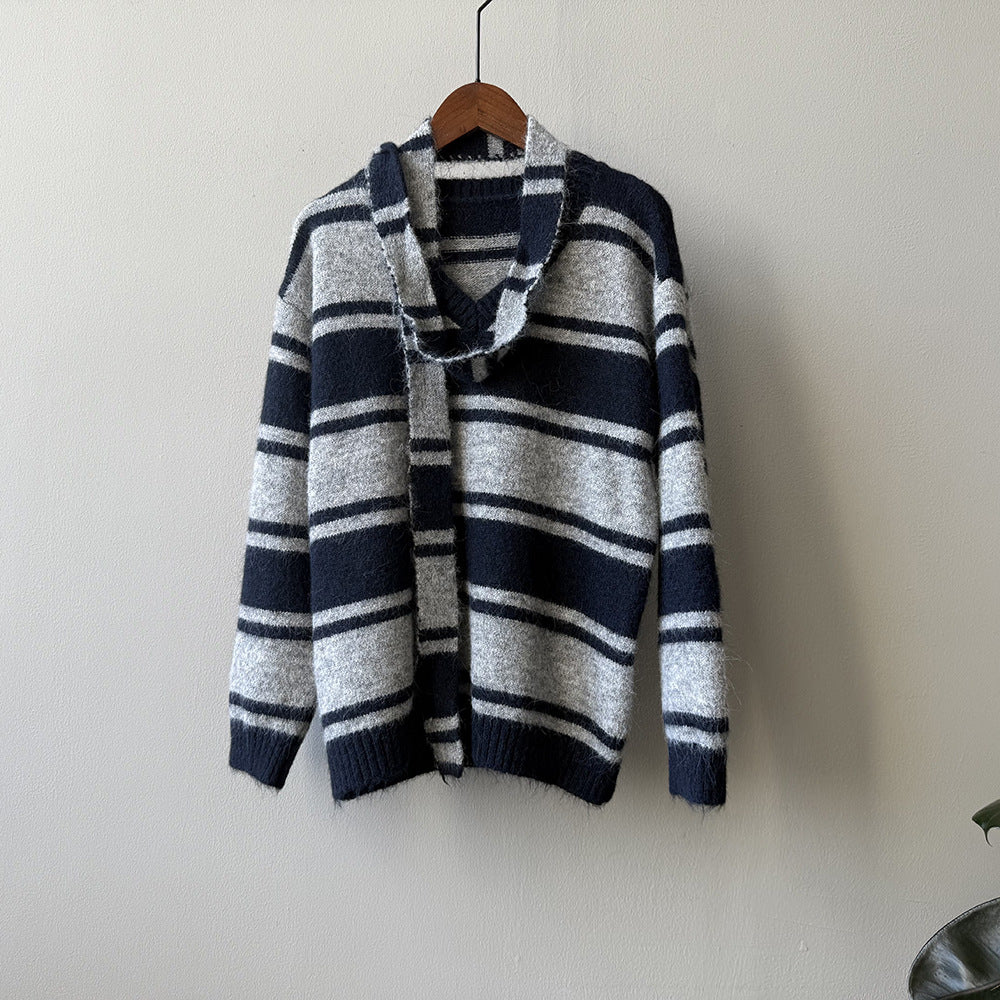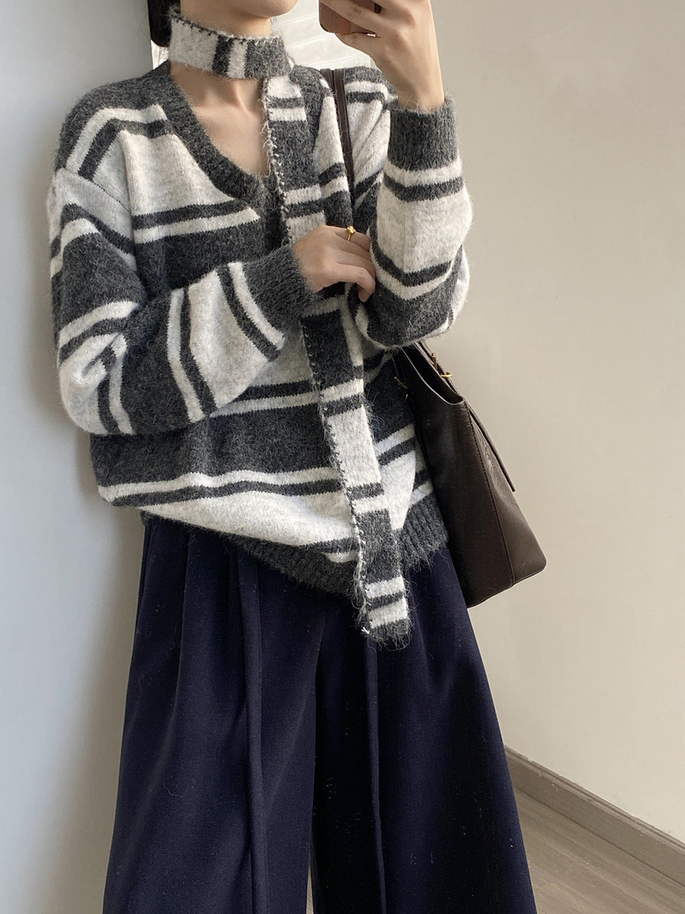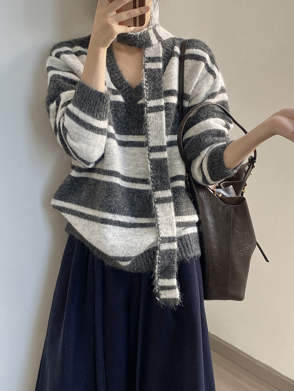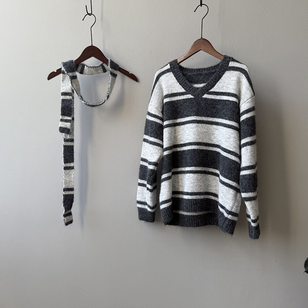 【Y25109】 實拍慵懶條紋V領毛衣+圍巾(含羊毛3%) 251023