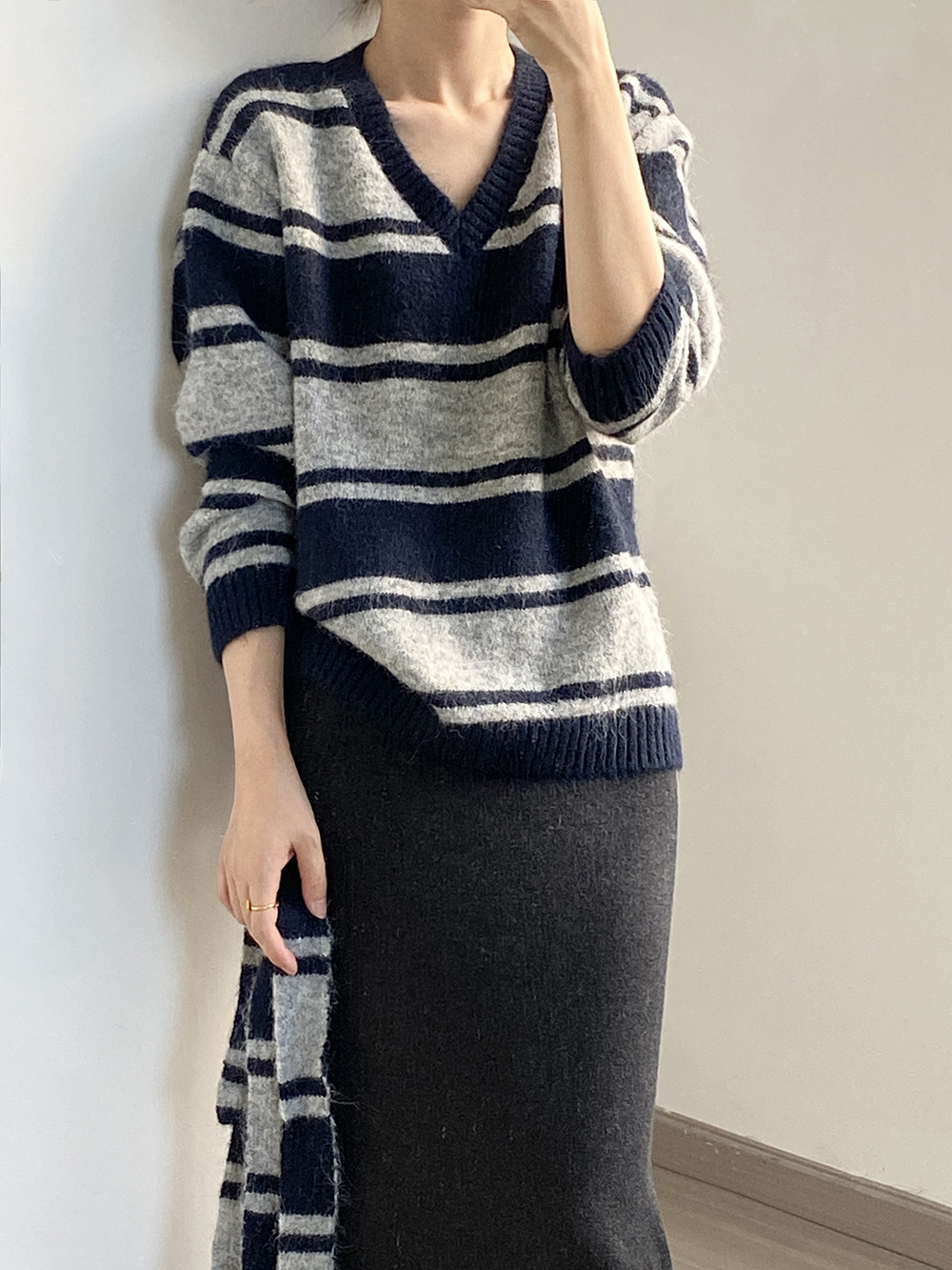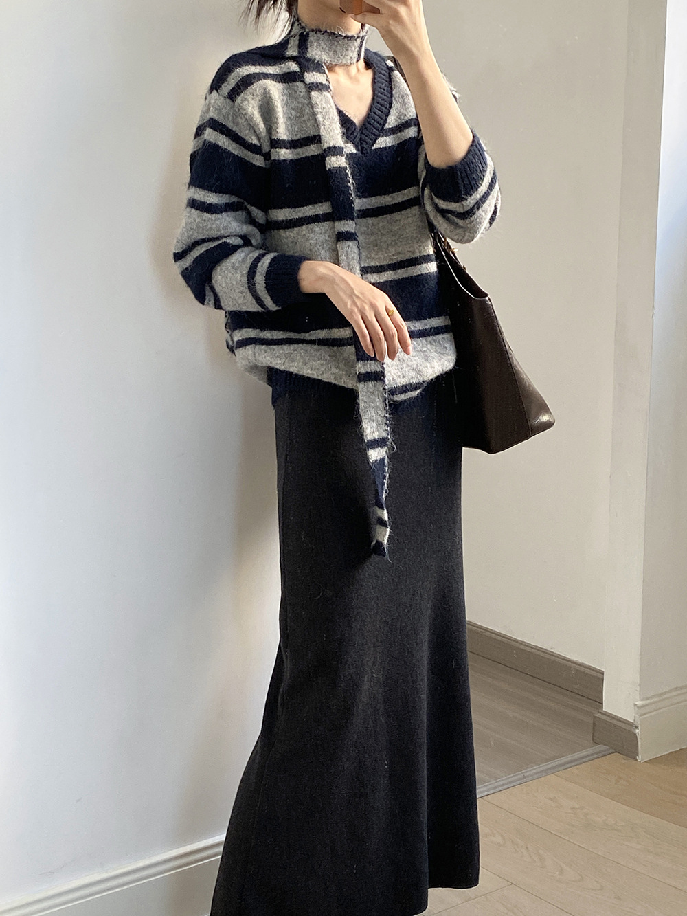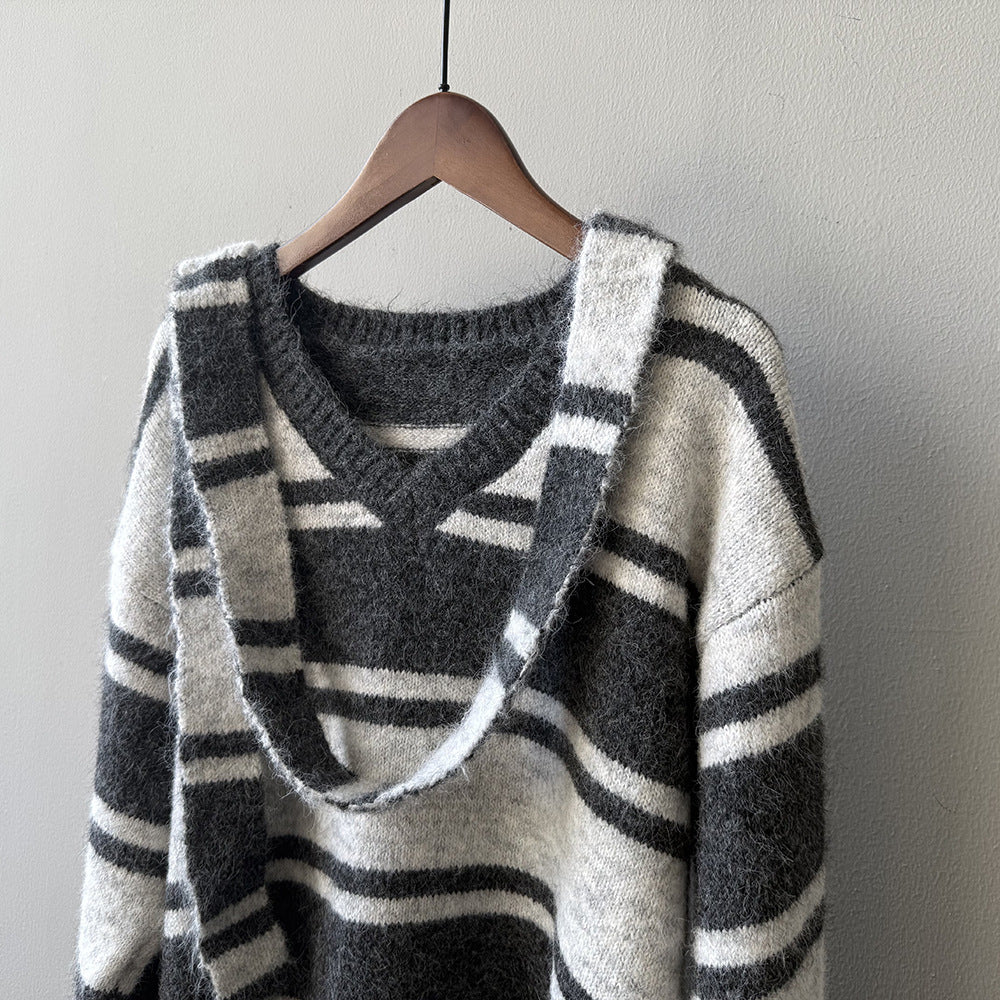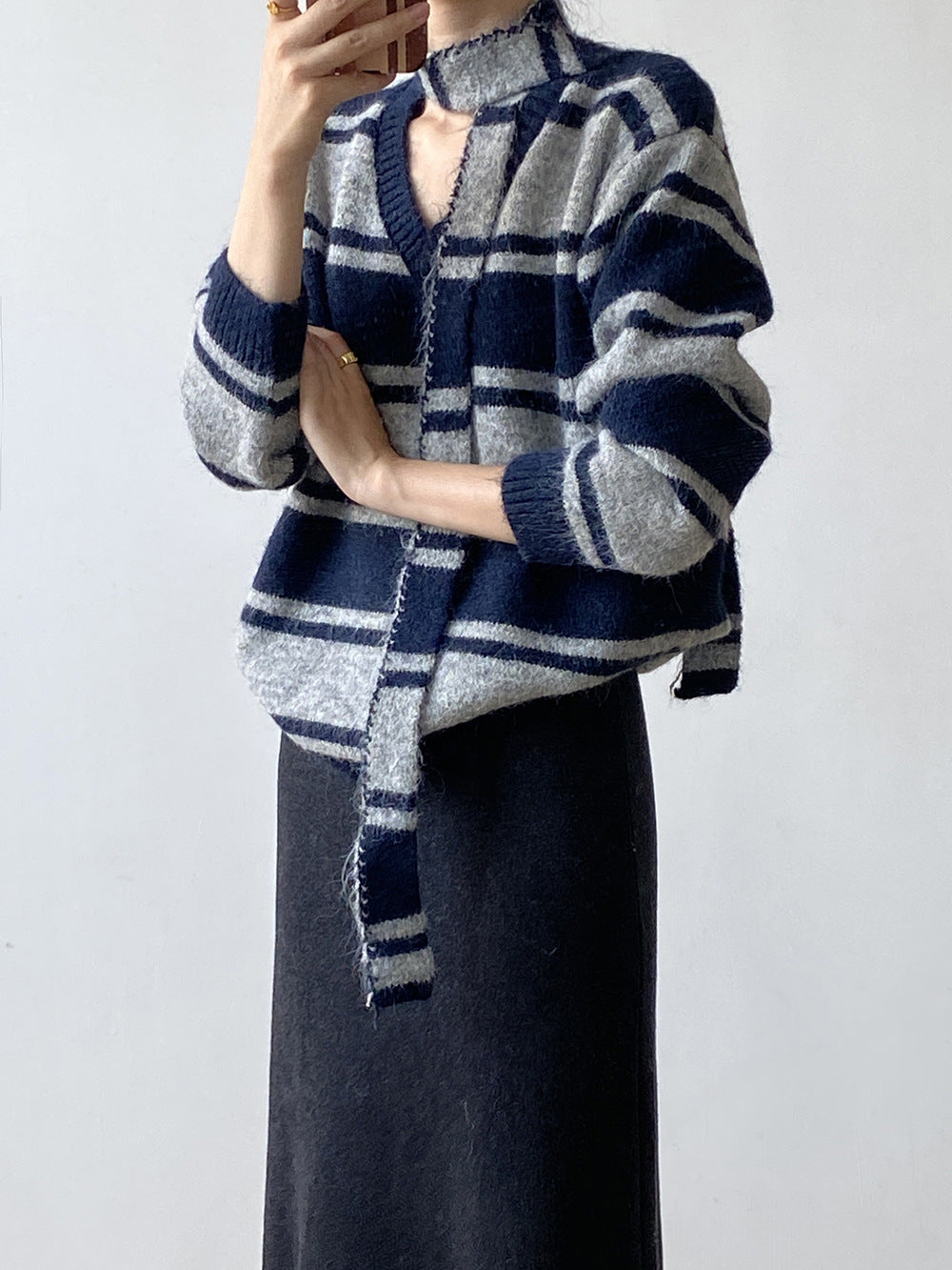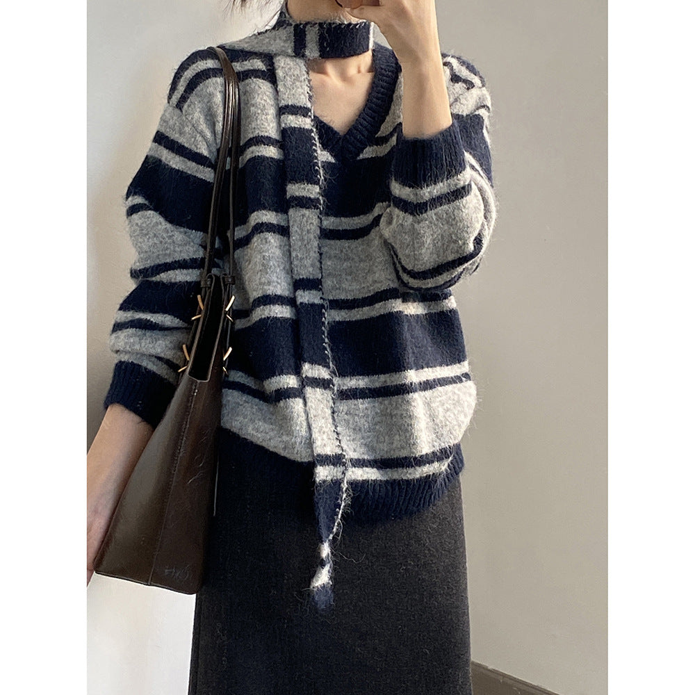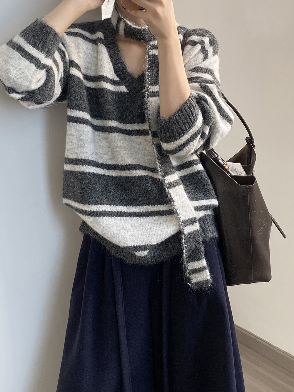 【Y25109】 實拍慵懶條紋V領毛衣+圍巾(含羊毛3%) 251023